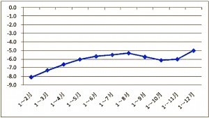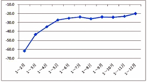 2015年石油和化工行業(yè)利潤月度累計變化情況 (單位:%)