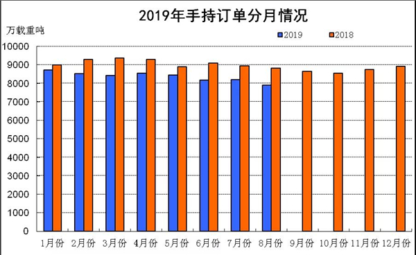 1~8月份,全國造船完工2594萬載重噸,同比增長6.7%。承接新船訂單1572萬載重噸,同比下降37.9%。8月底,手持船舶訂單7909萬載重噸,同比下降10.4%,比2018年底下降11.4%。