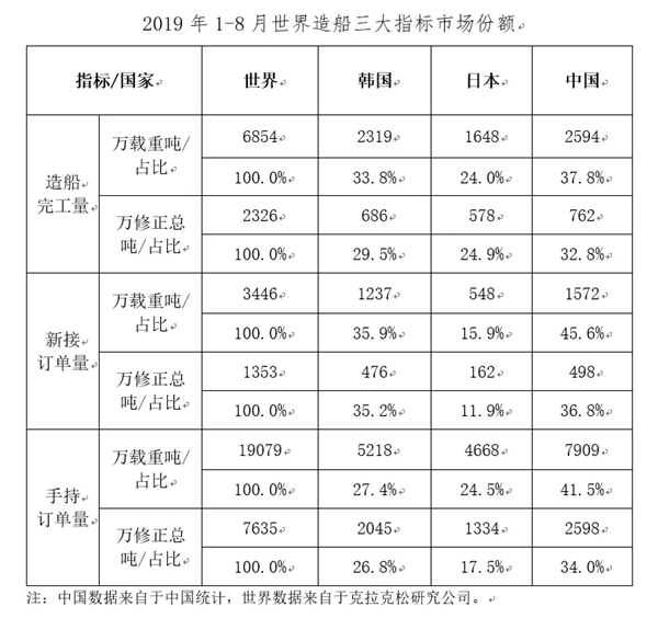 1~8月,我國造船完工量、新接訂單量、手持訂單量分別占世界市場份額的37.8%、45.6%和41.5%。