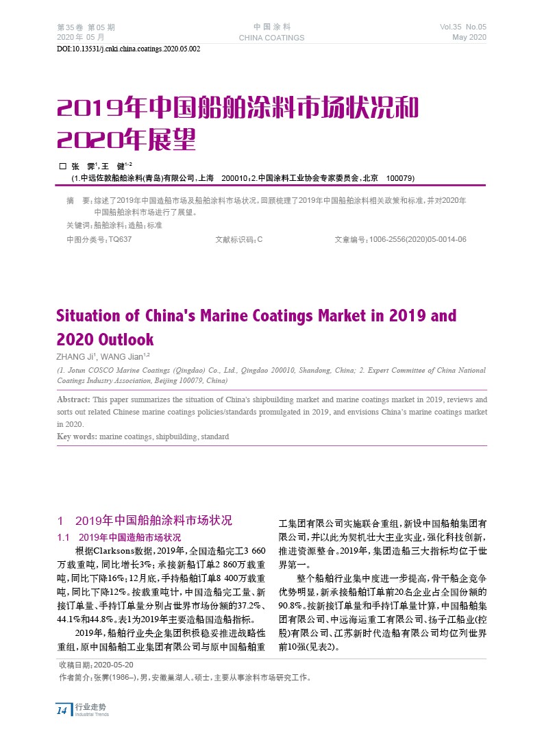 綜述了2019年中國造船市場及船舶涂料市場狀況,回顧梳理了2019年中國船舶涂料相關政策和標準,并對2020年中國船舶涂料市場進行了展望。