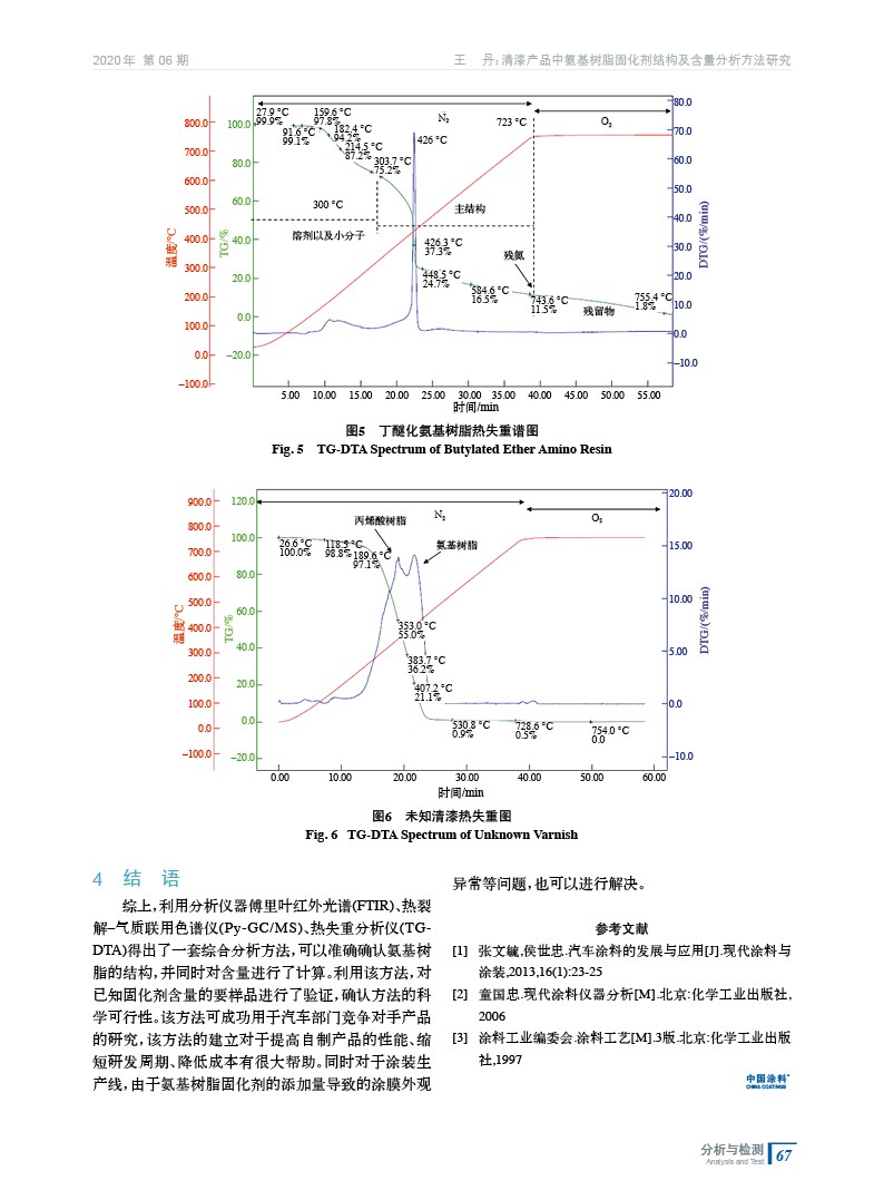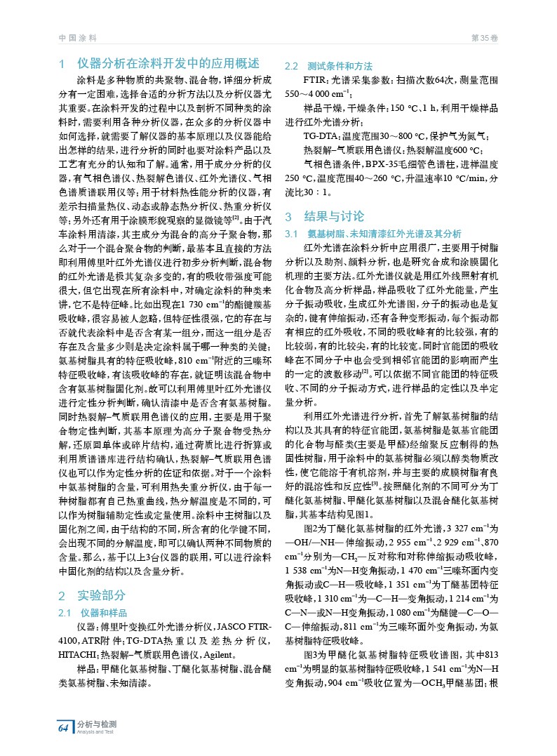 摘要:闡述了清漆產品中氨基樹脂固化劑結構以及含量的分析方法,采用儀器分析綜合手段對清漆中氨基樹脂固化劑進行定性、定量綜合分析,利用紅外光譜以及熱裂解–氣質聯用色譜分析儀對氨基樹脂種類以及結構進行確認,利用熱失重分析儀對氨基樹脂在清漆中含量進行確認,最終能夠實現未知清漆中固化劑含量確認。