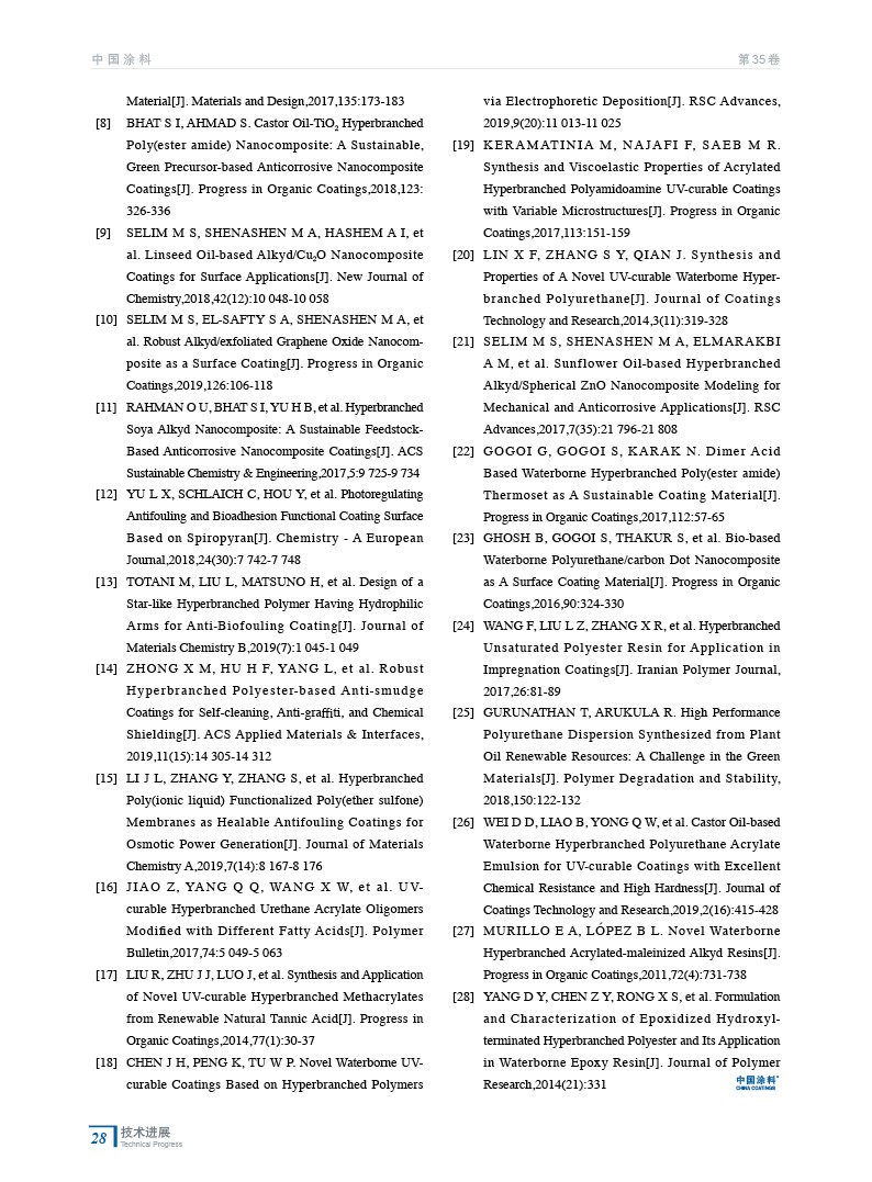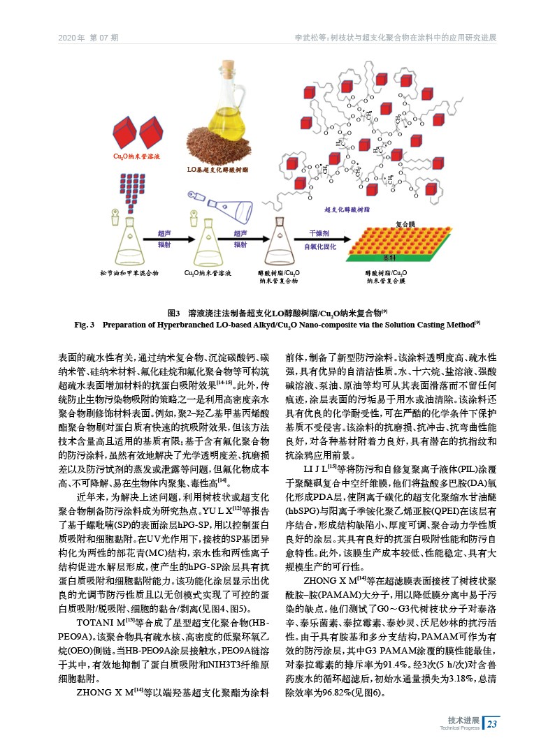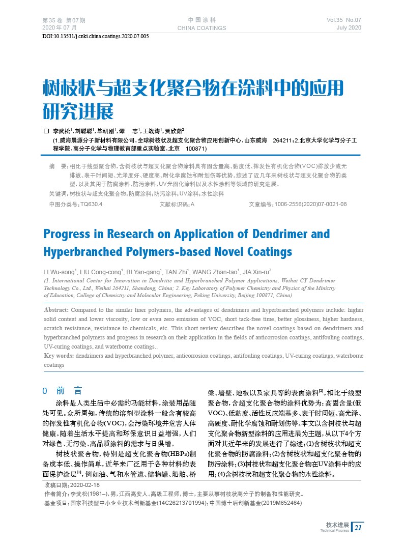 摘要:相比于線型聚合物,含樹枝狀與超支化聚合物涂料具有固含量高、黏度低、揮發性有機化合物(VOC)排放少或無排放、表干時間短、光澤度好、硬度高、耐化學腐蝕和耐劃傷等優勢。綜述了近幾年來樹枝狀與超支化聚合物的類型,以及其用于防腐涂料、防污涂料、UV光固化涂料以及水性涂料等領域的研究進展。