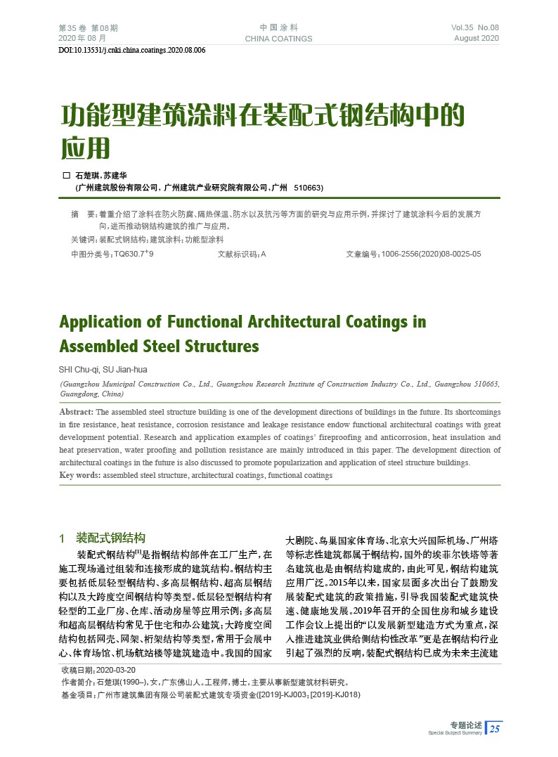 著重介紹了涂料在防火防腐、隔熱保溫、防水以及抗污等方面的研究與應用示例,并探討了建筑涂料今后的發展方向,進而推動鋼結構建筑的推廣與應用。