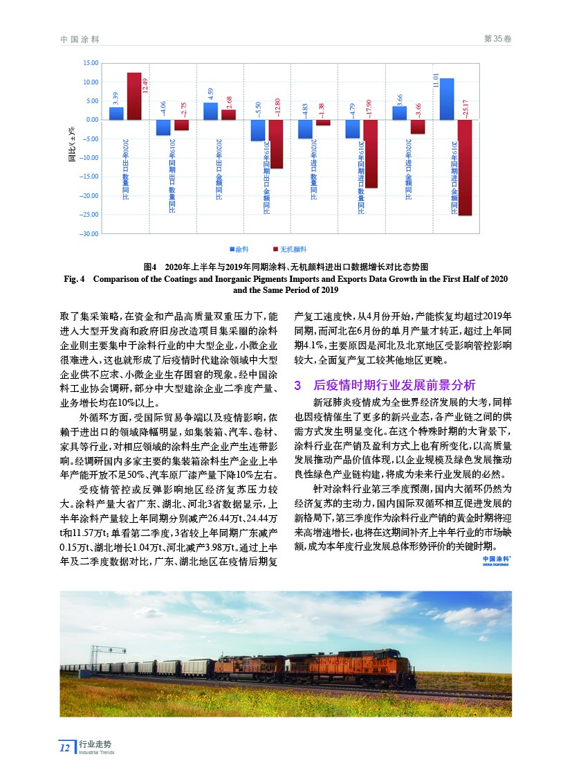 摘要:綜述了在新冠肺炎疫情影響下,我國(guó)涂料行業(yè)2020年上半年與2019年同期數(shù)據(jù)的對(duì)比分析,從產(chǎn)量、主營(yíng)業(yè)務(wù)收入、利潤(rùn)、進(jìn)出口等方面總結(jié)了2020年上半年涂料行業(yè)發(fā)展形勢(shì),介紹了后疫情時(shí)期涂料行業(yè)重點(diǎn)領(lǐng)域發(fā)展概況,并對(duì)未來(lái)行業(yè)發(fā)展進(jìn)行了展望。