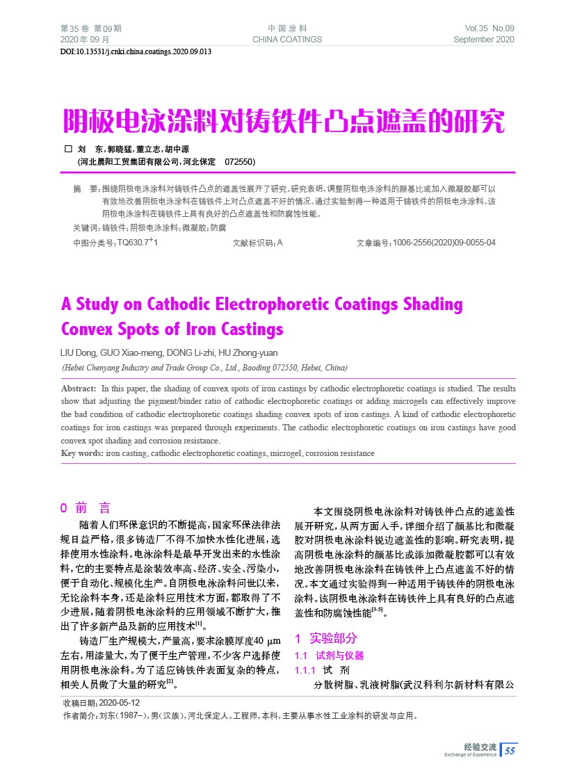 摘要:圍繞陰極電泳涂料對(duì)鑄鐵件凸點(diǎn)的遮蓋性展開(kāi)了研究。研究表明,調(diào)整陰極電泳涂料的顏基比或加入微凝膠都可以有效地改善陰極電泳涂料在鑄鐵件上對(duì)凸點(diǎn)遮蓋不好的情況。通過(guò)實(shí)驗(yàn)制得一種適用于鑄鐵件的陰極電泳涂料。該陰極電泳涂料在鑄鐵件上具有良好的凸點(diǎn)遮蓋性和防腐蝕性能。