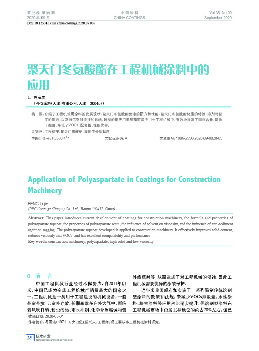 介紹了工程機械用涂料的發展現狀,聚天門冬氨酸酯面漆的配方和性能,聚天門冬氨酸酯樹脂的特性,溶劑對黏度的影響,以及防沉劑對流掛的影響。研制的聚天門氨酸酯面漆應用于工程機械中,有效地提高了固體含量,降低了黏度,降低了VOCs,配套性、性能優異。