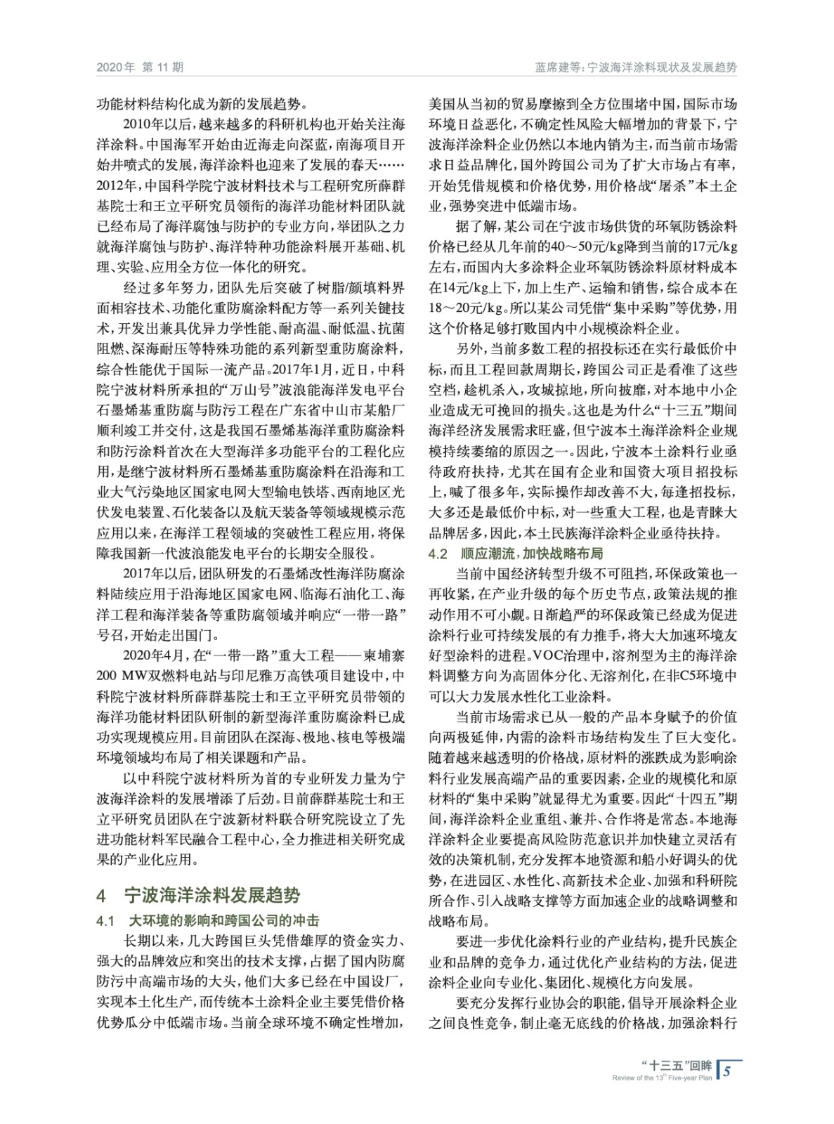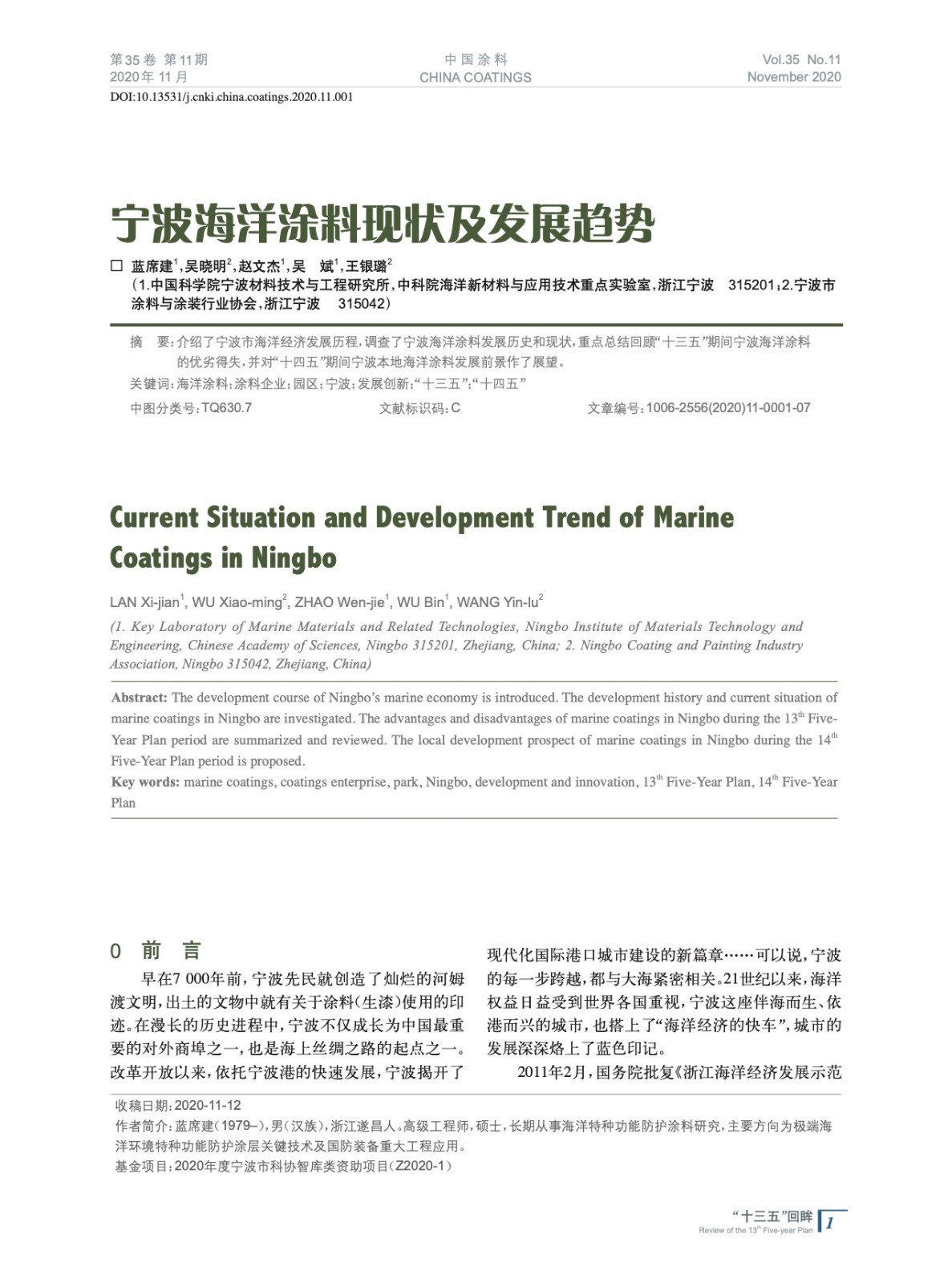 介紹了寧波市海洋經濟發展歷程,調查了寧波海洋涂料發展歷史和現狀,重點總結回顧“十三五”期間寧波海洋涂料的優劣得失,并對“十四五”期間寧波本地海洋涂料發展前景作了展望。