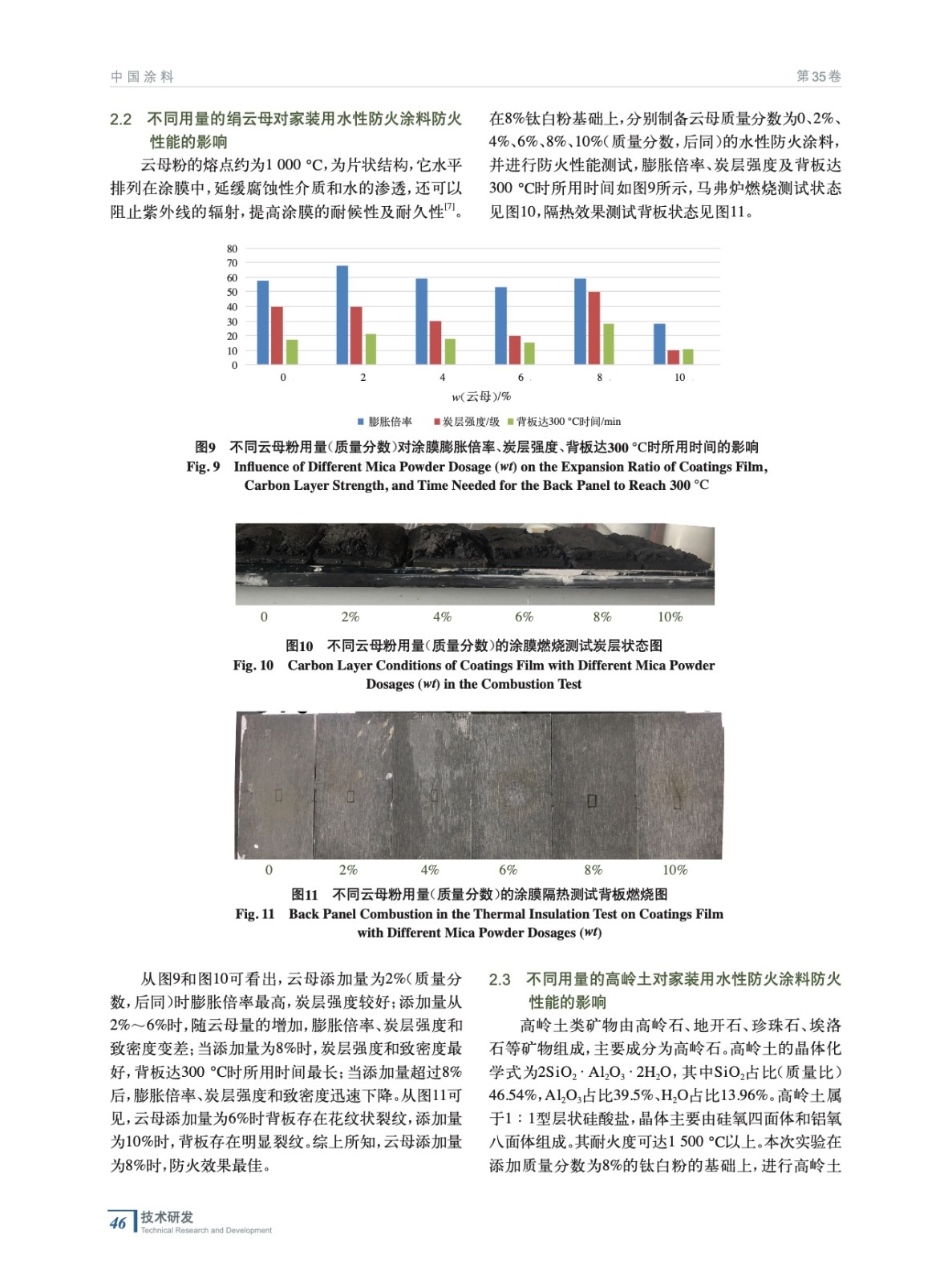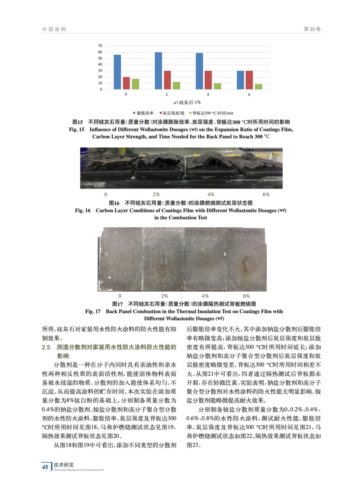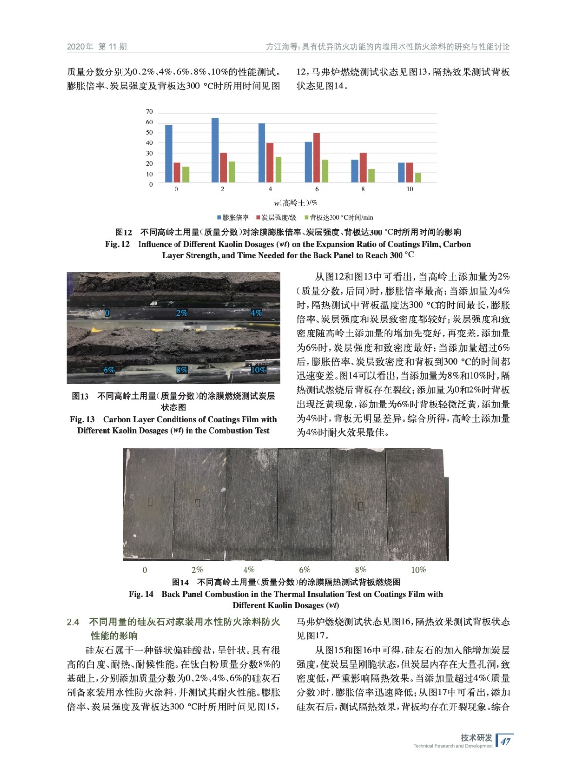 摘要:以自制三合一阻燃粉料為基礎(chǔ),VAE乳液為成膜物,分別制備了不同類型及不同梯度的顏填料和助劑的家裝用水性防火涂料,研究結(jié)果表明:添加8%的鈦白粉、8%的云母和4%的高嶺土能提高家裝用防火涂料的耐火性能;0.6%的銨鹽分散劑能略微提高其防火性能;鈉鹽分散劑、高分子聚合型分散劑、消泡劑和增稠劑對家裝用防火涂料的防火性能無明顯影響;硅灰石的加入會降低家裝用水性防火涂料的防火性能。