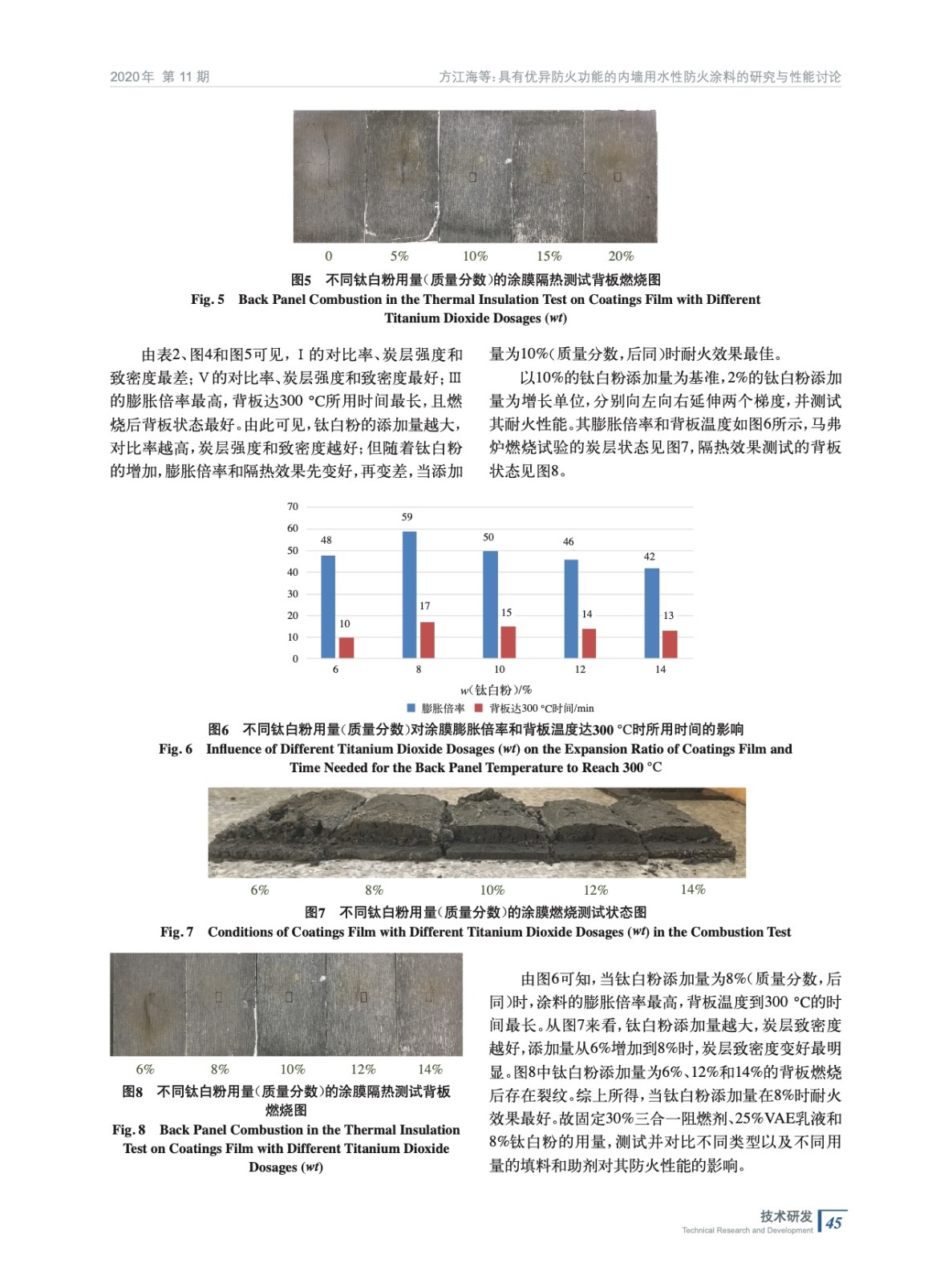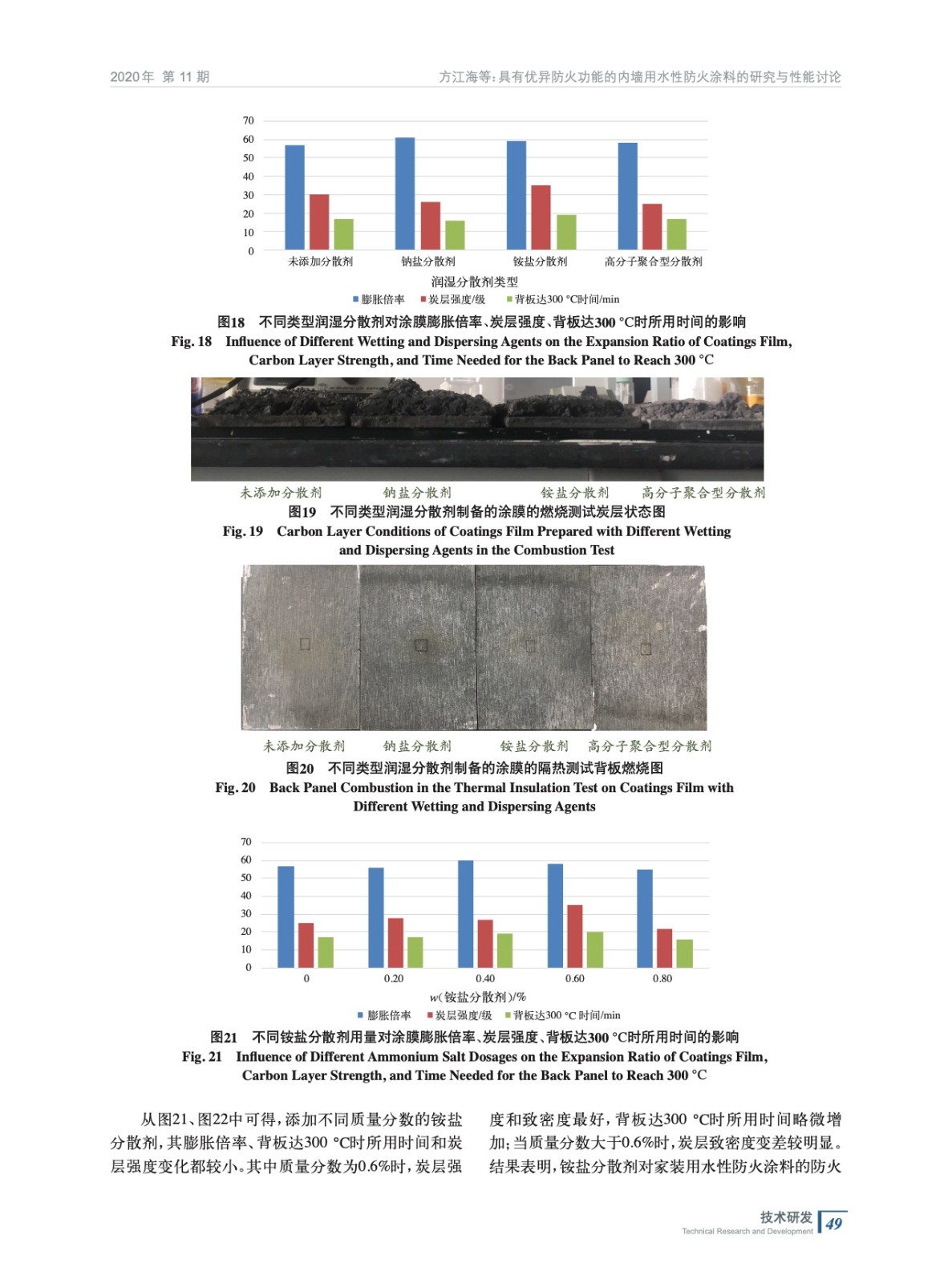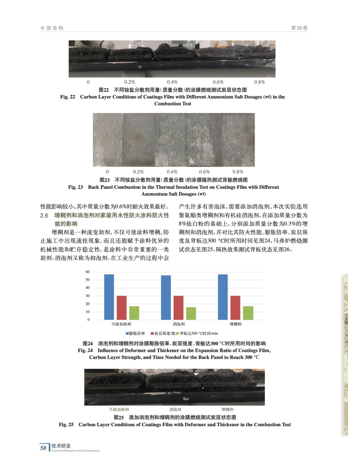 摘要:以自制三合一阻燃粉料為基礎(chǔ),VAE乳液為成膜物,分別制備了不同類型及不同梯度的顏填料和助劑的家裝用水性防火涂料,研究結(jié)果表明:添加8%的鈦白粉、8%的云母和4%的高嶺土能提高家裝用防火涂料的耐火性能;0.6%的銨鹽分散劑能略微提高其防火性能;鈉鹽分散劑、高分子聚合型分散劑、消泡劑和增稠劑對家裝用防火涂料的防火性能無明顯影響;硅灰石的加入會降低家裝用水性防火涂料的防火性能。