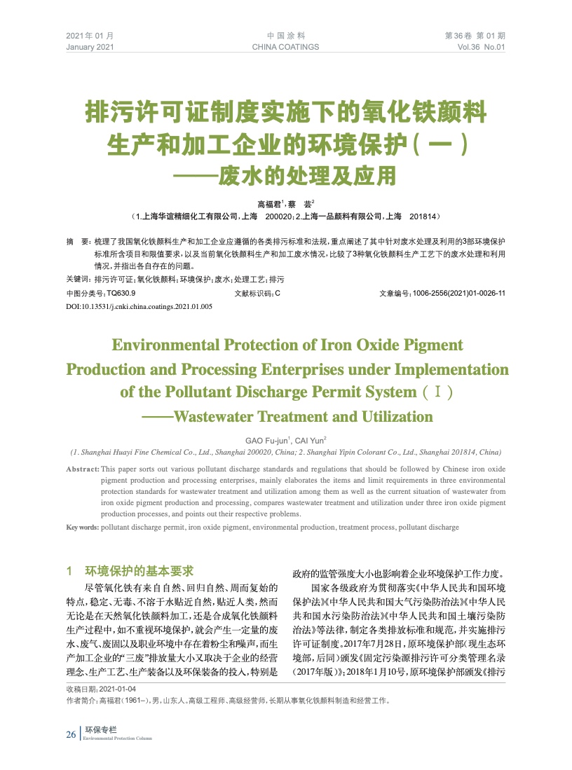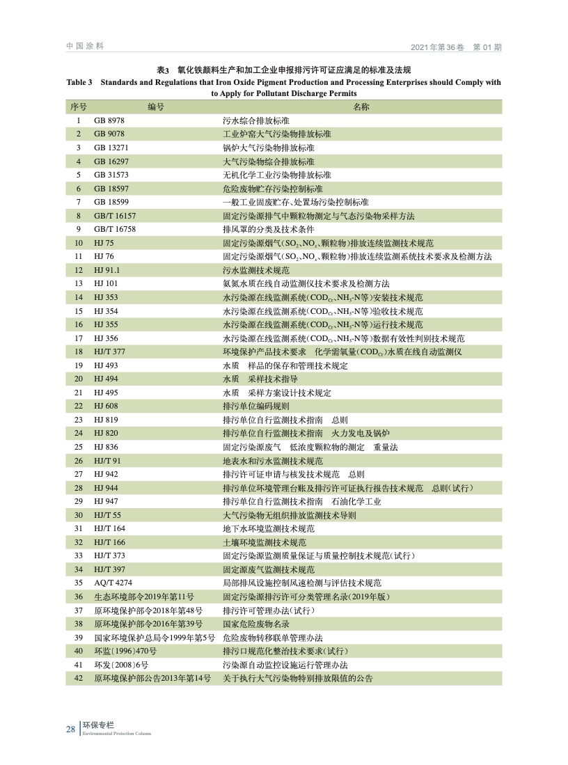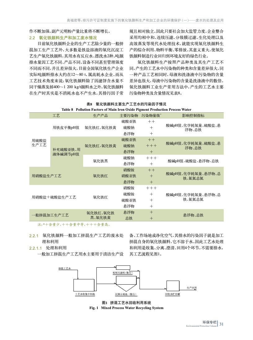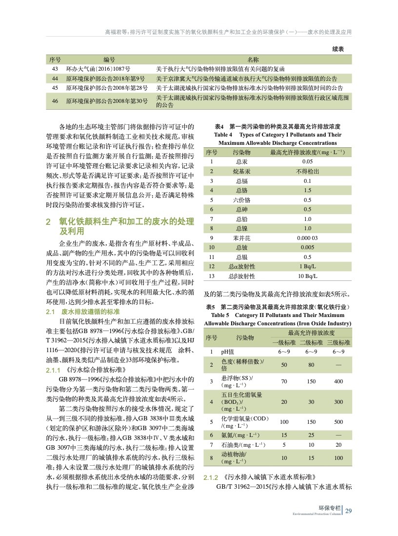 摘要:梳理了我國氧化鐵顏料生產和加工企業應遵循的各類排污標準和法規,重點闡述了其中針對廢水處理及利用的3部環境保護標準所含項目和限值要求,以及當前氧化鐵顏料生產和加工廢水情況,比較了3種氧化鐵顏料生產工藝下的廢水處理和利用情況,并指出各自存在的問題。
