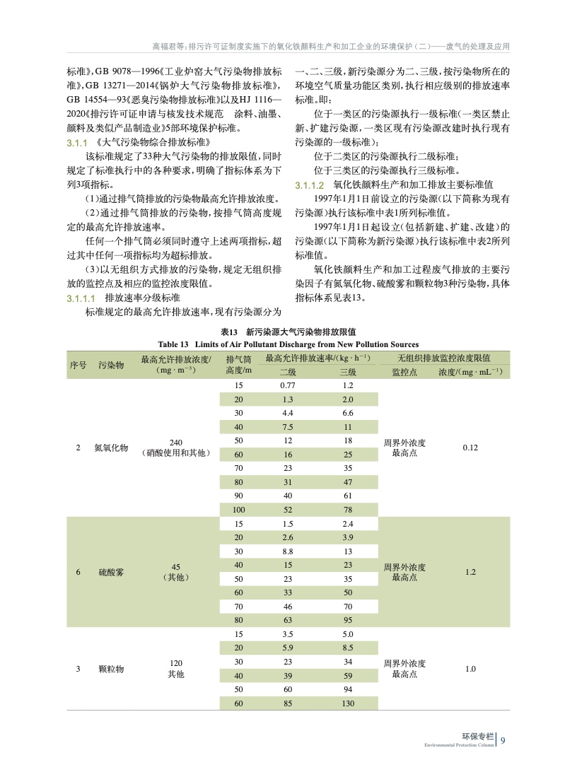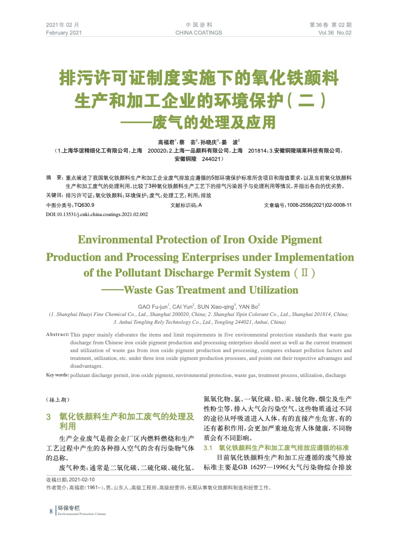 摘要:重點闡述了我國氧化鐵顏料生產和加工企業廢氣排放應遵循的5部環境保護標準所含項目和限值要求,以及當前氧化鐵顏料生產和加工廢氣的處理利用,比較了3種氧化鐵顏料生產工藝下的排氣污染因子與處理利用等情況,并指出各自的優劣勢。