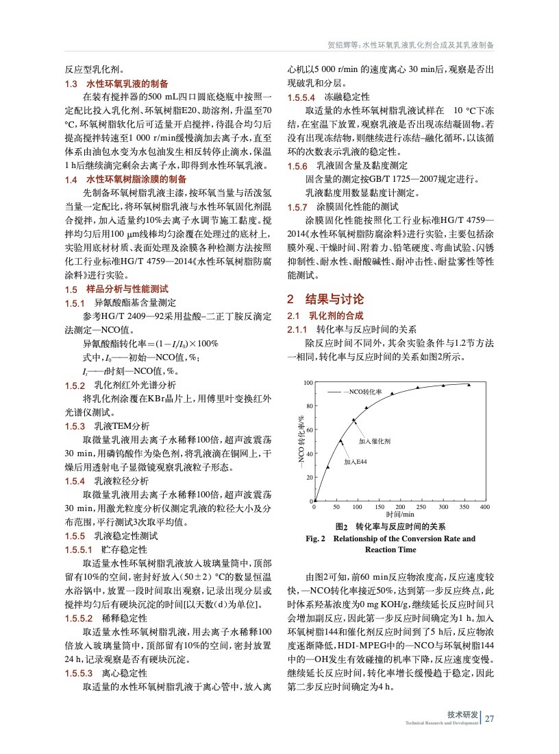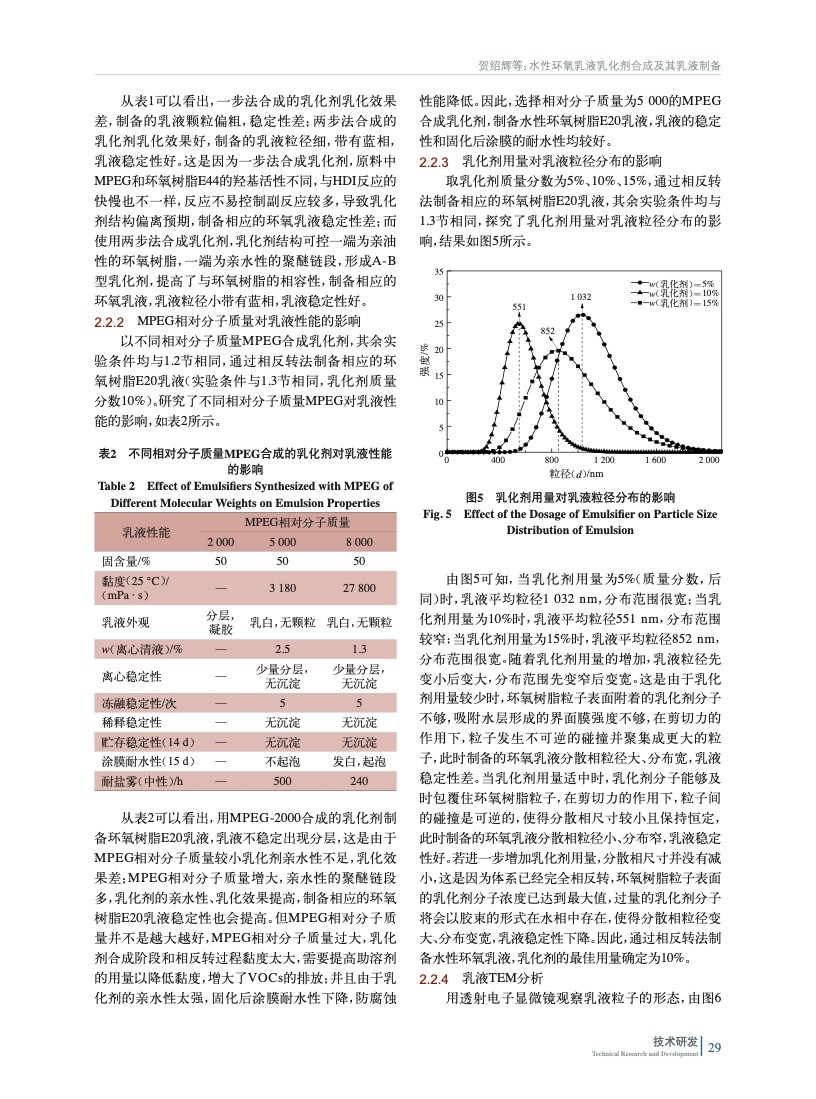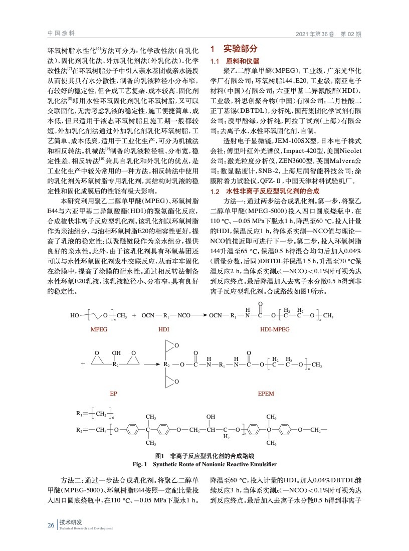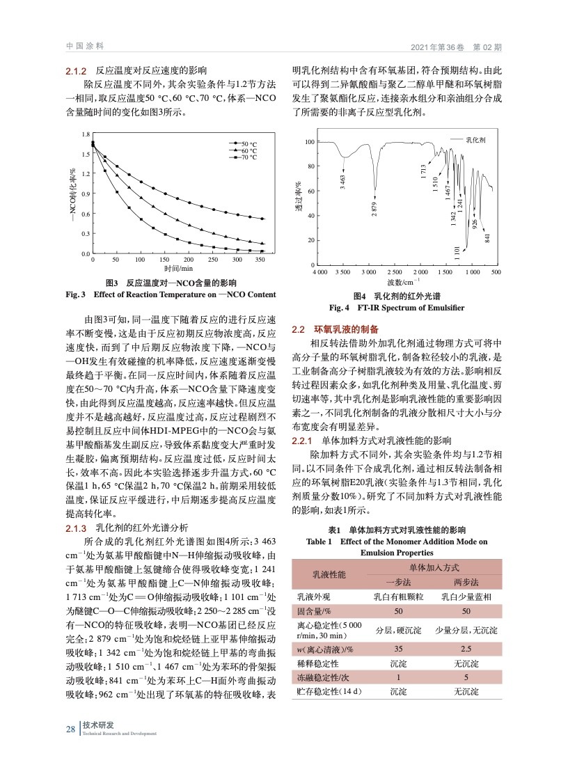摘要:以聚乙二醇單甲醚、六亞甲基二異氰酸酯、環氧樹脂為原料合成了一種非離子反應型環氧乳化劑,并通過相反轉法制備水性環氧樹脂E20乳液。對乳化劑結構和乳液形貌及其粒徑分布進行表征。確定了乳化劑采用兩步法合成,反應溫度為逐步升溫模式,MPEG相對分子質量為5 000,乳化劑質量分數為10%,所制得的水性環氧樹脂E20乳液平均粒徑為551 nm,穩定性良好,且制得的乳液涂膜固化物具有優良的耐水防腐蝕性能。