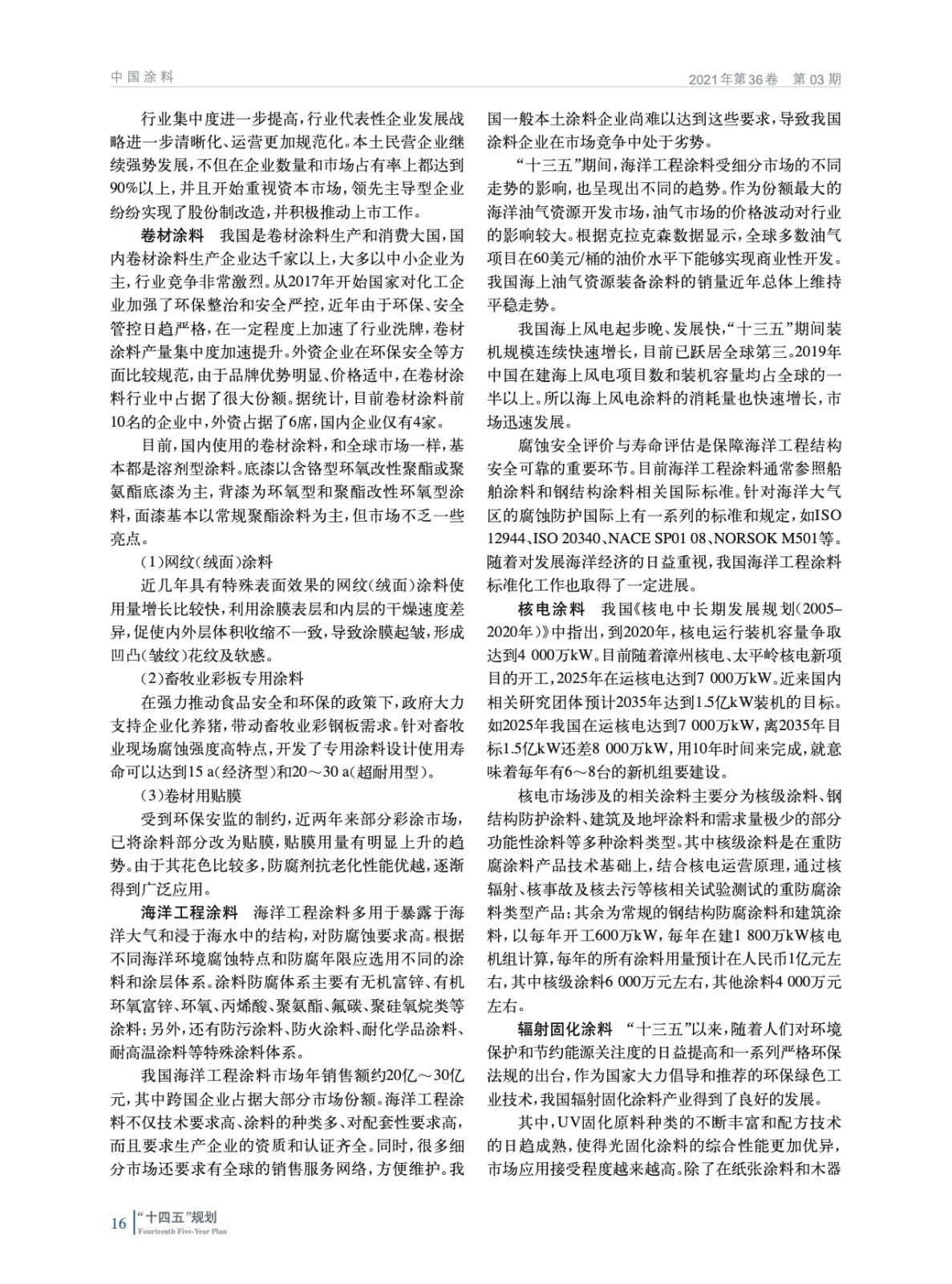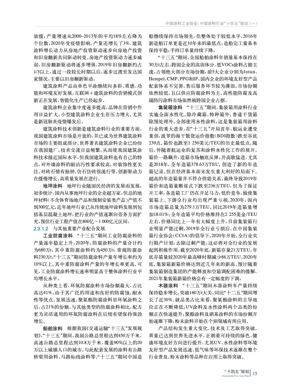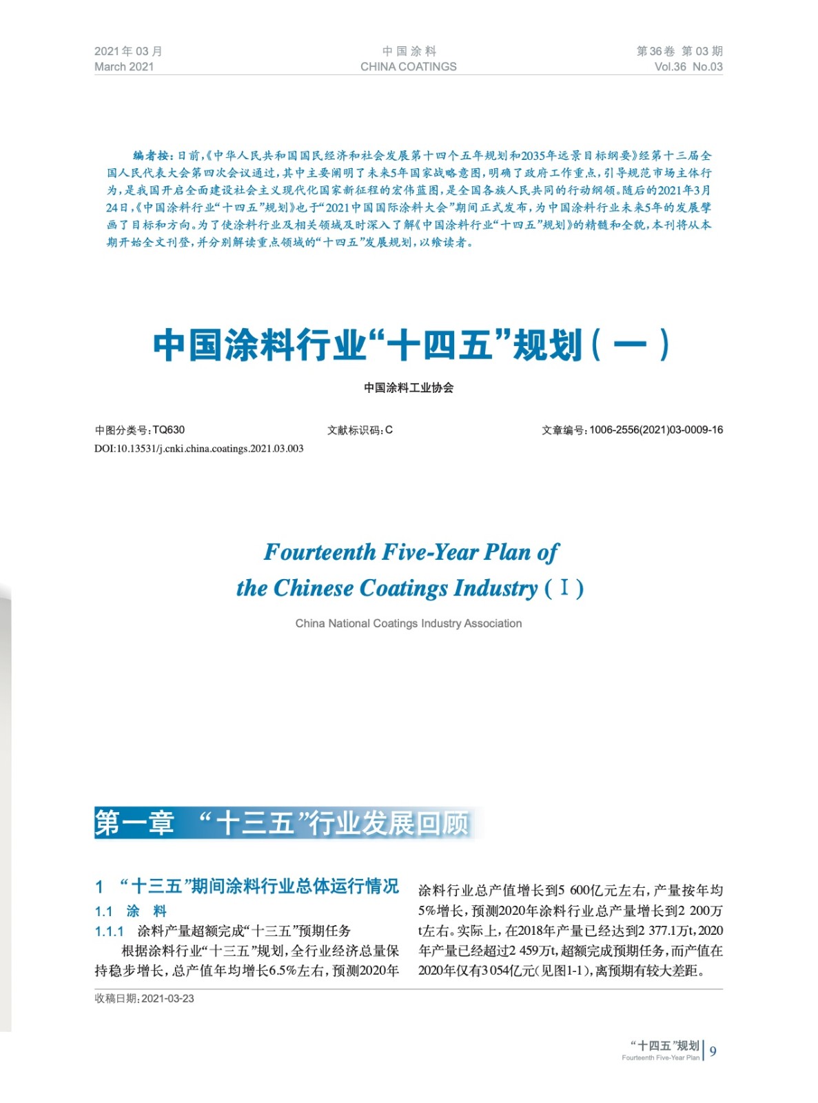 摘要:編者按:2021年3月24日,《中國涂料行業(yè)“十四五”規(guī)劃》于“2021中國國際涂料大會”期間正式發(fā)布,為中國涂料行業(yè)未來5年的發(fā)展擘畫了目標和方向。為了使涂料行業(yè)及相關領域及時深入了解《中國涂料行業(yè)“十四五”規(guī)劃》的精髓和全貌,本刊將從本期開始全文刊登,并分別解讀重點領域的“十四五”發(fā)展規(guī)劃,以饗讀者。