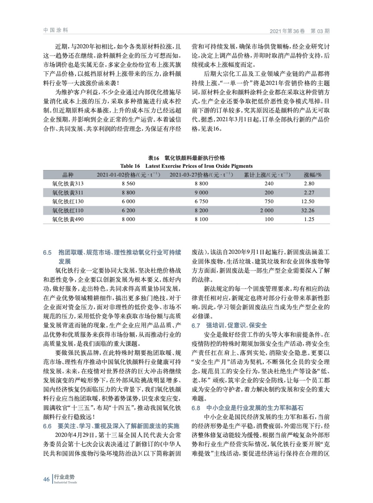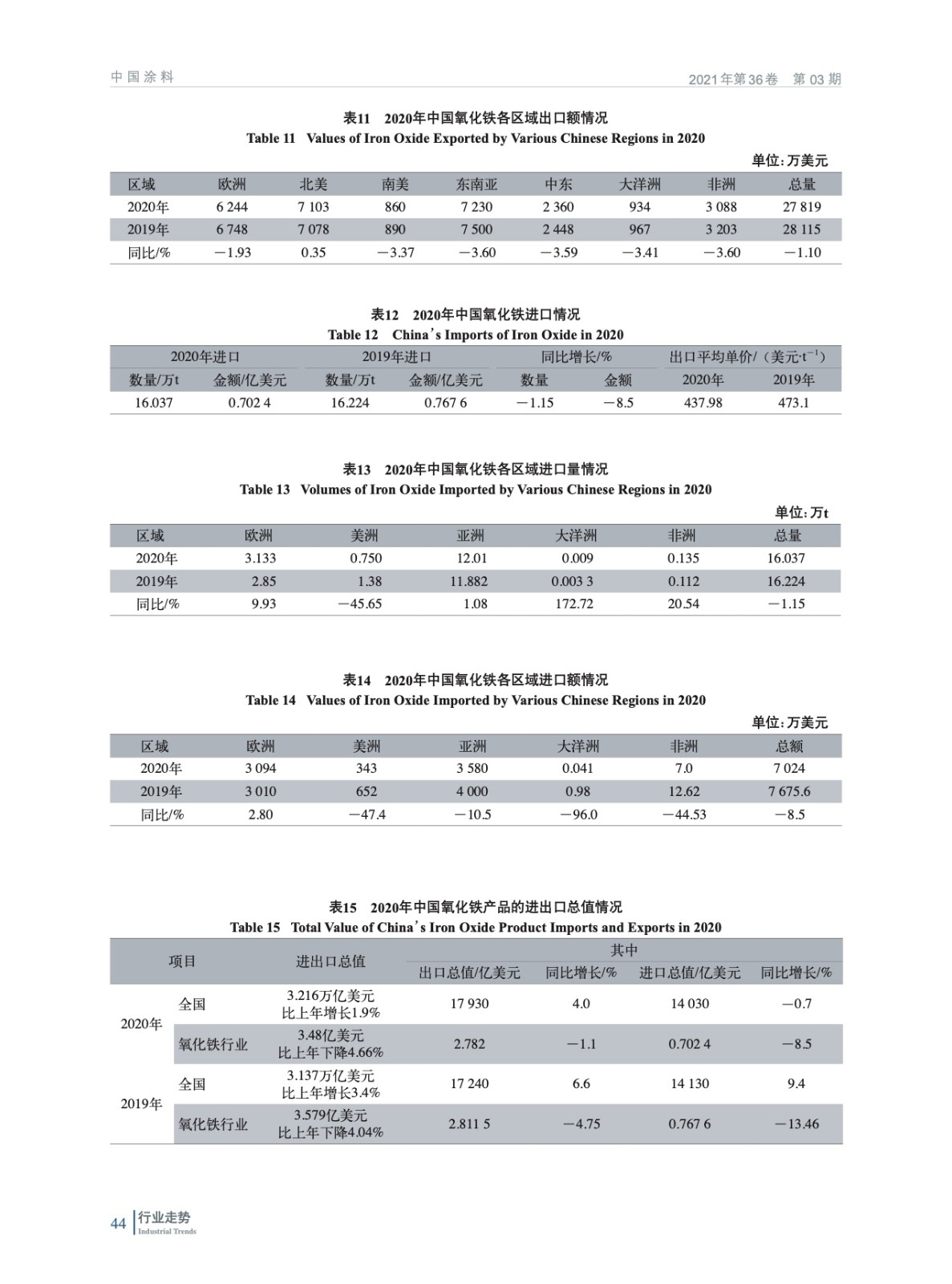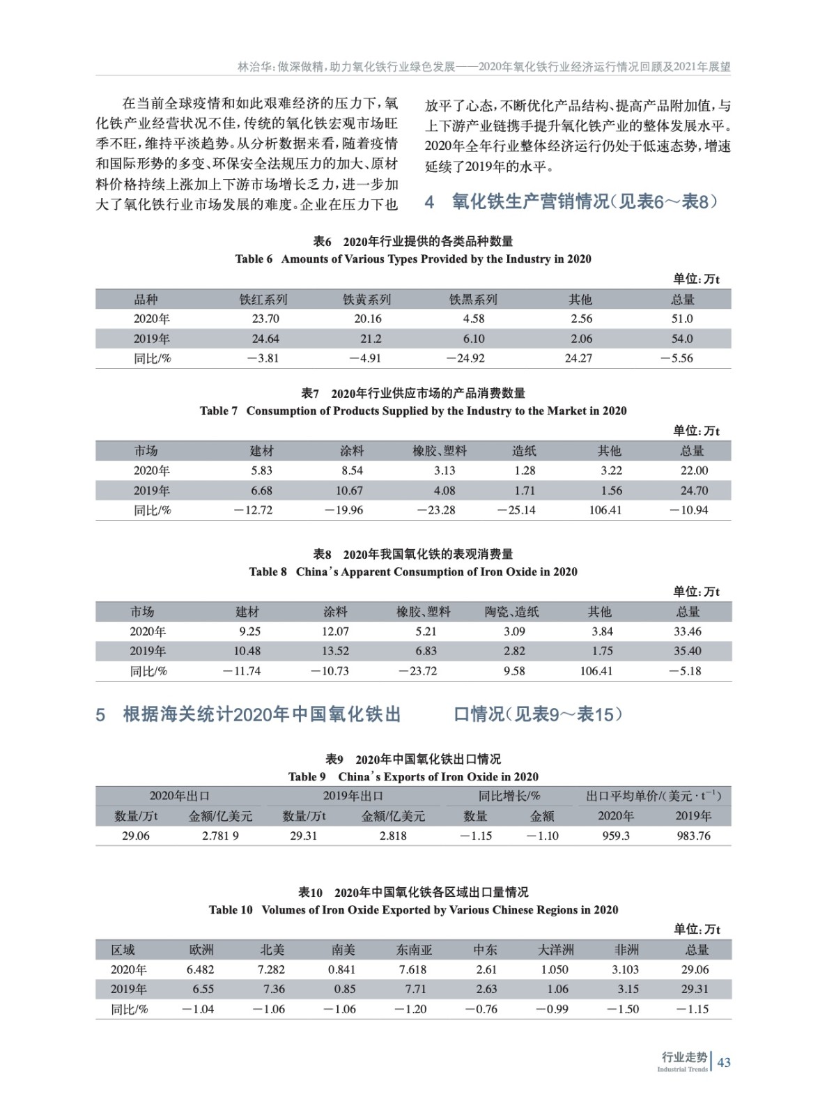 摘要:綜述了2020年在新冠肺炎疫情影響下中國氧化鐵行業所處的經濟環境,經濟指標完成情況,并對行業進出口數據進行了分析,展望了氧化鐵行業2021年發展方向,陳述了其中可能存在的問題、不足,并指出了行業綠色發展工作方向。