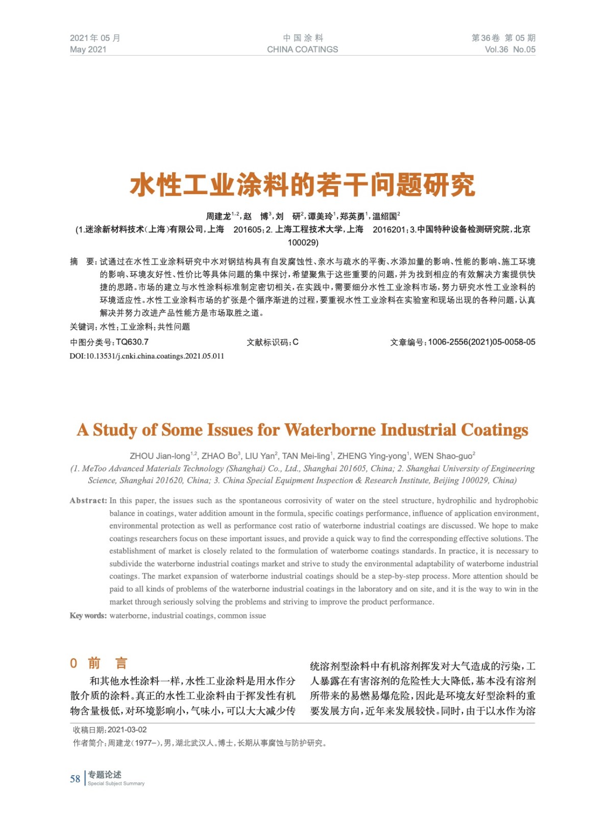 試通過在水性工業涂料研究中水對鋼結構具有自發腐蝕性、親水與疏水的平衡、水添加量的影響、性能的影響、施工環境的影響、環境友好性、性價比等具體問題的集中探討,希望聚焦于這些重要的問題,并為找到相應的有效解決方案提供快捷的思路。