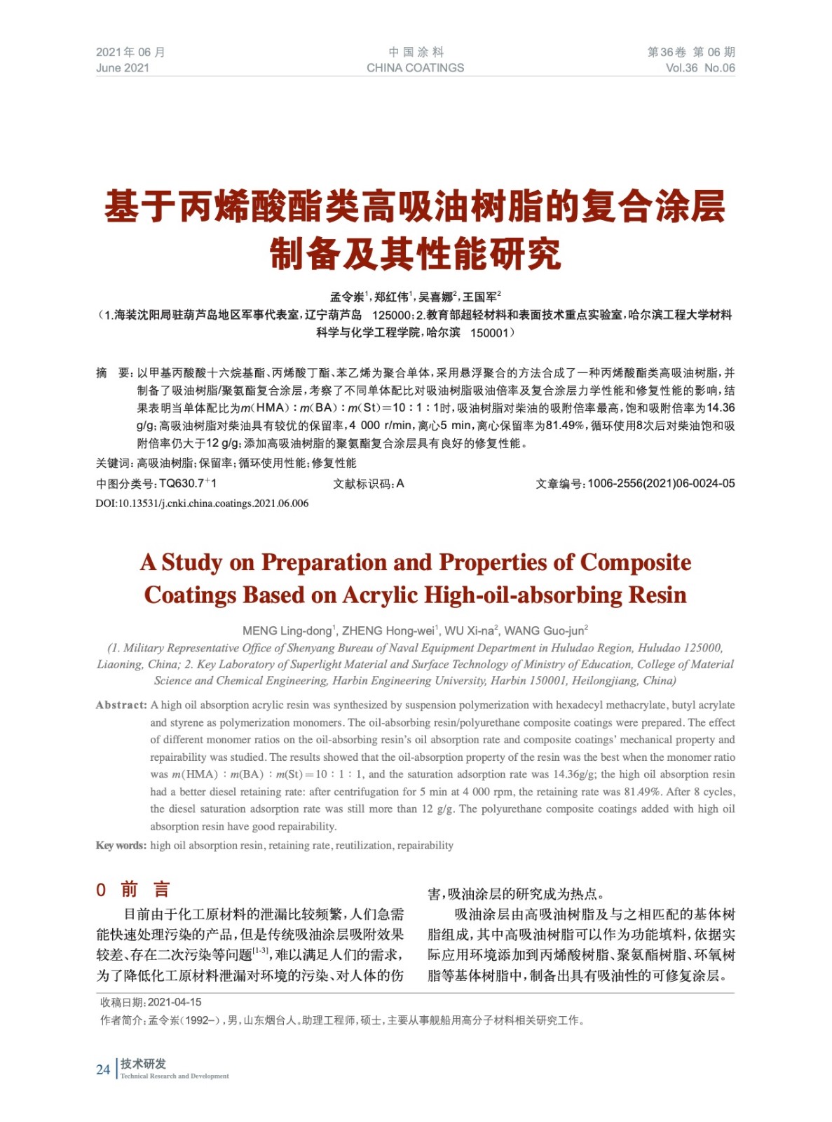 本文系作者@孟令崠,鄭紅偉,吳喜娜,王國軍 授權中國涂料網發表,并經中國涂料網編輯,未經允許不得轉載,如需轉載請聯系chinacoatingnet@vip.163.com