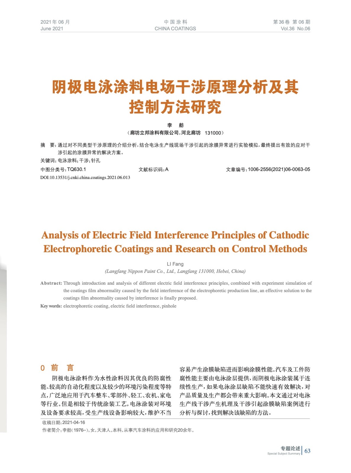 陰極電泳涂料電場(chǎng)干涉原理分析及其控制方法研究