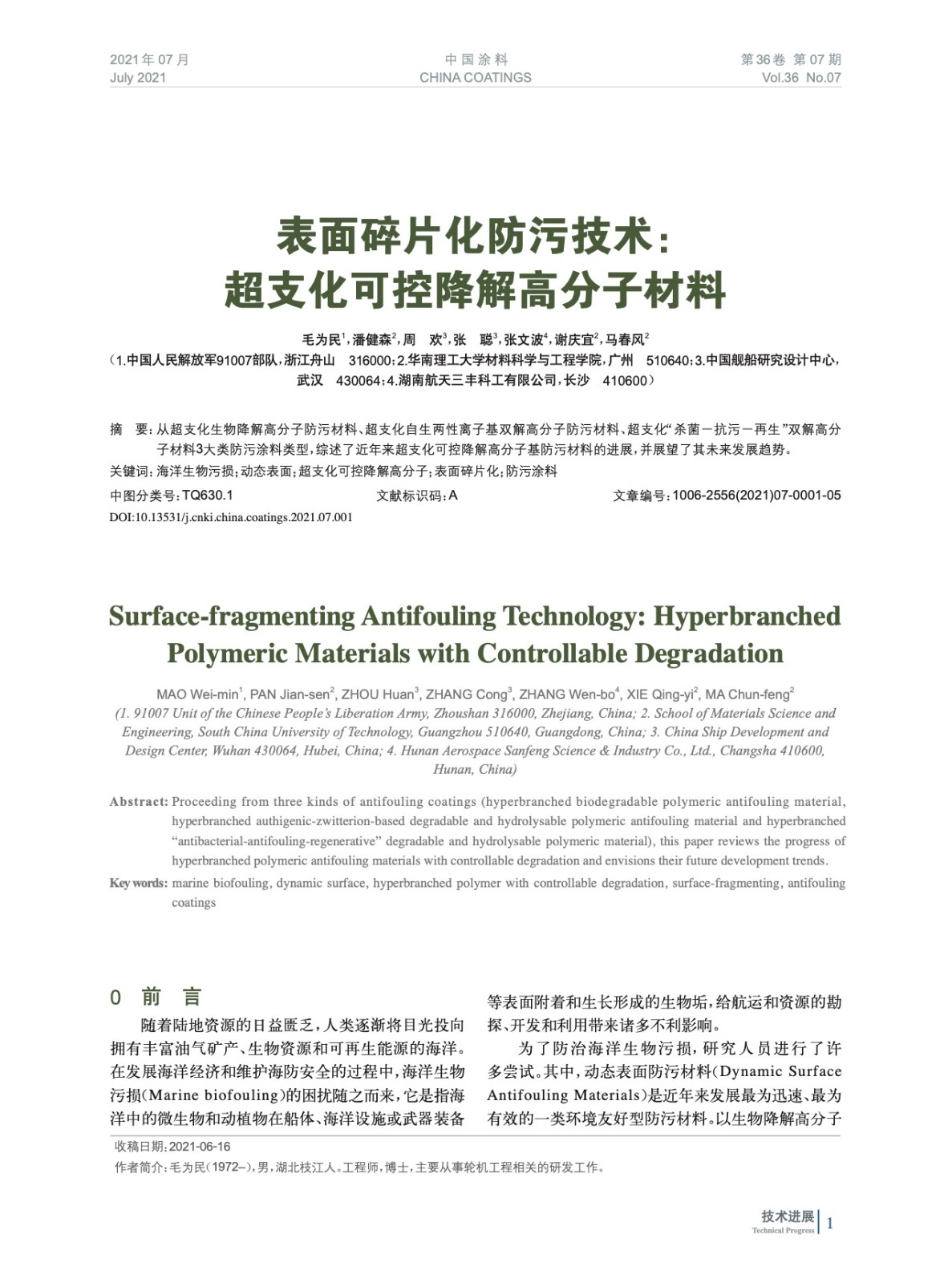 摘要:從超支化生物降解高分子防污材料、超支化自生兩性離子基雙解高分子防污材料、超支化“殺菌-抗污-再生”雙解高分子材料3大類(lèi)防污涂料類(lèi)型,綜述了近年來(lái)超支化可控降解高分子基防污材料的進(jìn)展,并展望了其未來(lái)發(fā)展趨勢(shì)。