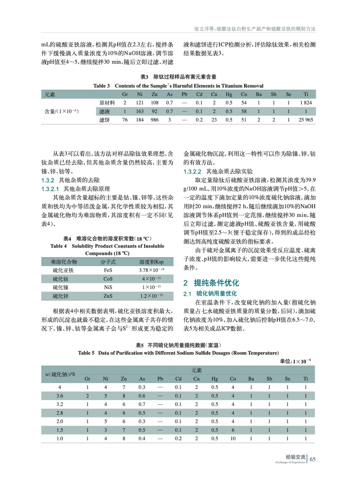 摘要:探索了一種鈦白粉行業(yè)副產(chǎn)品硫酸亞鐵的精制提純工藝方法,以較低的成本把鈦白粉行業(yè)副產(chǎn)品硫酸亞鐵,提純達(dá)到醫(yī)藥用硫酸亞鐵的技術(shù)標(biāo)準(zhǔn),盡可能實(shí)現(xiàn)資源的循環(huán)利用。結(jié)果表明:在絡(luò)合劑硫化鈉用量控制在1%(指硫化鈉占七水硫酸亞鐵的質(zhì)量分?jǐn)?shù)),反應(yīng)溫度控制在40 ℃左右,硫化鈉加入后體系pH值控制在6.5~7.0的條件下,精制產(chǎn)品達(dá)到高純度硫酸亞鐵的要求,且收率達(dá)到90%以上。