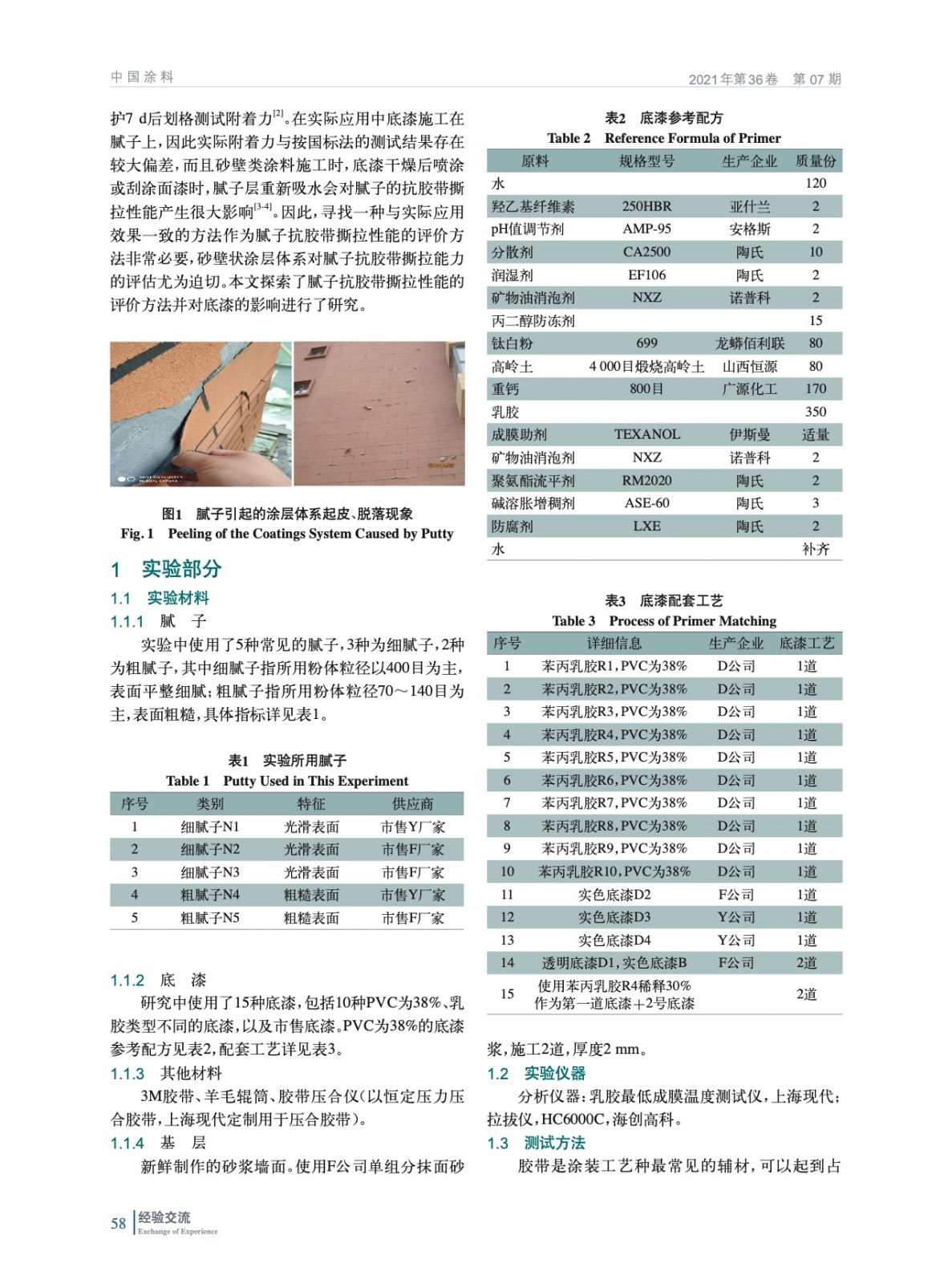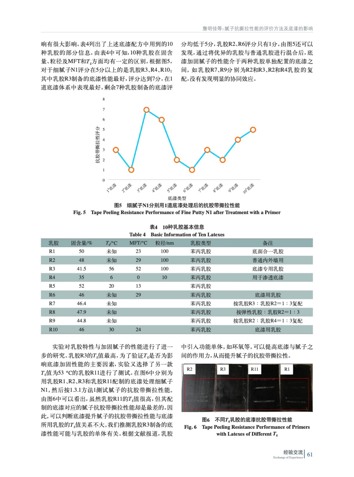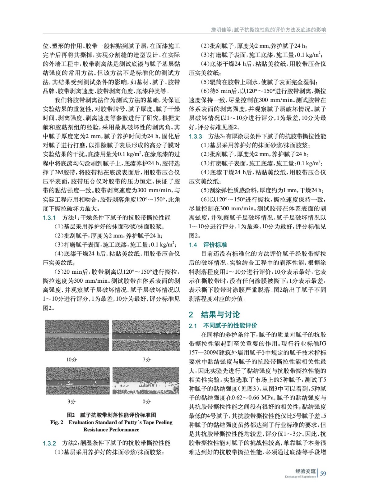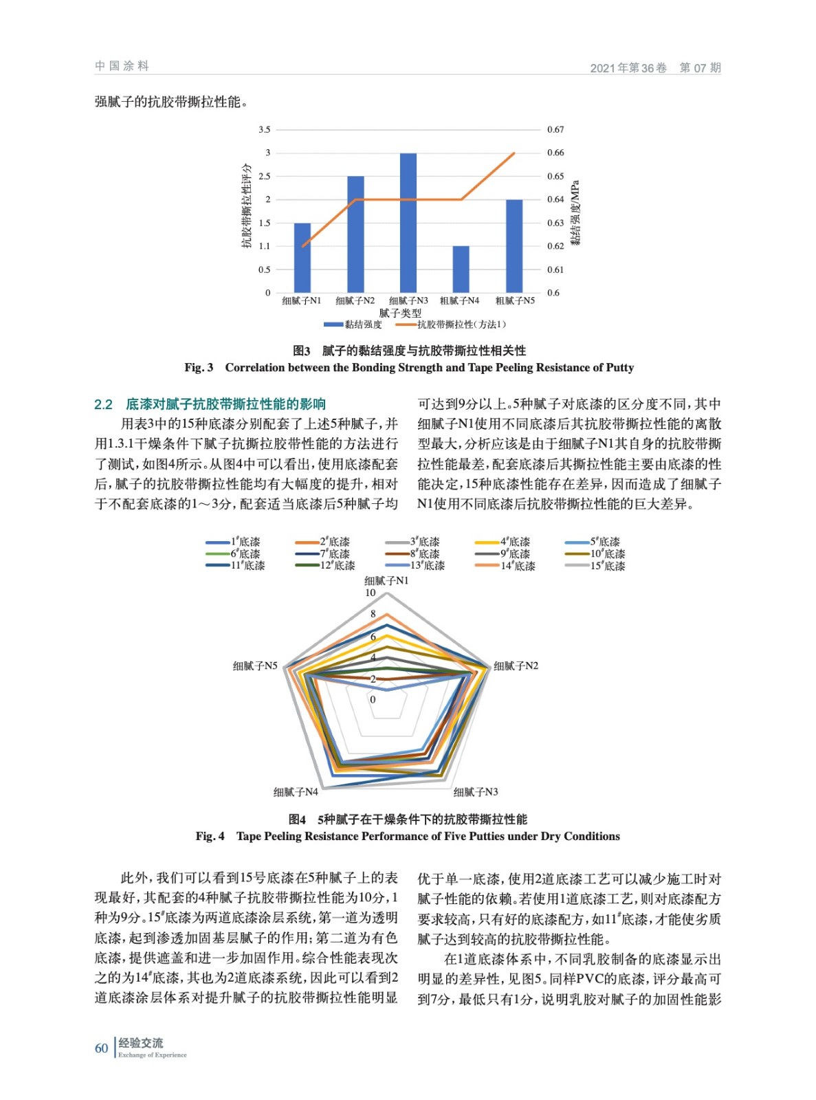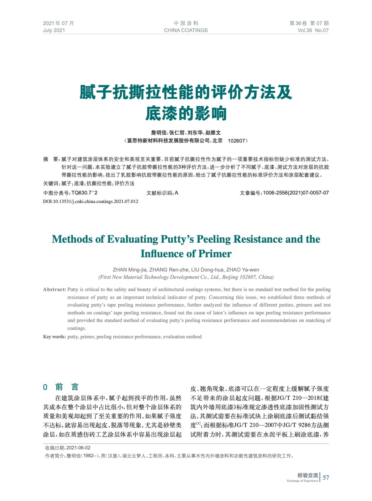 摘要:膩子對建筑涂層體系的安全和美觀至關重要,目前膩子抗撕拉性作為膩子的一項重要技術指標但缺少標準的測試方法。針對這一問題,本實驗建立了膩子抗膠帶撕拉性能的3種評價方法,進一步分析了不同膩子、底漆、測試方法對涂層的抗膠帶撕拉性能的影響,找出了乳膠影響抗膠帶撕拉性能的原因,給出了膩子抗撕拉性能的標準評價方法和涂層配套建議。