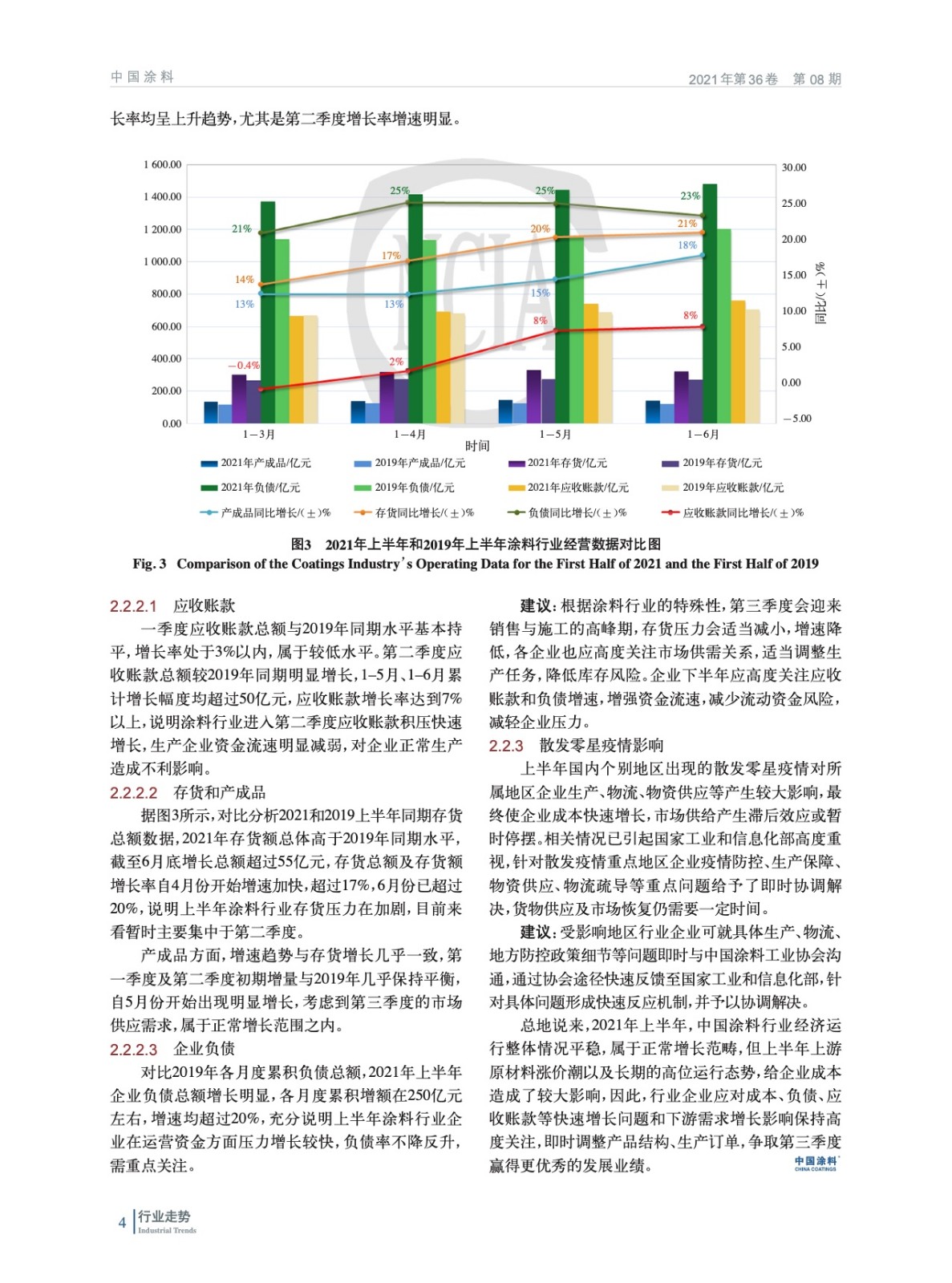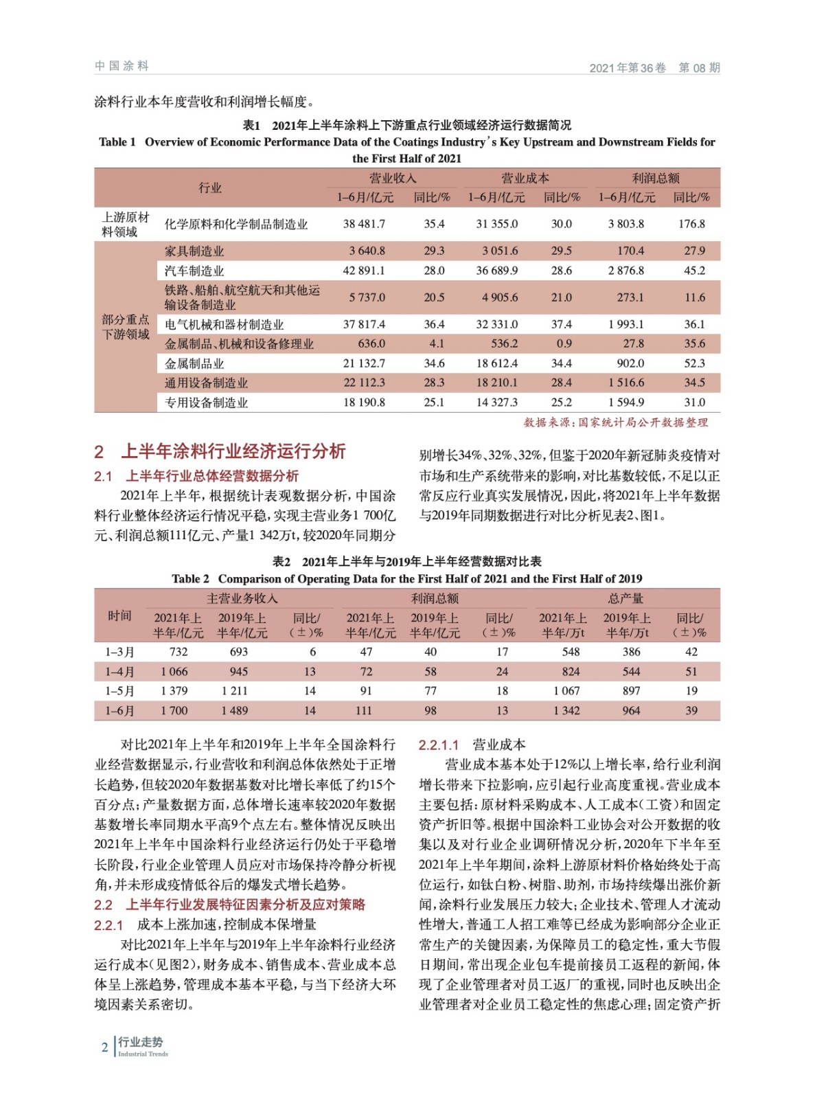 綜述了在國外新冠肺炎疫情依然肆虐、國內疫情基本平穩的大環境下,2021年上半年涂料行業上下游領域發展趨勢,整理了涂料行業上半年總體經營數據,對上半年行業發展特征因素進行了分析并給出了應對策略。