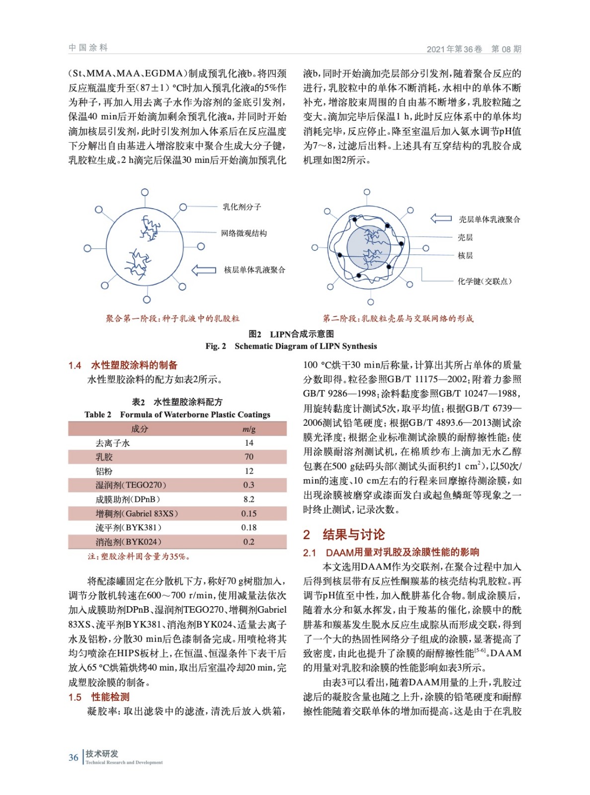 摘要:采用了半連續(xù)種子乳液聚合工藝制備了一種具有乳膠互穿聚合物網(wǎng)絡結構的核殼型丙烯酸酯乳膠,使用該乳膠配制的塑膠涂料在高抗沖擊性聚苯乙烯板材上具有優(yōu)異附著力和耐乙醇擦拭性能。由實驗可知,當核層交聯(lián)單體雙丙酮丙烯酰胺用量為3%,殼層交聯(lián)單體二甲基丙烯酸乙二醇酯用量為2%,乳化劑用量2%,選擇甲基丙烯酸作為極性單體并且用量為3%時,所制得的乳膠性能良好。