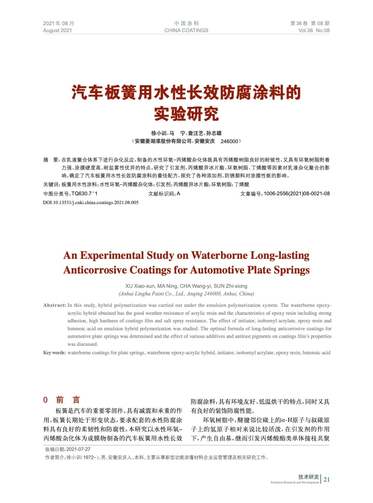 本文系作者@徐小訓,馬 寧,查汪藝,孫志雄 授權中國涂料網發表,并經中國涂料網編輯,未經允許不得轉載,如需轉載請聯系chinacoatingnet@vip.163.com