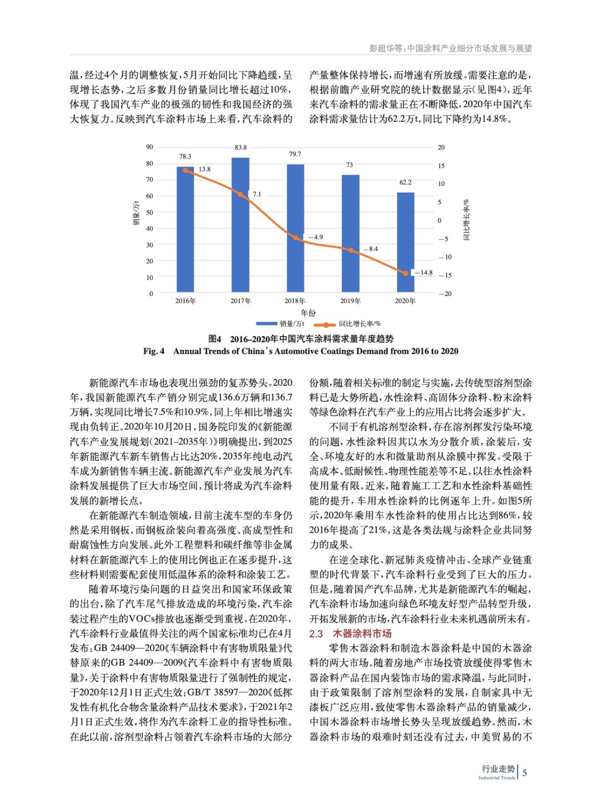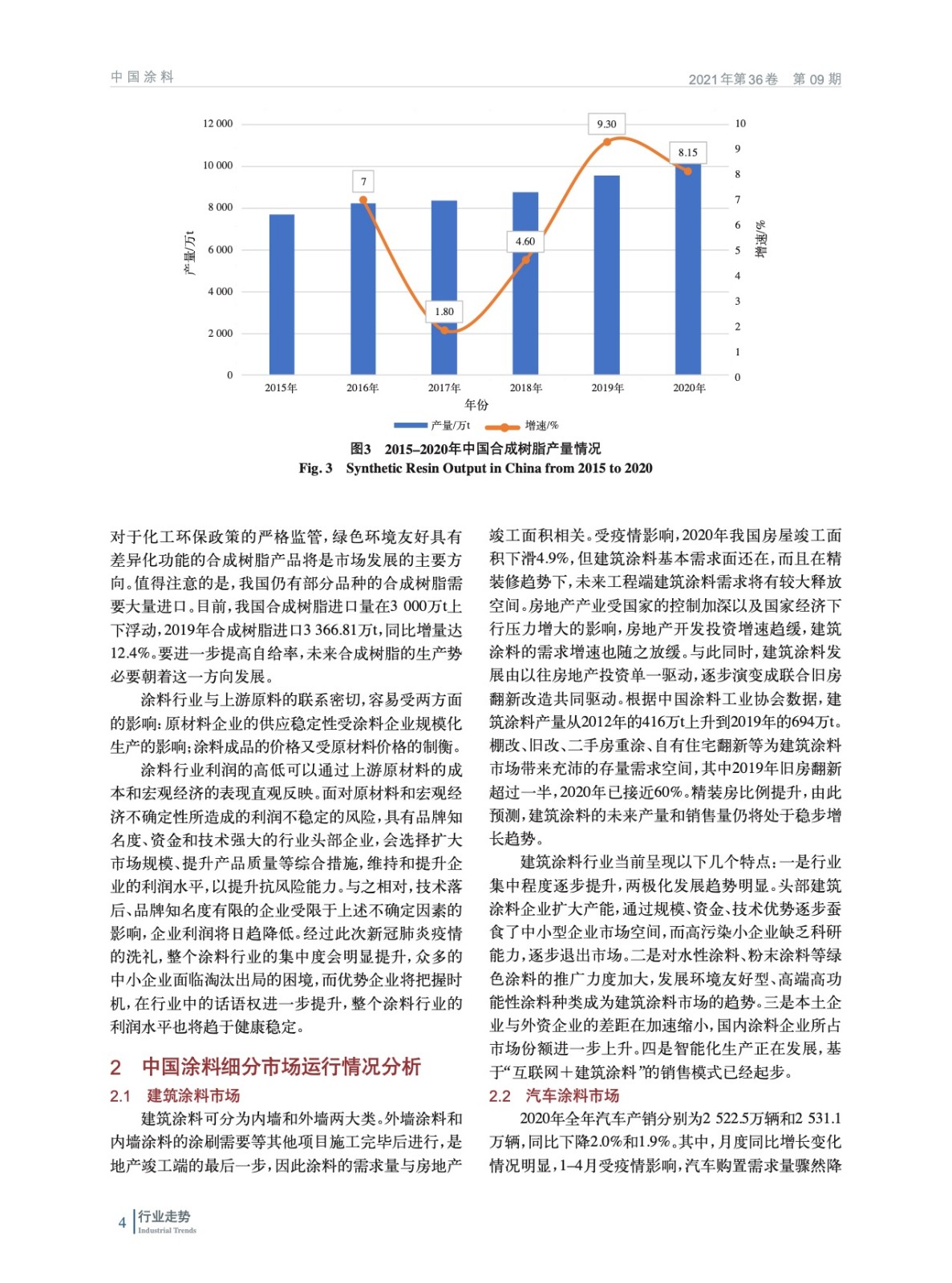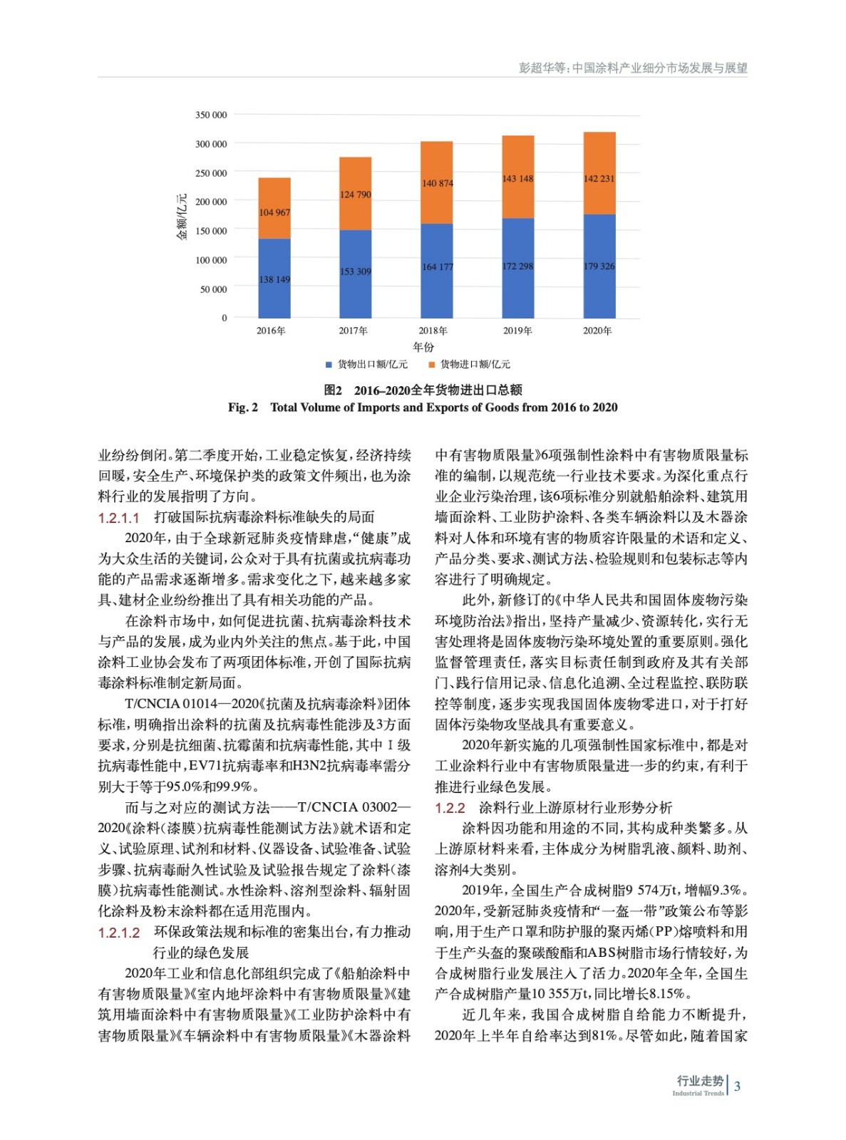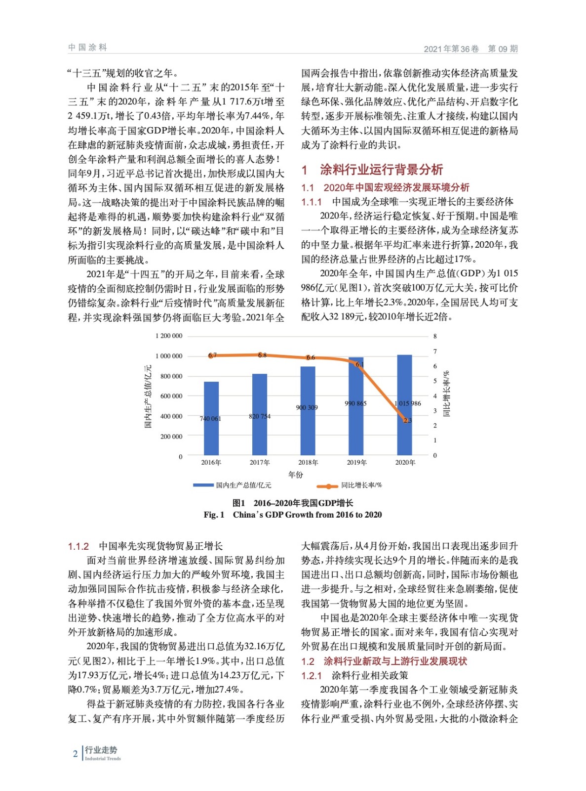 摘要:概述了2020年我國涂料行業(yè)宏觀經(jīng)濟(jì)運(yùn)行環(huán)境及發(fā)展特點(diǎn),分析了涂料行業(yè)最新政策和其上游原材料行業(yè)發(fā)展形勢。剖析了我國涂料細(xì)分市場運(yùn)行情況。總結(jié)“十三五”期間特別是2020年涂料行業(yè)主要運(yùn)行特點(diǎn),展望“十四五”我國涂料行業(yè)面臨的機(jī)遇與挑戰(zhàn)。