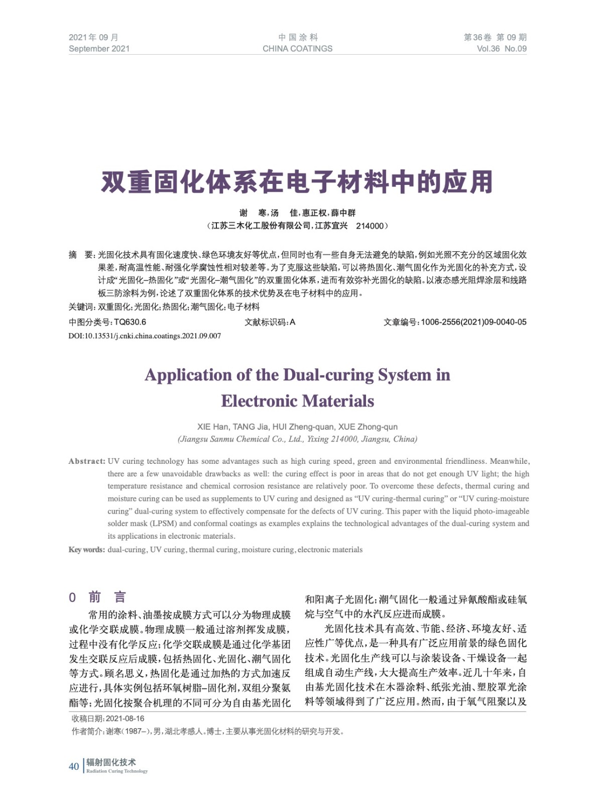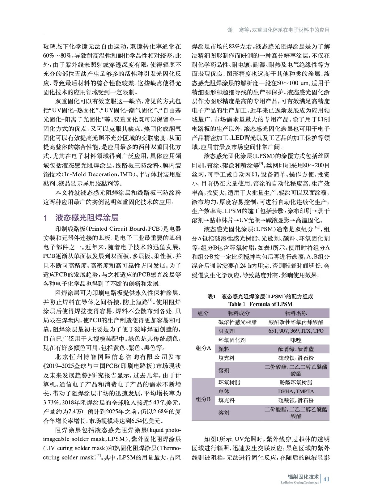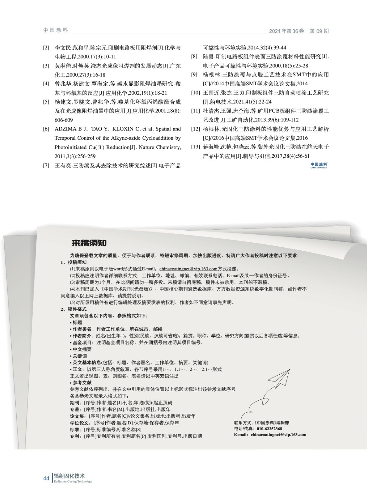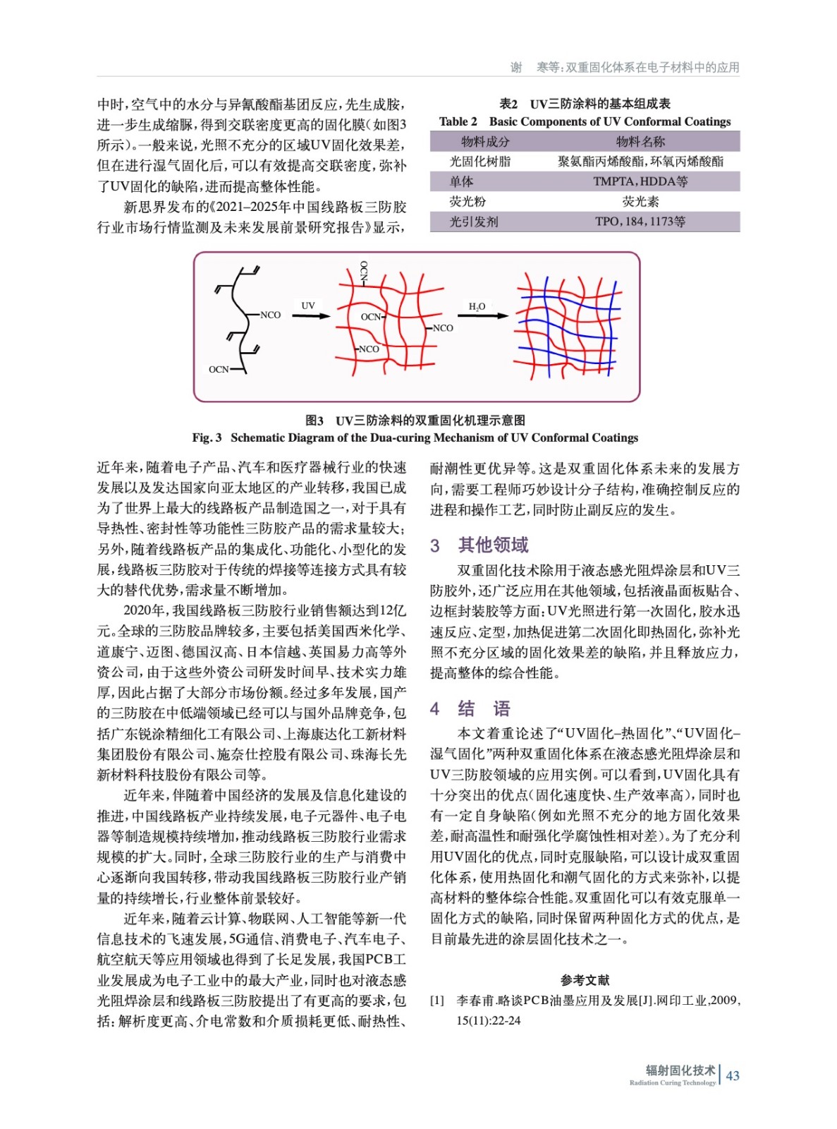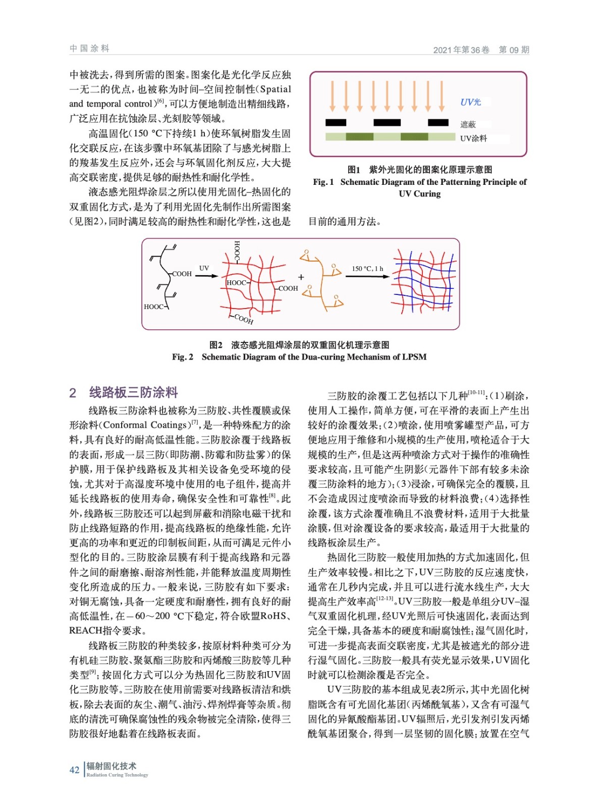 摘要:光固化技術具有固化速度快、綠色環境友好等優點,但同時也有一些自身無法避免的缺陷,例如光照不充分的區域固化效果差,耐高溫性能、耐強化學腐蝕性相對較差等。為了克服這些缺陷,可以將熱固化、潮氣固化作為光固化的補充方式,設計成“光固化–熱固化”或“光固化–潮氣固化”的雙重固化體系,進而有效彌補光固化的缺陷。以液態感光阻焊涂層和線路板三防涂料為例,論述了雙重固化體系的技術優勢及在電子材料中的應用。