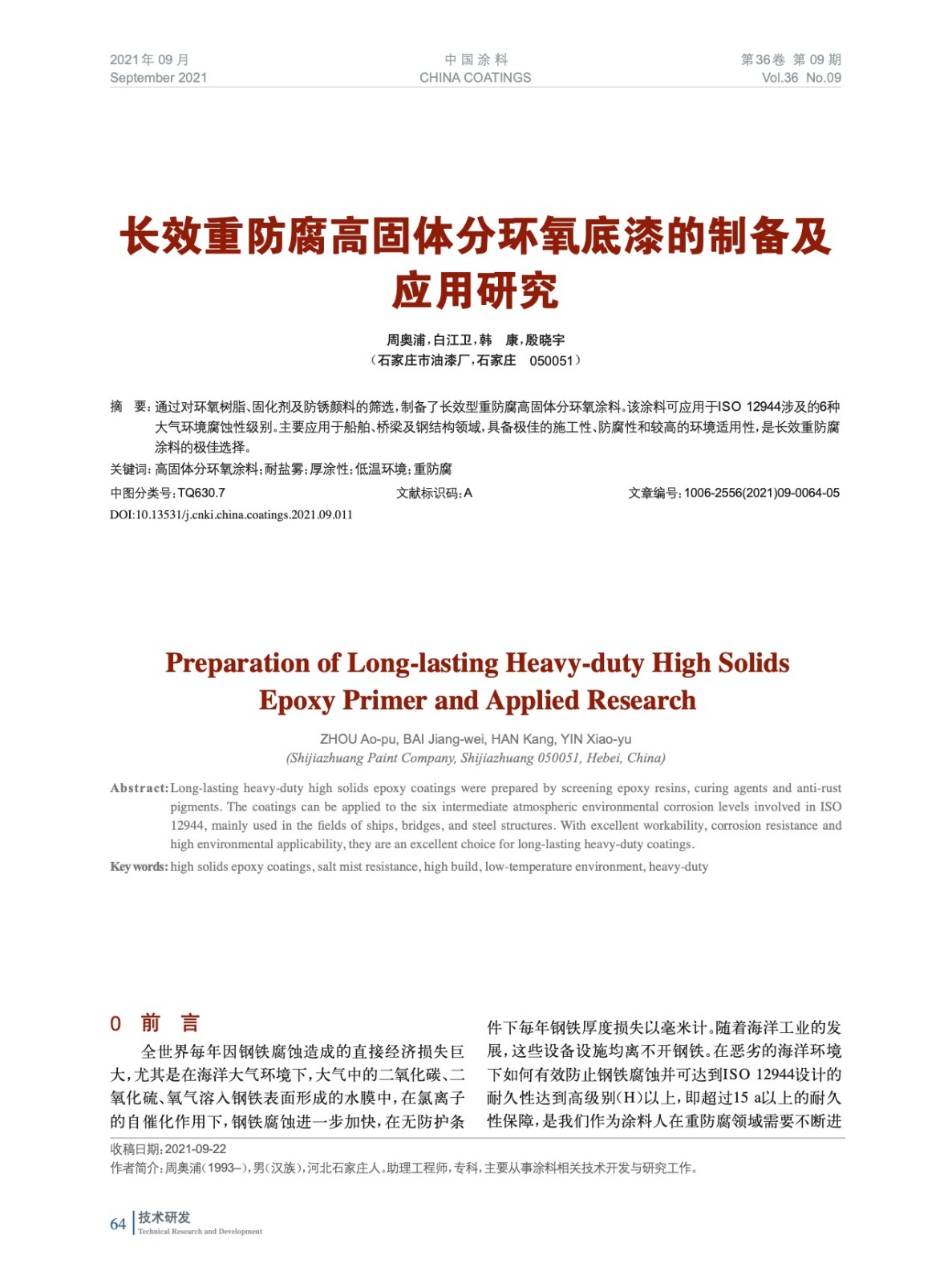 本文系作者@周奧浦,白江衛,韓 康,殷曉宇 授權中國涂料網發表,并經中國涂料網編輯,未經允許不得轉載,如需轉載請聯系chinacoatingnet@vip.163.com