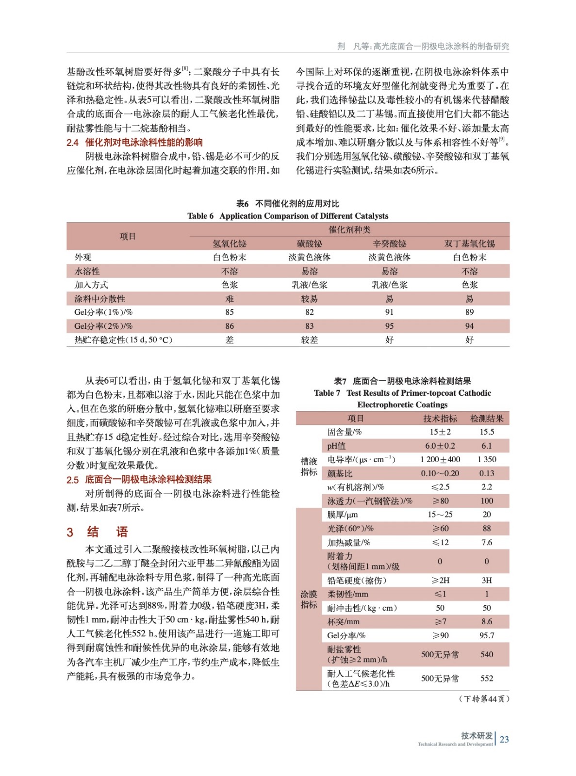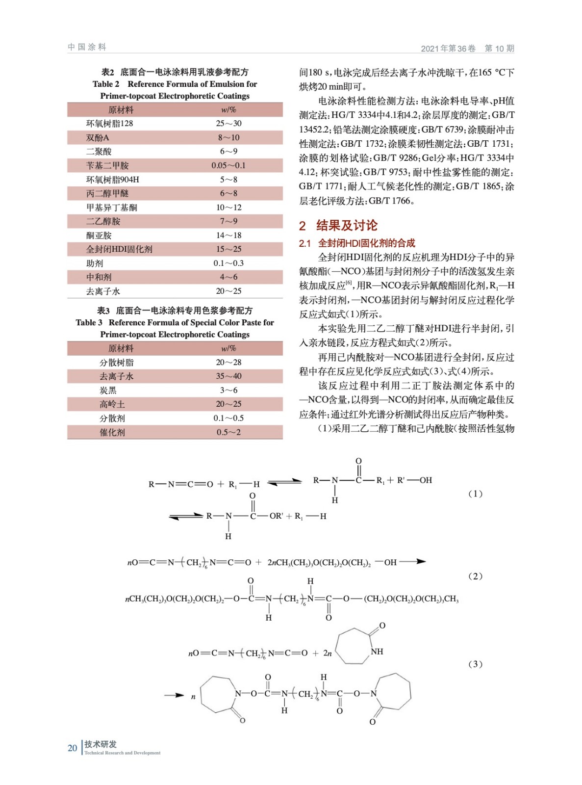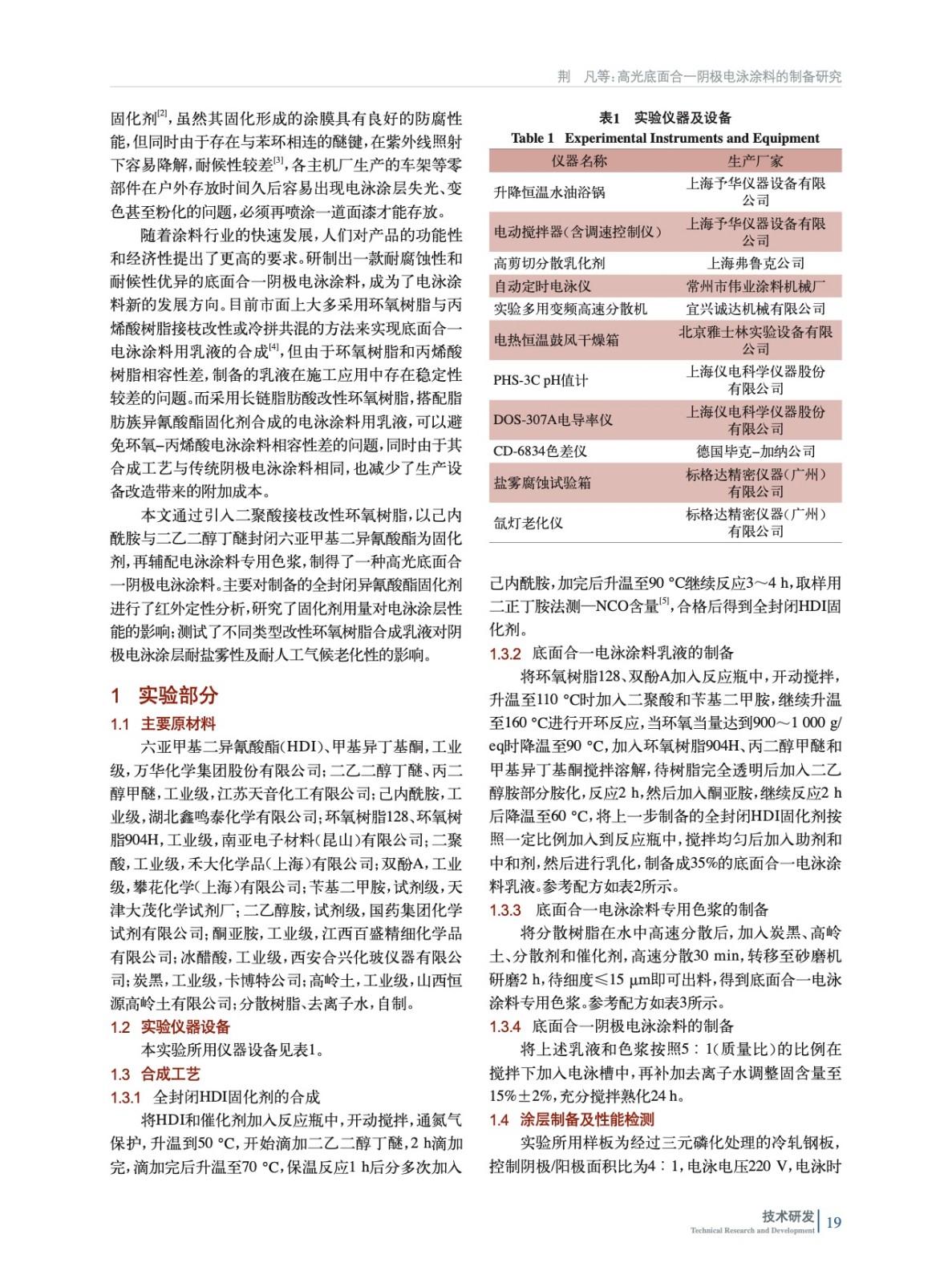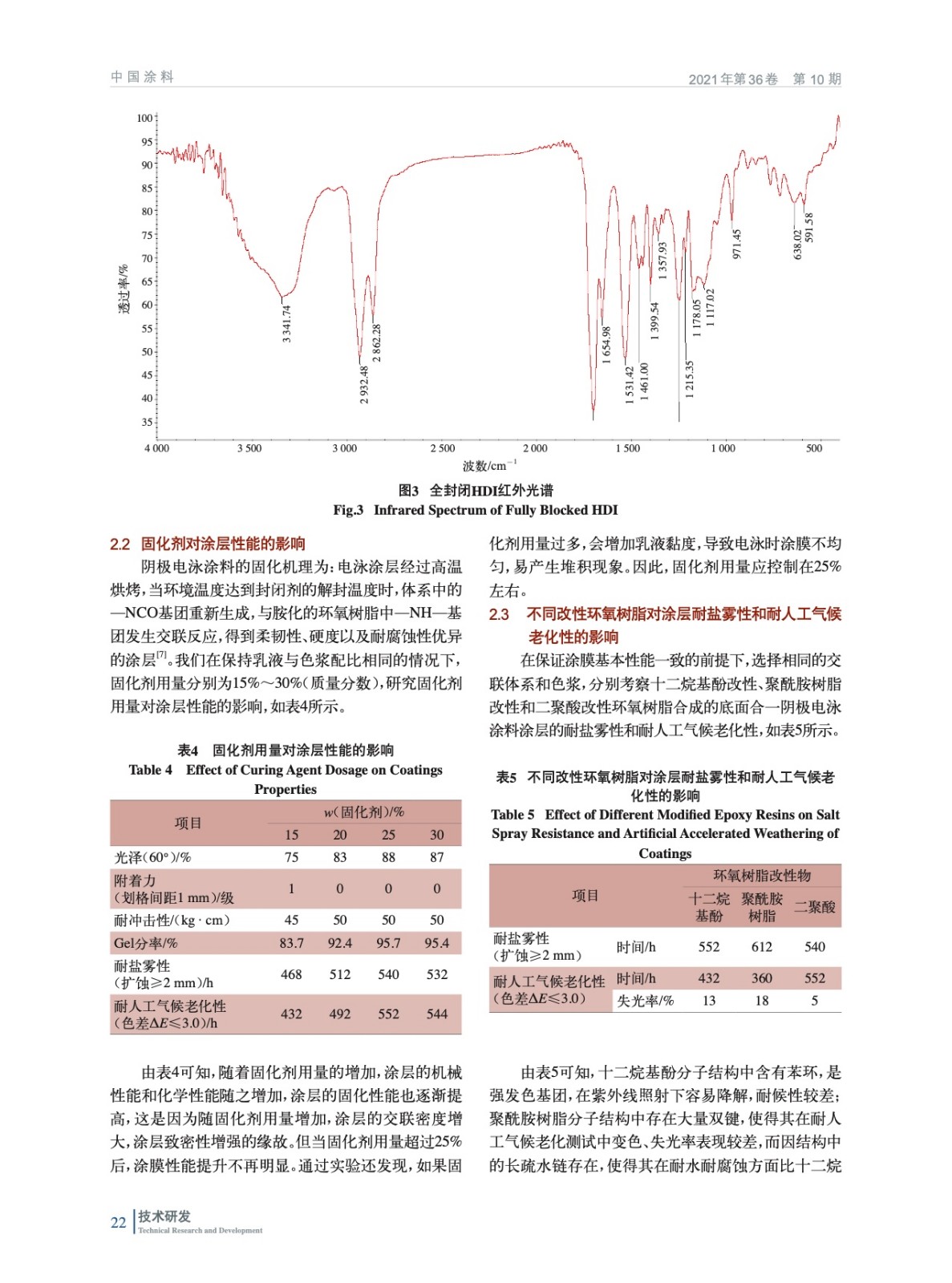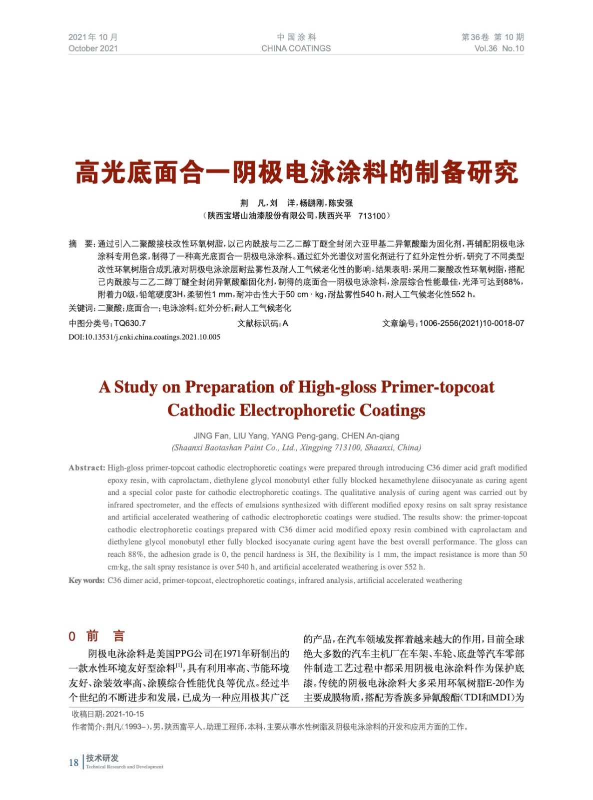 摘要:通過引入二聚酸接枝改性環氧樹脂,以己內酰胺與二乙二醇丁醚全封閉六亞甲基二異氰酸酯為固化劑,再輔配陰極電泳涂料專用色漿,制得了一種高光底面合一陰極電泳涂料。測試結果表明:制得的底面合一陰極電泳涂料,涂層綜合性能最佳,光澤可達到88%,附著力0級,鉛筆硬度3H,柔韌性1 mm,耐沖擊性大于50 cm·kg,耐鹽霧性540 h,耐人工氣候老化性552 h。
