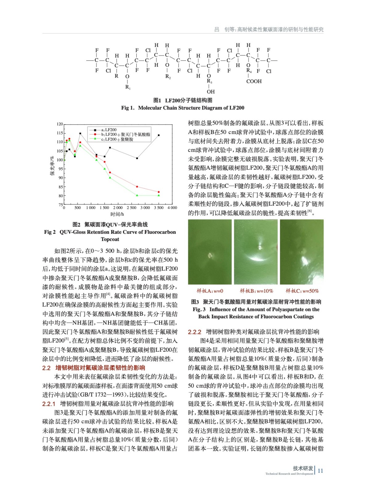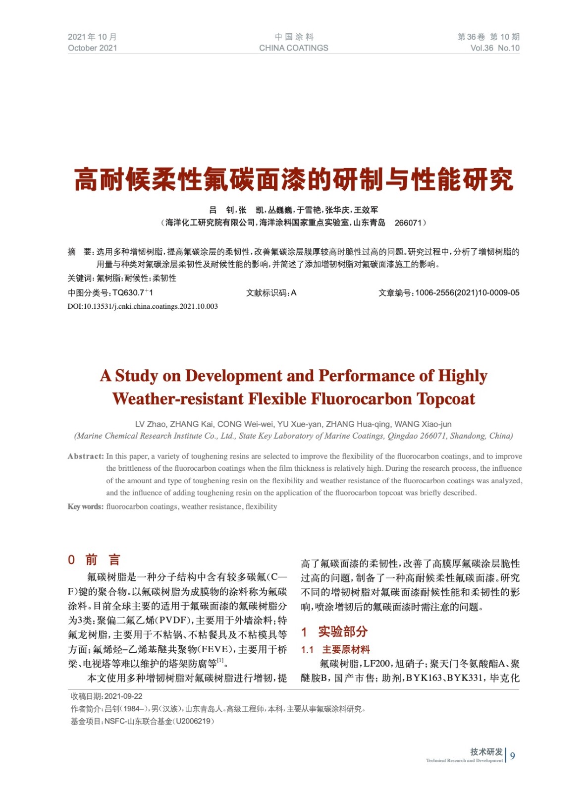 摘要:選用多種增韌樹脂,提高氟碳涂層的柔韌性,改善氟碳涂層膜厚較高時(shí)脆性過高的問題。研究過程中,分析了增韌樹脂的用量與種類對(duì)氟碳涂層柔韌性及耐候性能的影響,并簡(jiǎn)述了添加增韌樹脂對(duì)氟碳面漆施工的影響。