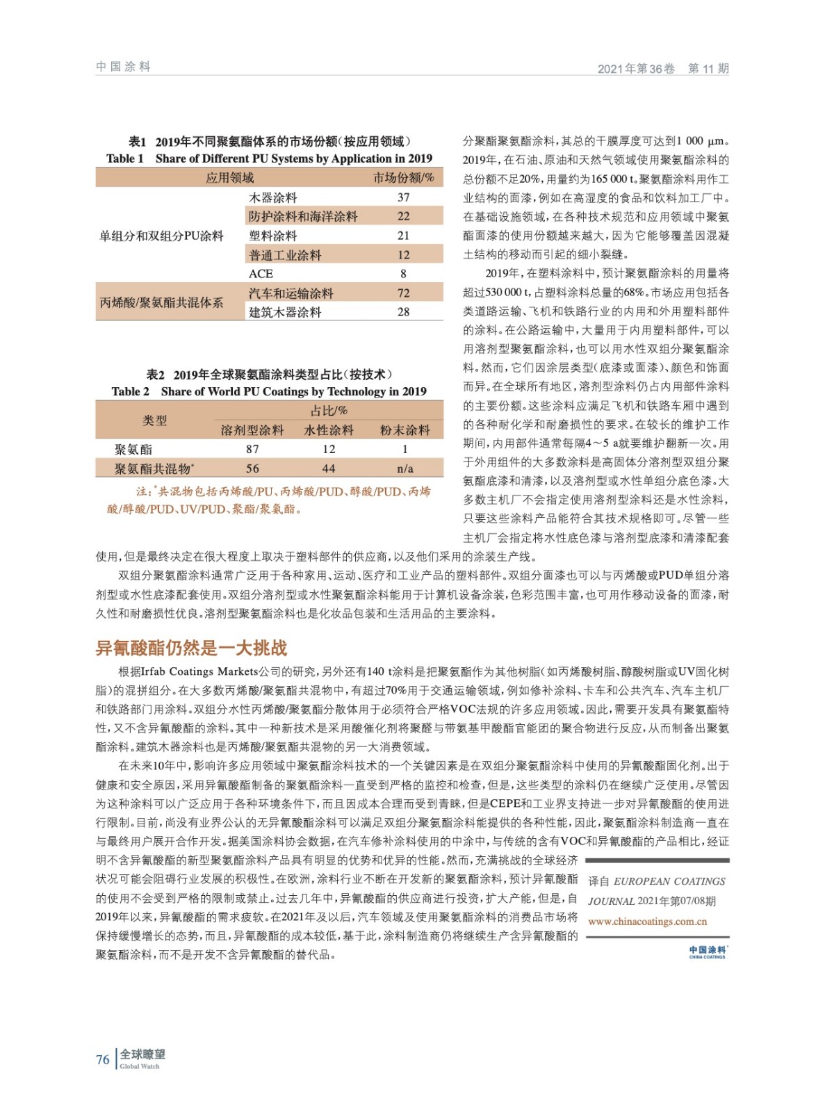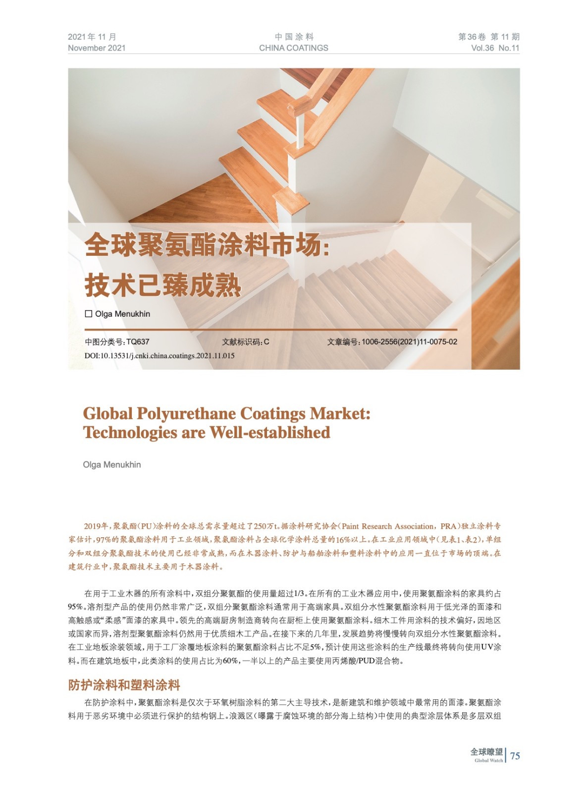 摘要:編者按:2019年,聚氨酯涂料的全球總需求量超過了250萬t。據(jù)涂料研究協(xié)會(Paint Research Association)獨(dú)立涂料專家估計(jì),97%的聚氨酯涂料用于工業(yè)領(lǐng)域,聚氨酯涂料占全球化學(xué)涂料總量的16%以上。在工業(yè)應(yīng)用領(lǐng)域中,單組分和雙組分聚氨酯技術(shù)的使用已經(jīng)非常成熟,而在木器涂料、防護(hù)與船舶涂料和塑料涂料中的應(yīng)用一直位于市場的頂端。在建筑行業(yè)中,聚氨酯技術(shù)主要用于木器涂料。