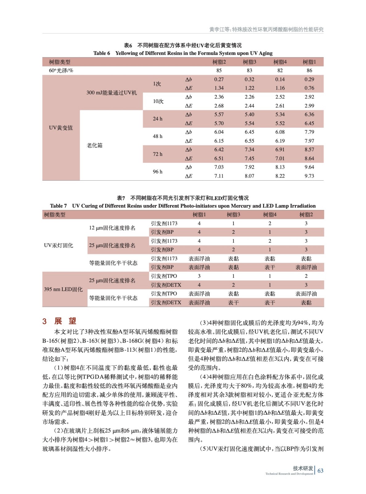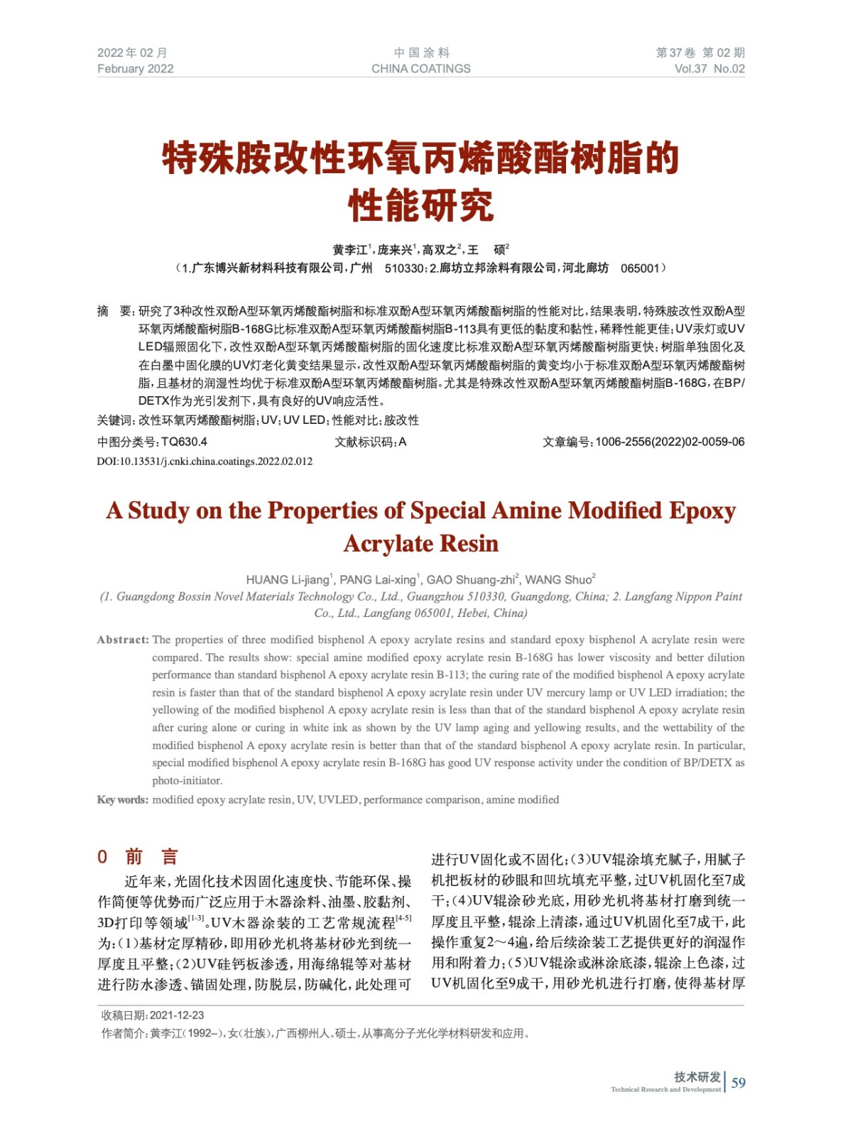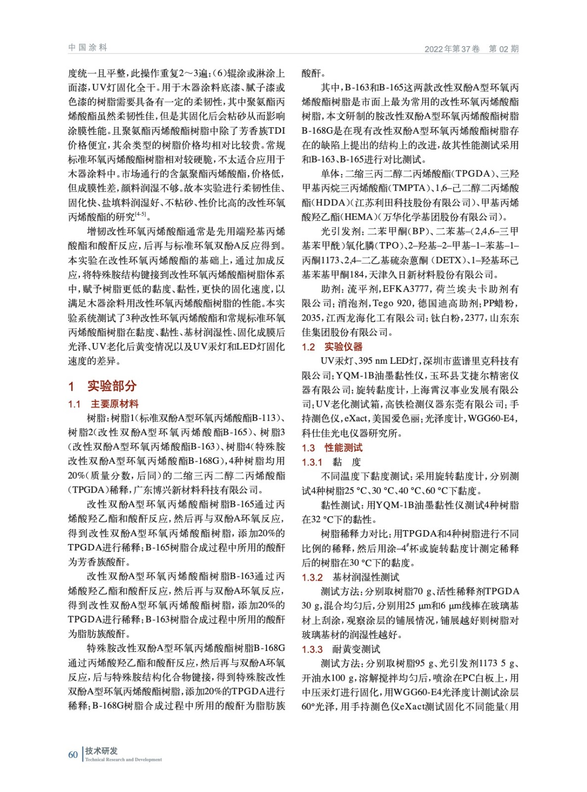 摘要:研究了3種改性雙酚A型環氧丙烯酸酯樹脂和標準雙酚A型環氧丙烯酸酯樹脂的性能對比,結果表明,特殊胺改性雙酚A型環氧丙烯酸酯樹脂B-168G比標準雙酚A型環氧丙烯酸酯樹脂B-113具有更低的黏度和黏性,稀釋性能更佳;UV汞燈或UVLED輻照固化下,改性樹脂的固化速度更快;改性樹脂的黃變均較小,且基材的潤濕性均較優。在BP/DETX作為光引發劑下,B-168G具有良好的UV響應活性。