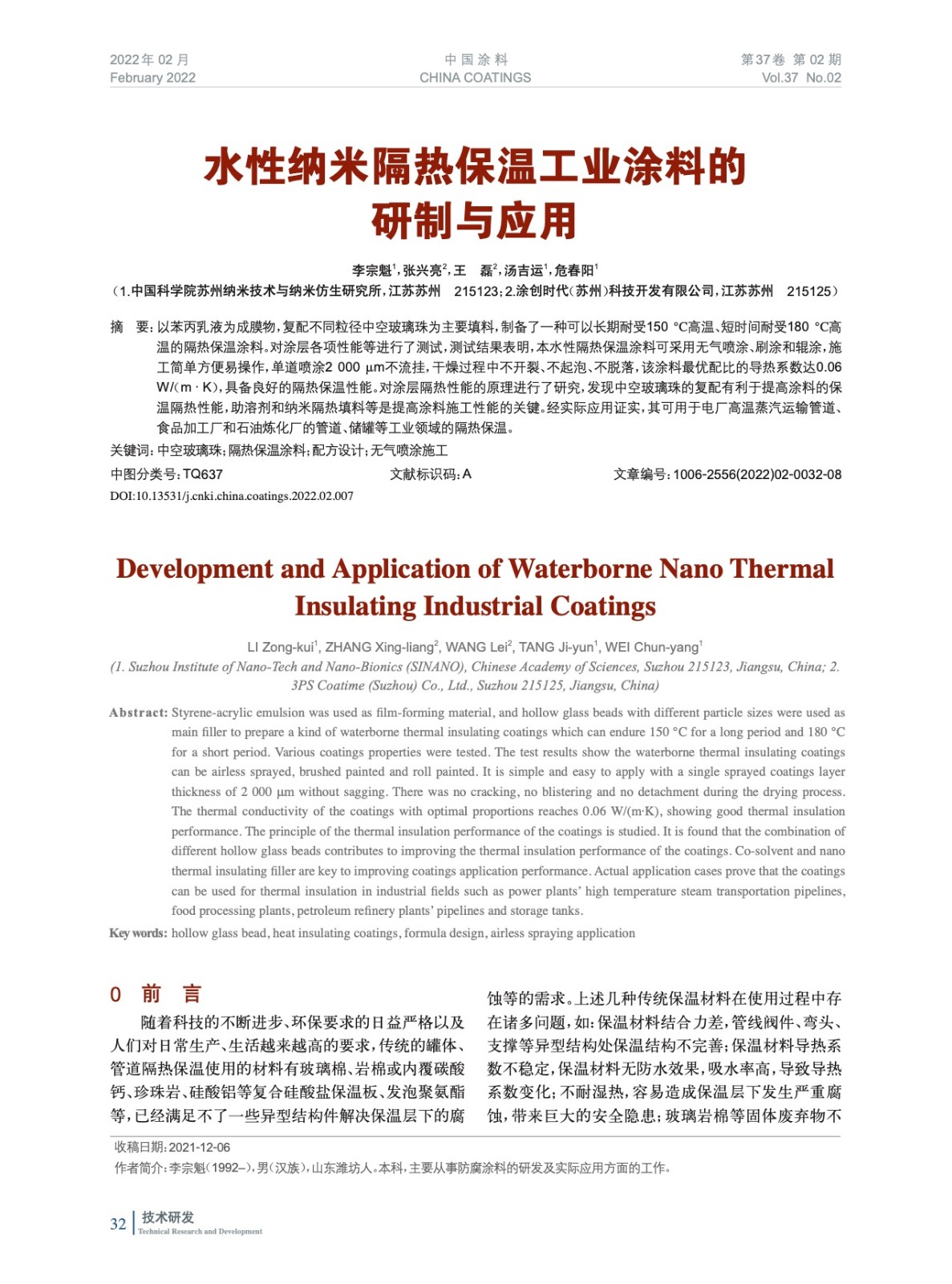 摘要:以苯丙乳液為成膜物,復(fù)配不同粒徑中空玻璃珠為主要填料,制備了一種可以長(zhǎng)期耐受150 ℃高溫、短時(shí)間耐受180 ℃高溫的隔熱保溫涂料。性能測(cè)試結(jié)果表明,本水性隔熱保溫涂料可采用無(wú)氣噴涂、刷涂和輥涂,單道噴涂2 000 μm不流掛,干燥過(guò)程中不開(kāi)裂、不起泡、不脫落,具備良好的隔熱保溫性能。