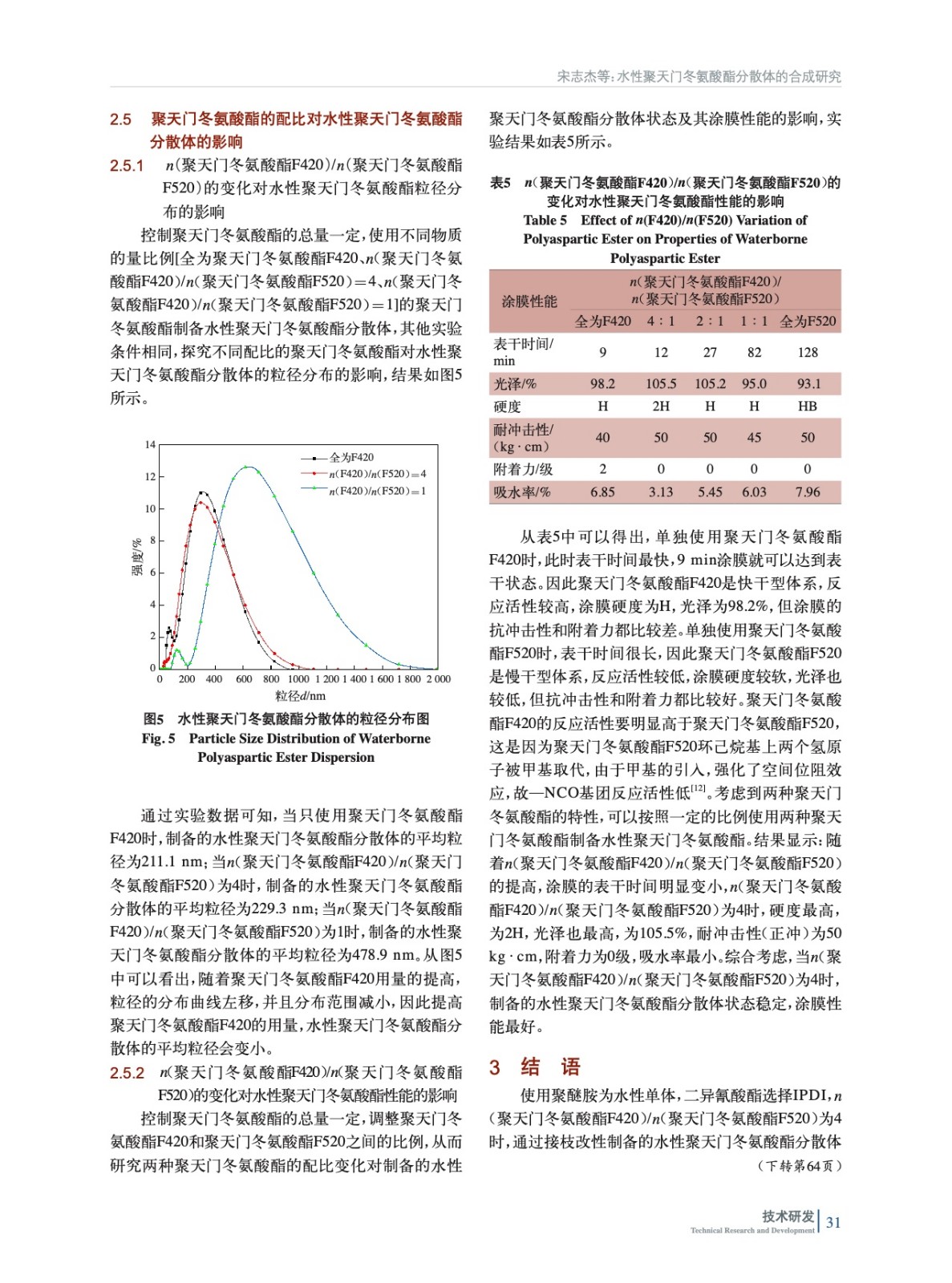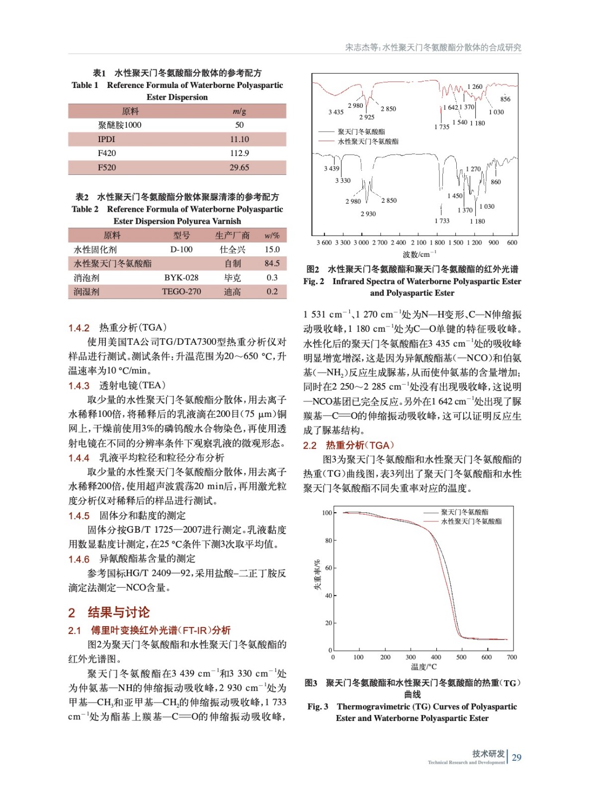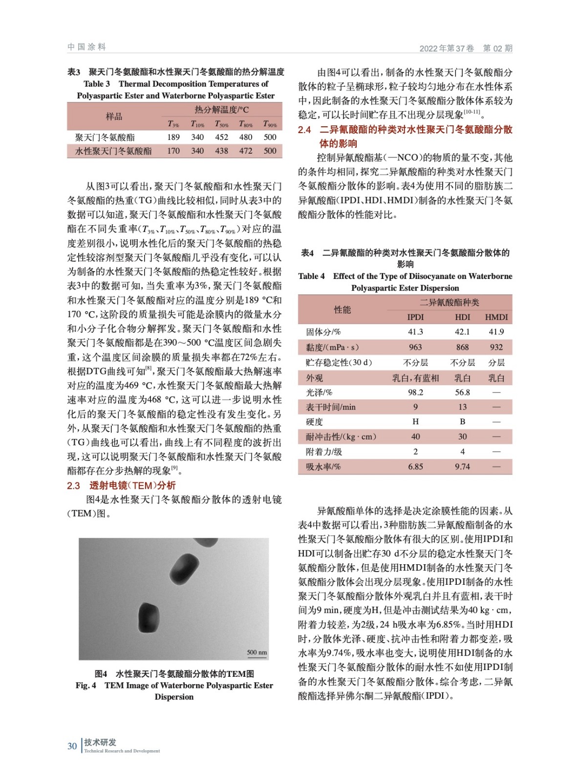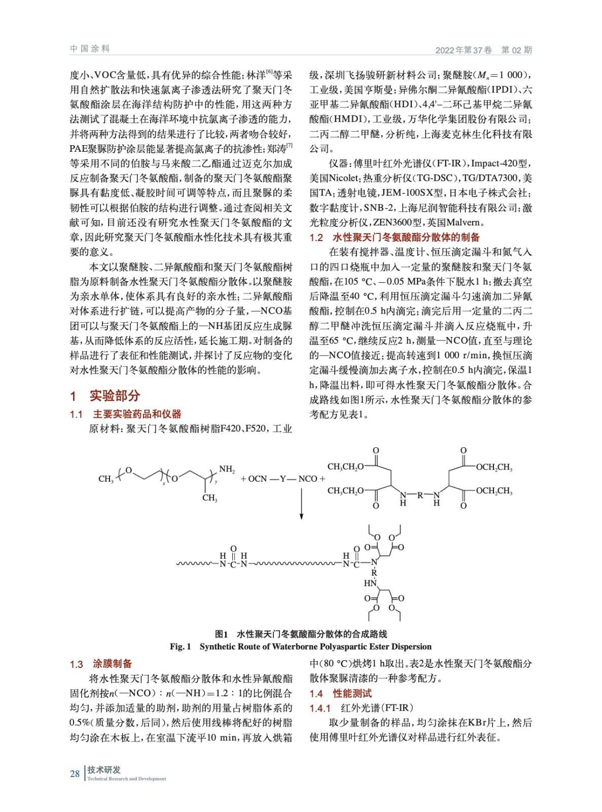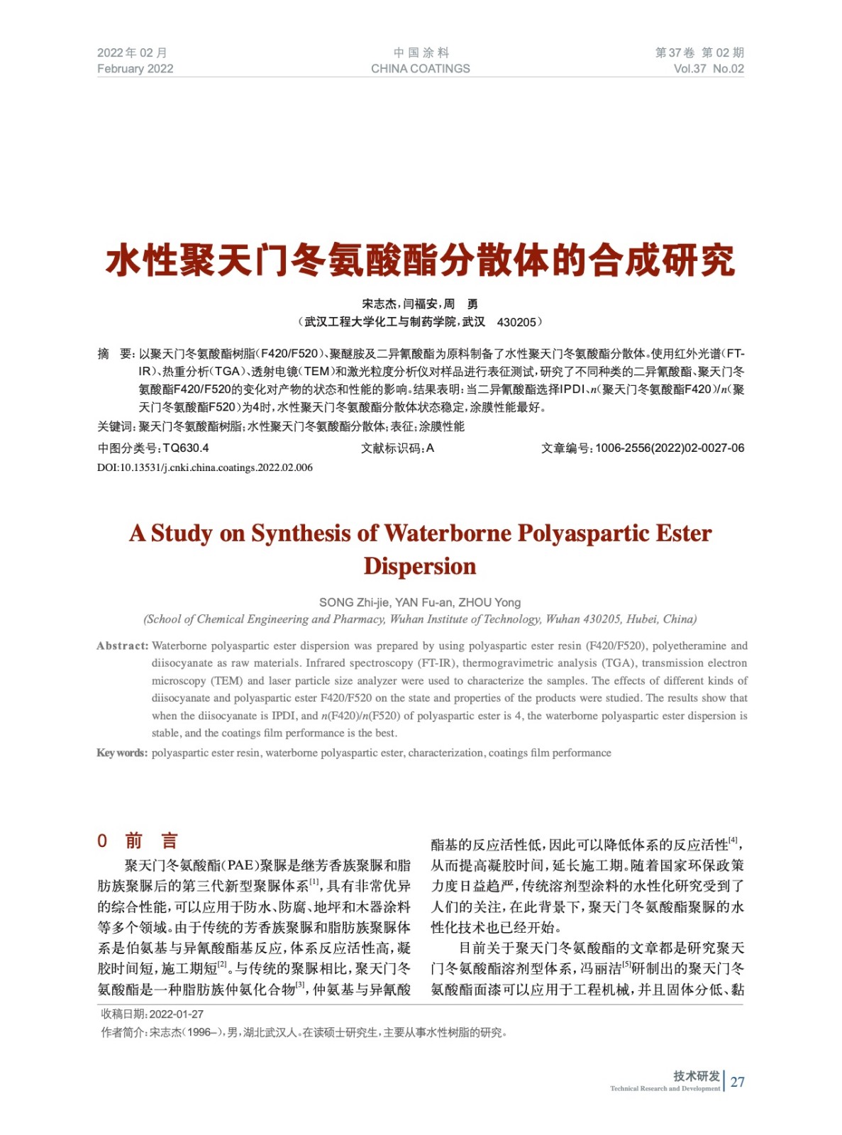 摘要:以聚天門冬氨酸酯樹脂、聚醚胺及二異氰酸酯為原料制備了水性聚天門冬氨酸酯分散體。使用紅外光譜、熱重分析、透射電鏡和激光粒度分析儀對樣品進行表征測試,結(jié)果表明:當(dāng)二異氰酸酯選擇IPDI、n(聚天門冬氨酸酯F420)/n(聚天門冬氨酸酯F520)為4時,水性聚天門冬氨酸酯分散體狀態(tài)穩(wěn)定,涂膜性能最好。