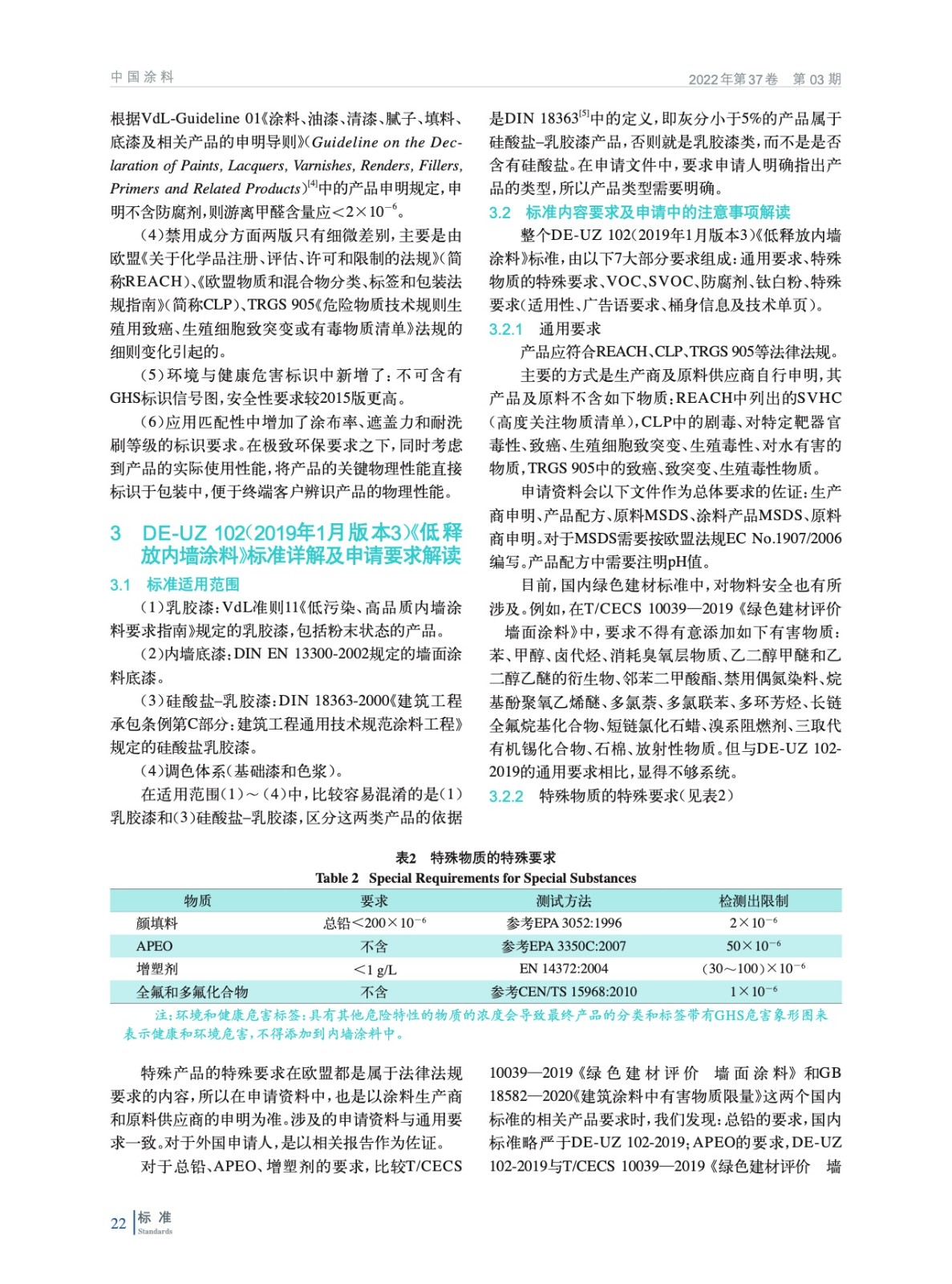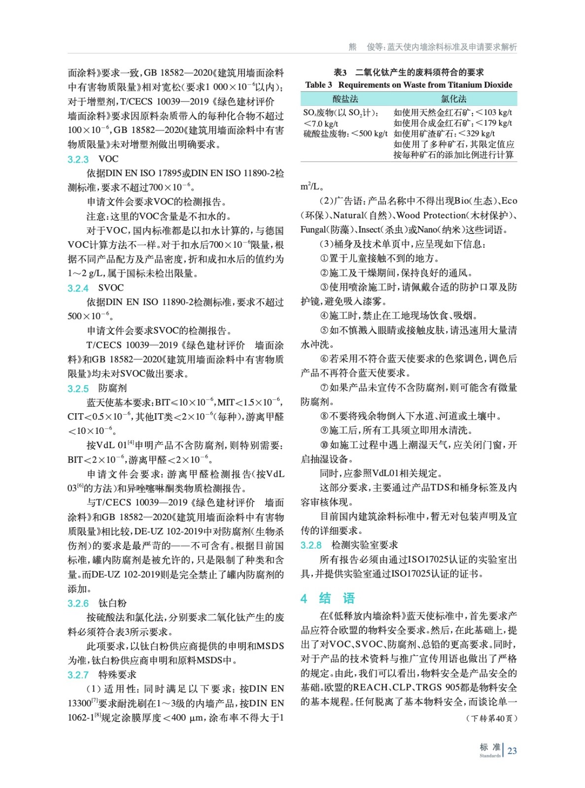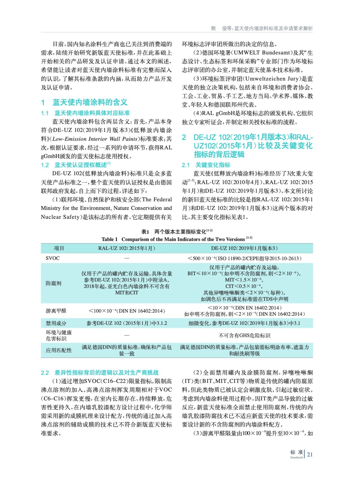 摘要:深度解讀了藍天使內墻涂料的含義,進一步通過比較RAL-UZ 102(2015年1月)和DE-UZ 102(2019年1月版本3)的標準,列出了新版本UZ 102-2019中的關鍵變動,通過深入研究其變動邏輯,闡明了涂料生產商所面臨的挑戰與研發路徑;詳細完整地解析新版標準內容與申請文件的要求,為藍天使內墻涂料的申請指明了方向。