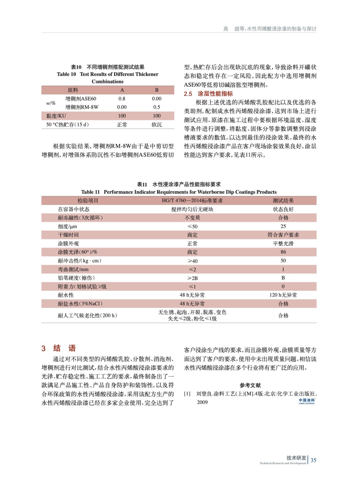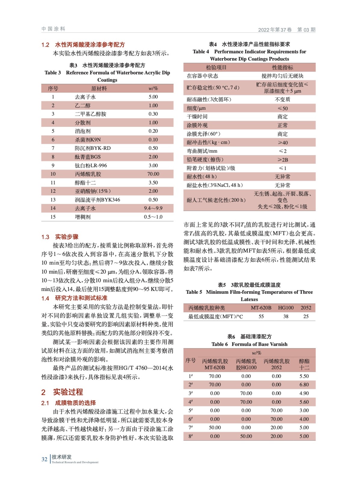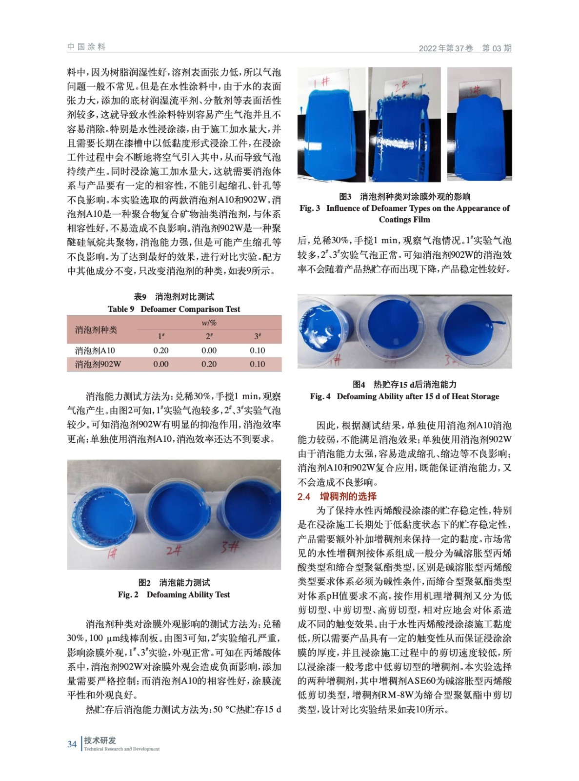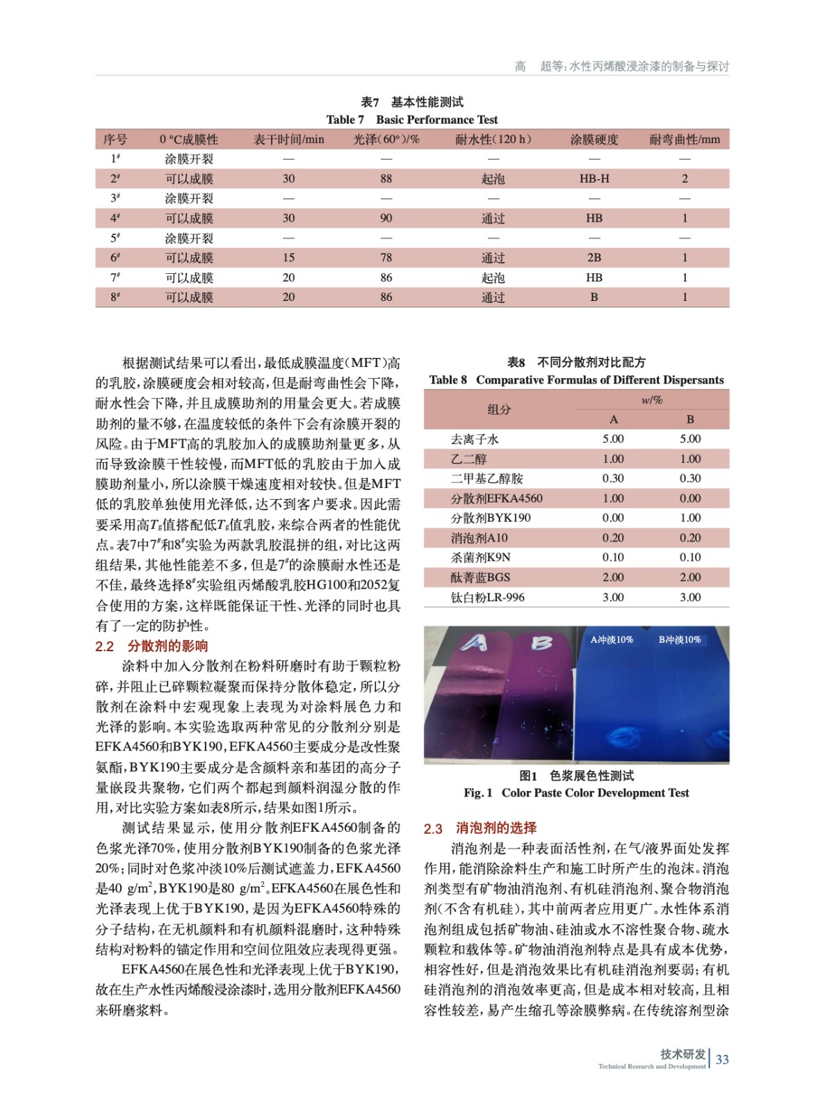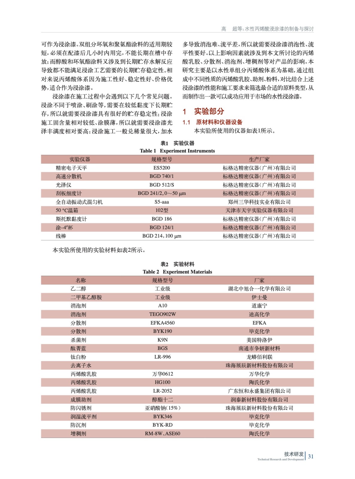 講述了水性丙烯酸浸涂漆的制備方法,研究了不同丙烯酸乳膠、分散劑、消泡劑、增稠劑、防沉劑及研磨工藝對產品光澤展色性、貯存穩定性和浸涂施工性的影響,通過多組平行對比實驗確定了產品基本配方。