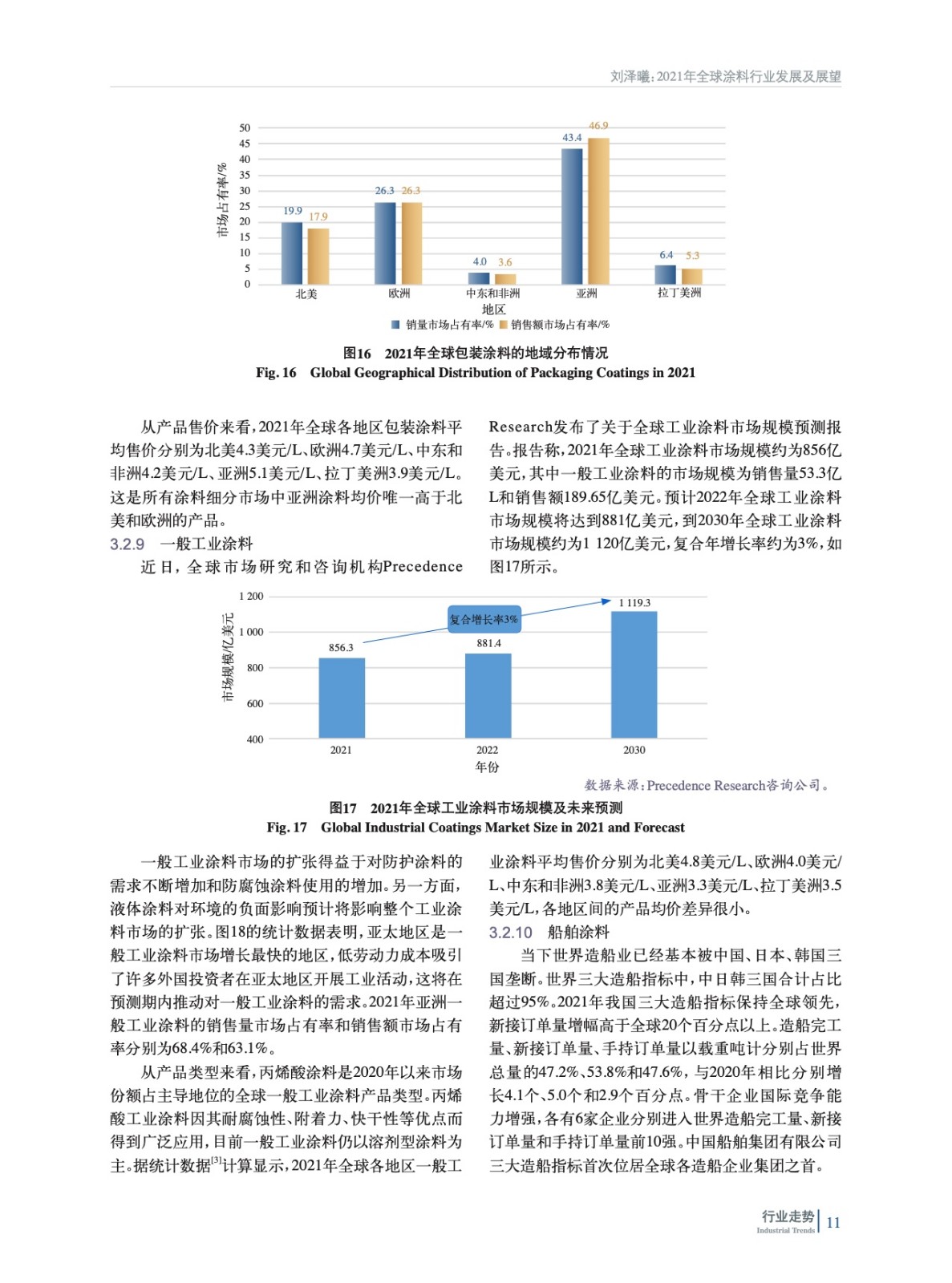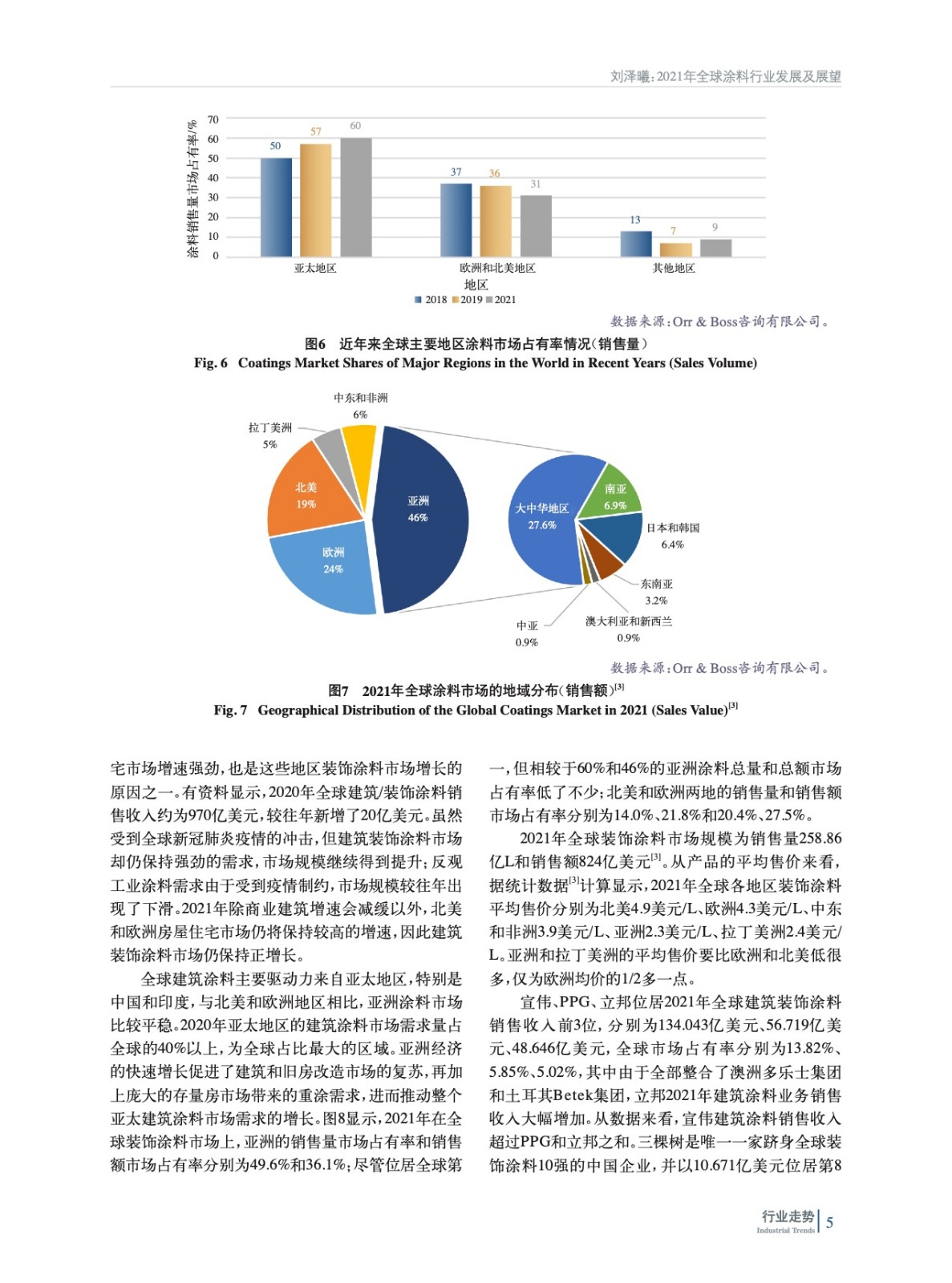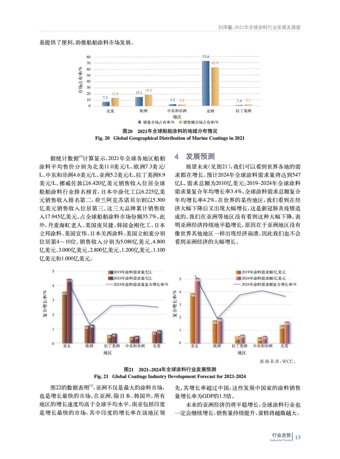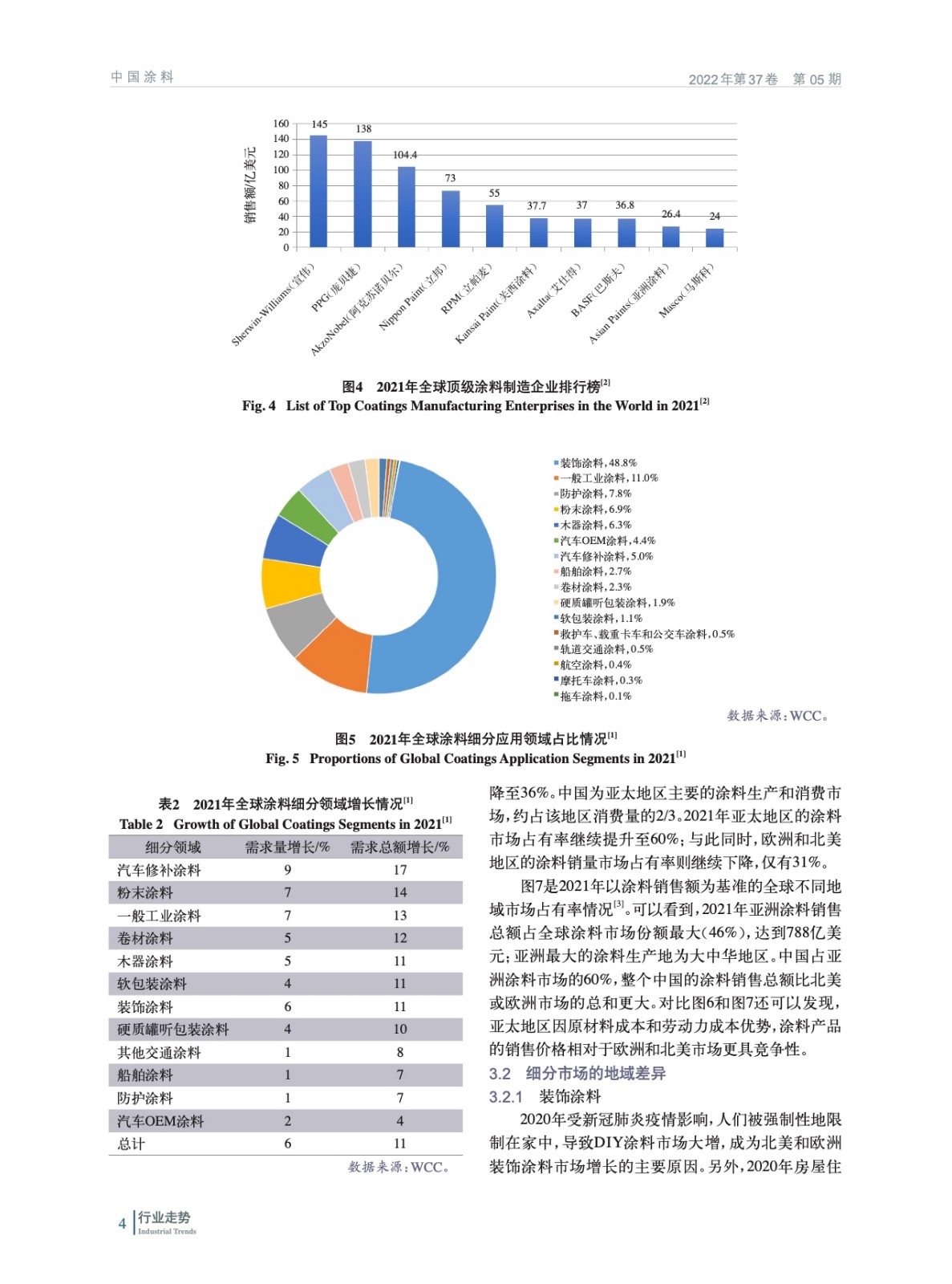 摘要:2021年在全球經(jīng)濟逐漸復蘇的大背景下,全球涂料行業(yè)呈現(xiàn)積極的增長態(tài)勢,亞洲成為全球涂料行業(yè)增長最快的地區(qū)。在粉末涂料、汽車涂料、軌道交通涂料、工業(yè)涂料等多個細分涂料領域,中國涂料行業(yè)的表現(xiàn)最為亮眼。詳細分析了2021年全球涂料市場規(guī)模、地域分布、細分市場,以及各地區(qū)細分市場的差異和發(fā)展的不均衡性,指出未來幾年亞洲仍然是全球涂料行業(yè)增長最快的地區(qū)。
