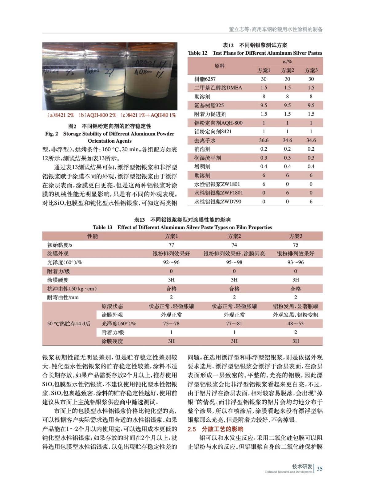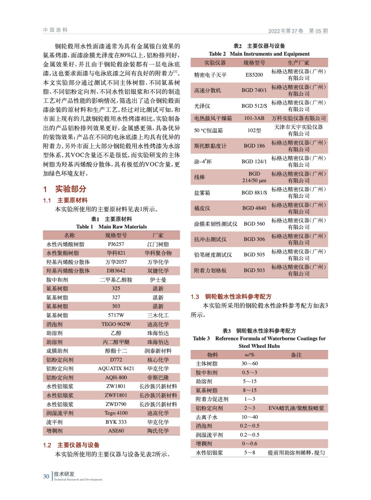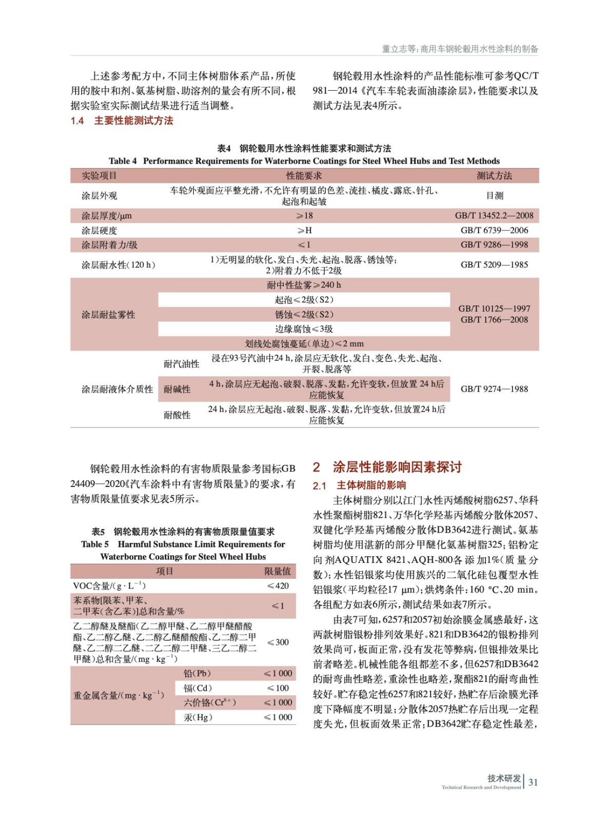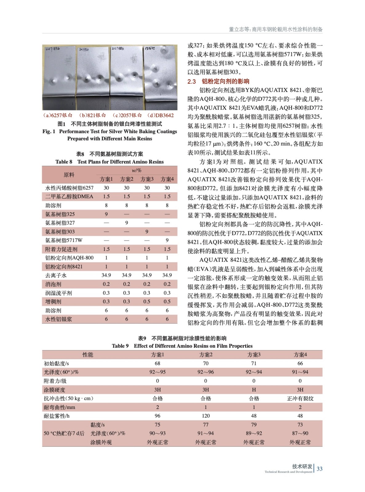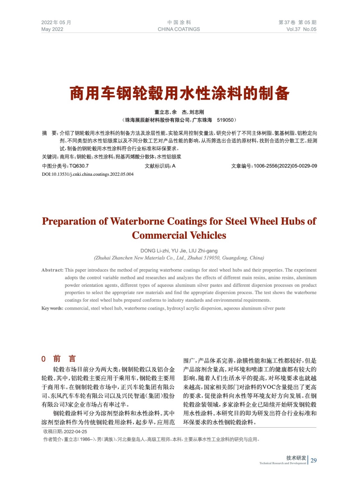 摘要:介紹了鋼輪轂用水性涂料的制備方法及涂層性能。實驗采用控制變量法,研究分析了不同主體樹脂、氨基樹脂、鋁粉定向劑、不同類型的水性鋁銀漿以及不同分散工藝對產品性能的影響,從而篩選出合適的原材料,找到合適的分散工藝。經測試,制備的鋼輪轂用水性涂料符合行業標準和環保要求。