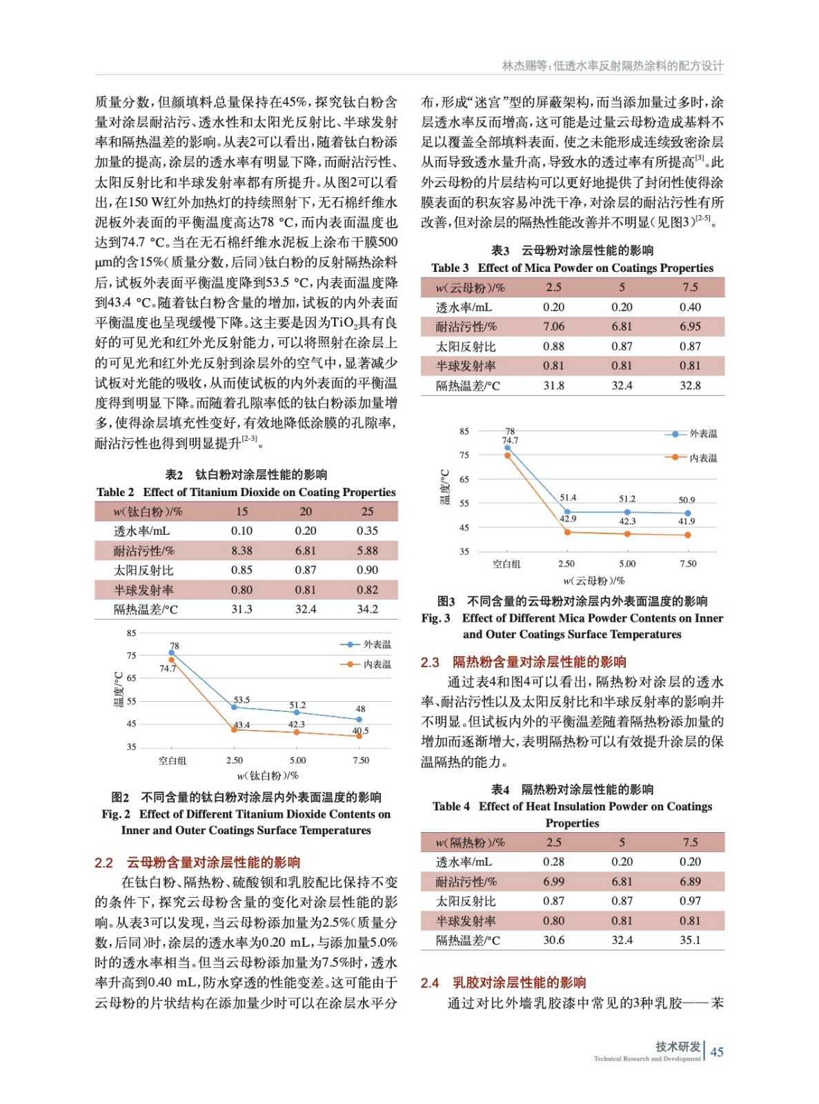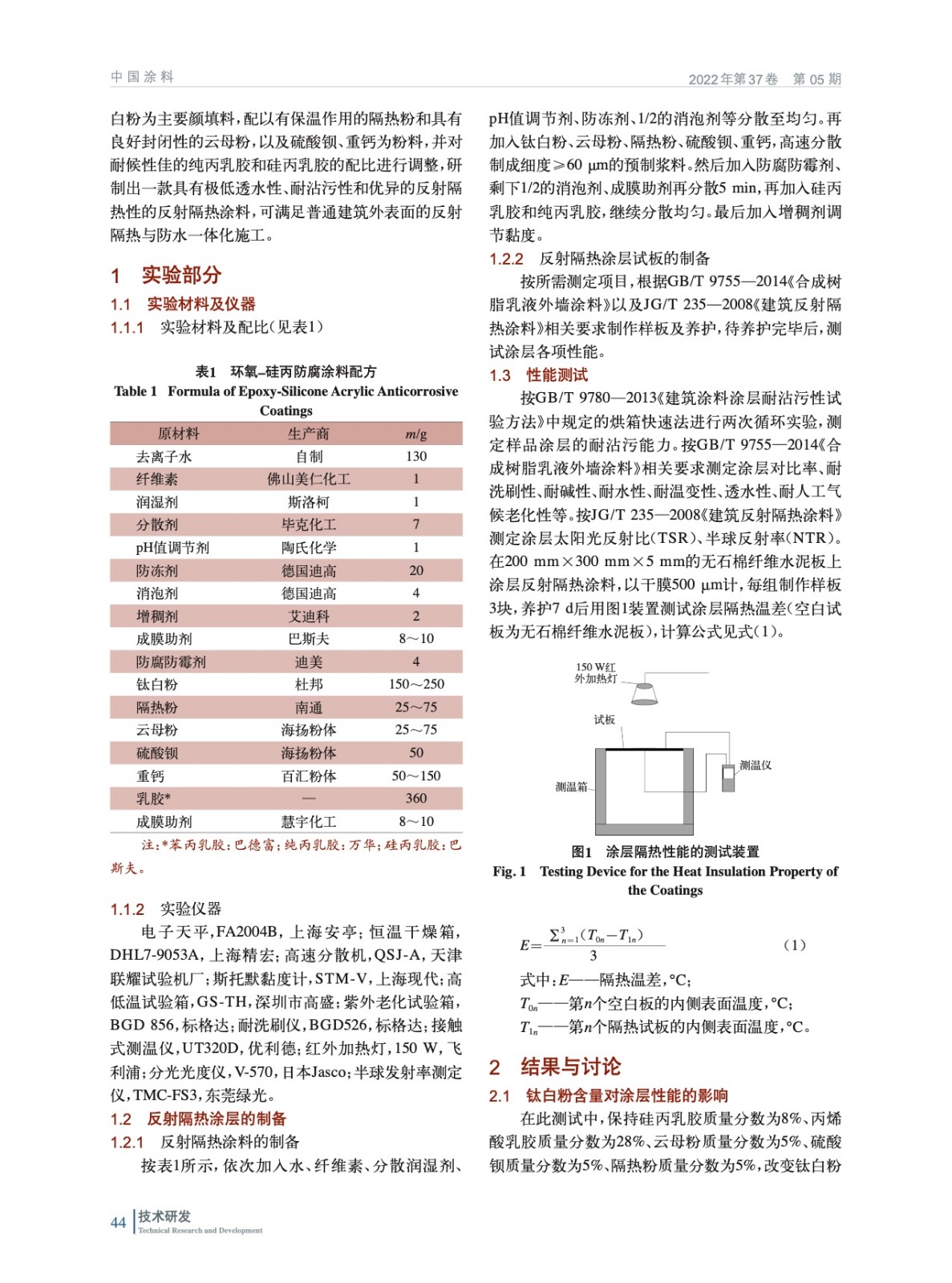 摘要:通過調(diào)整配方中鈦白粉、云母粉、隔熱粉和硅丙樹脂的比例,測定所制的反射隔熱涂料的透水性、太陽光反射比、耐沾污性、透水性和隔熱溫差,探究上述各因素與反射隔熱涂料的性能之間的關(guān)系。實(shí)驗(yàn)結(jié)果表明,所制的反射隔熱涂層的太陽光反射比為0.87、半球反射率0.81、耐沾污性5.81%,24 h透水率僅0.1 mL,隔熱溫差可達(dá)34.4 ℃,且耐候、耐水性優(yōu)異。
