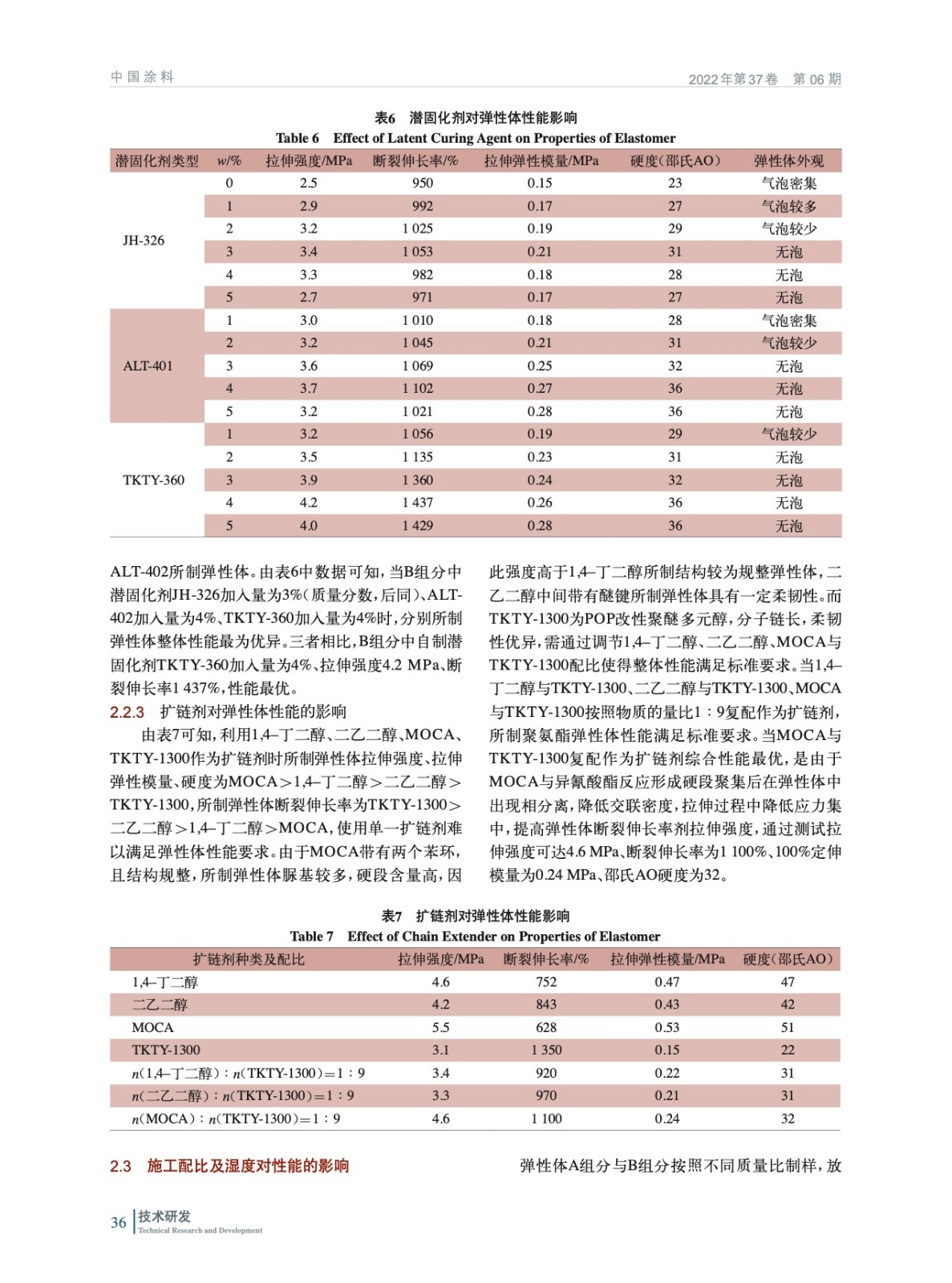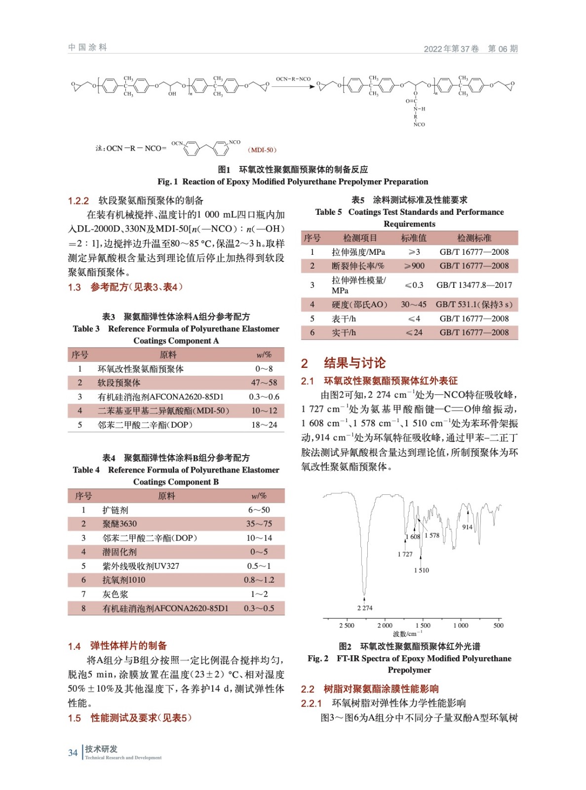 摘要:采用環氧樹脂、二苯基甲烷二異氰酸酯、聚醚二元醇DL-2000D、聚醚三元醇330N、鄰苯二甲酸二辛酯為主要原材料制備A組分,利用擴鏈劑、聚醚多元醇3630、潛固化劑、催化劑及其他助劑復配得到B組分,制備了一種雙組分環氧改性聚氨酯涂料。結果表明,所制彈性體綜合性能最為優異,受濕度影響較小,模量低,斷裂伸長率及拉伸強度較高,適用配比寬泛。