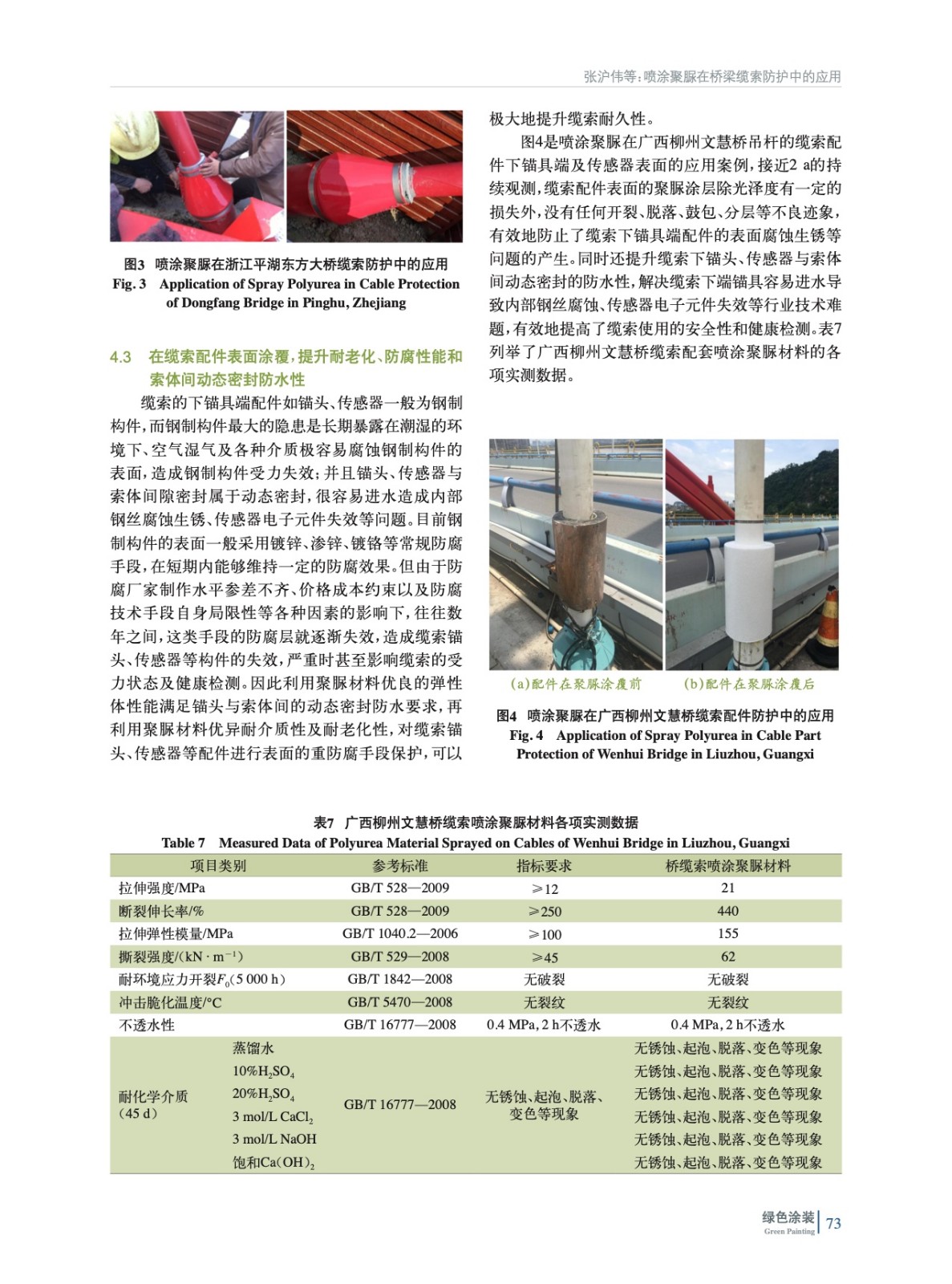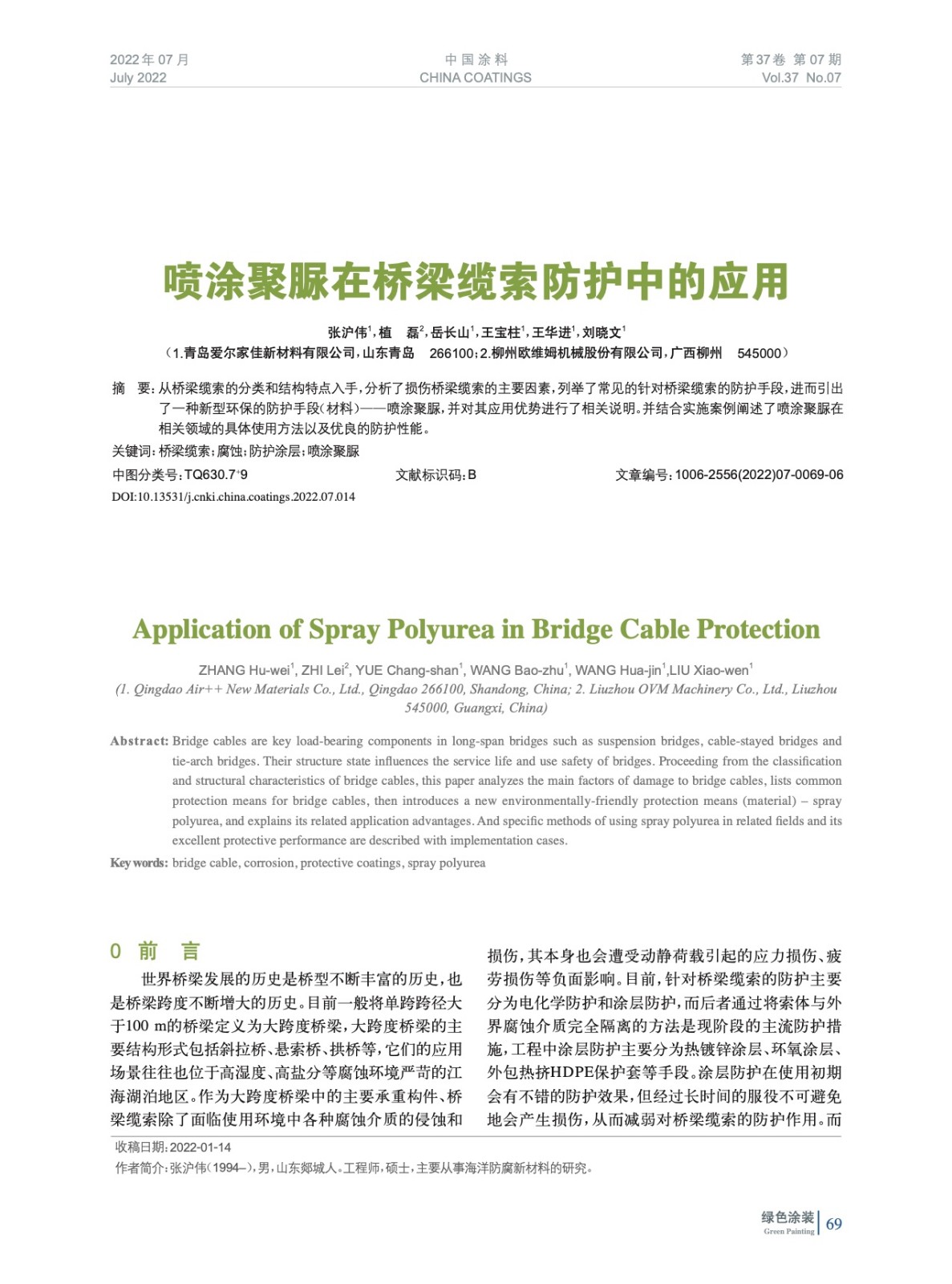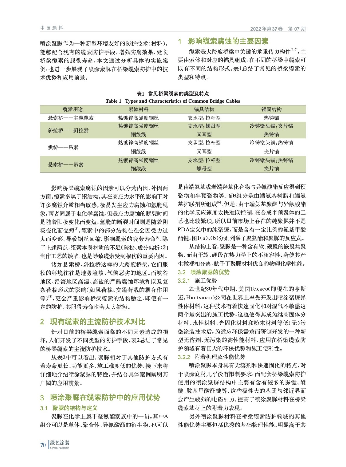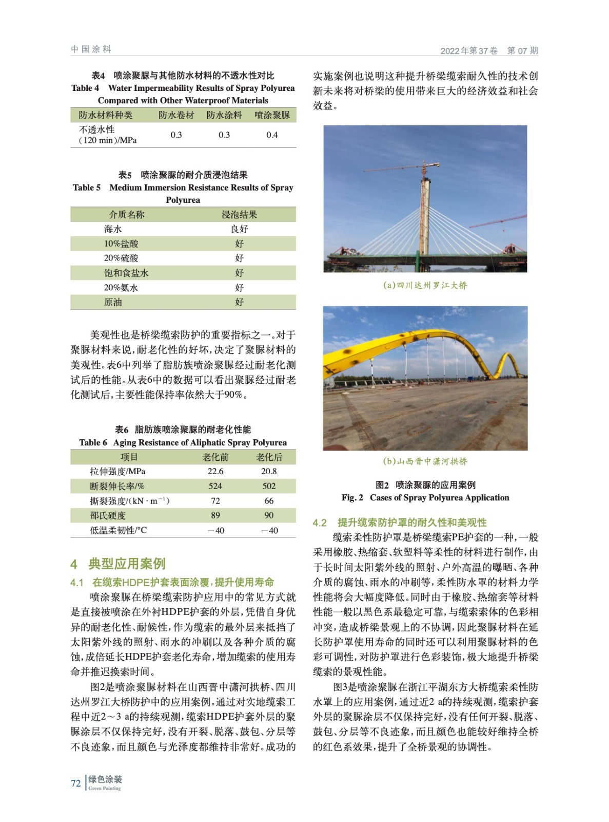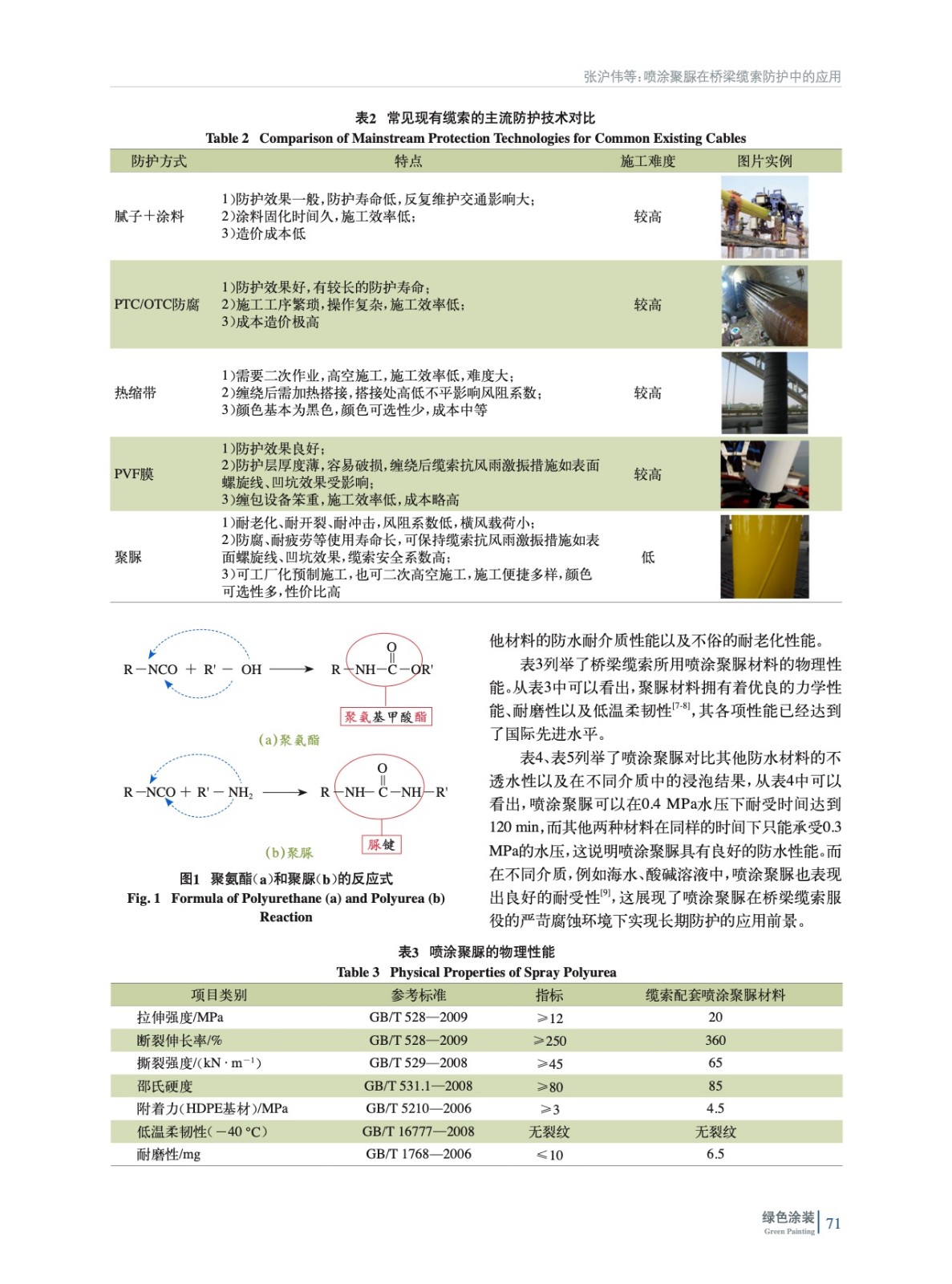 摘要:從橋梁纜索的分類和結構特點入手,分析了損傷橋梁纜索的主要因素,列舉了常見的針對橋梁纜索的防護手段,進而引出了一種新型環保的防護手段(材料)——噴涂聚脲,并對其應用優勢進行了相關說明。并結合實施案例闡述了噴涂聚脲在相關領域的具體使用方法以及優良的防護性能。