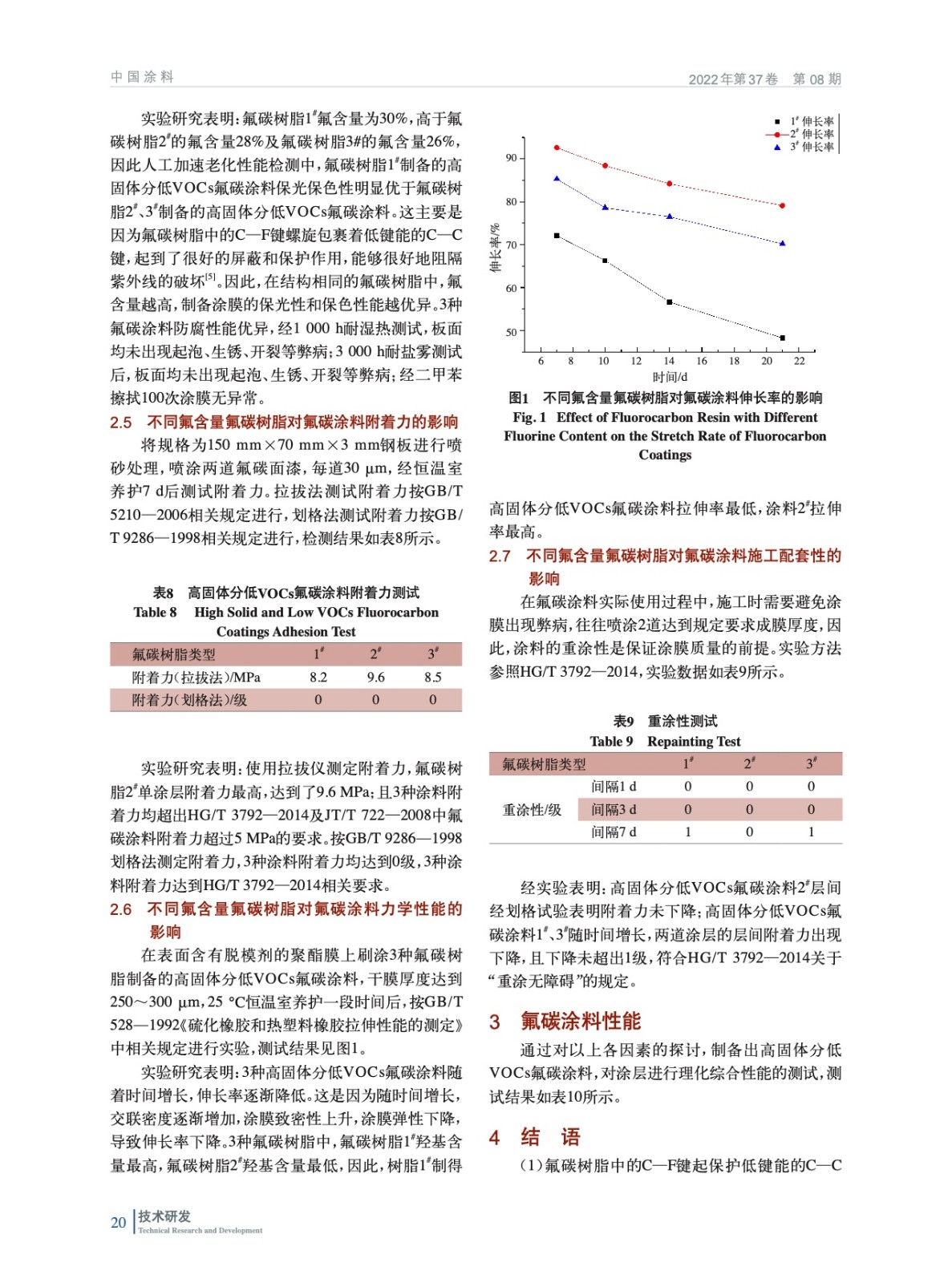 摘要:采用高氟含量氟碳樹脂,用于制備常溫固化高固體分低VOCs氟碳涂料。研究表明:C—F鍵的螺旋包裹作用能有效提高涂膜的屏蔽和保護作用,氟含量的提高能有效增加涂膜的耐化學品性及耐人工老化性;氟碳樹脂的低極性使涂膜表面張力低,提高氟含量可以提升涂膜的耐沾污性;高氟含量樹脂溶劑的加入量大,造成涂料體積固體分減低,VOCs增加;氟碳涂料制備涂膜,隨時間增長涂膜交聯密度提升,拉伸率降低。