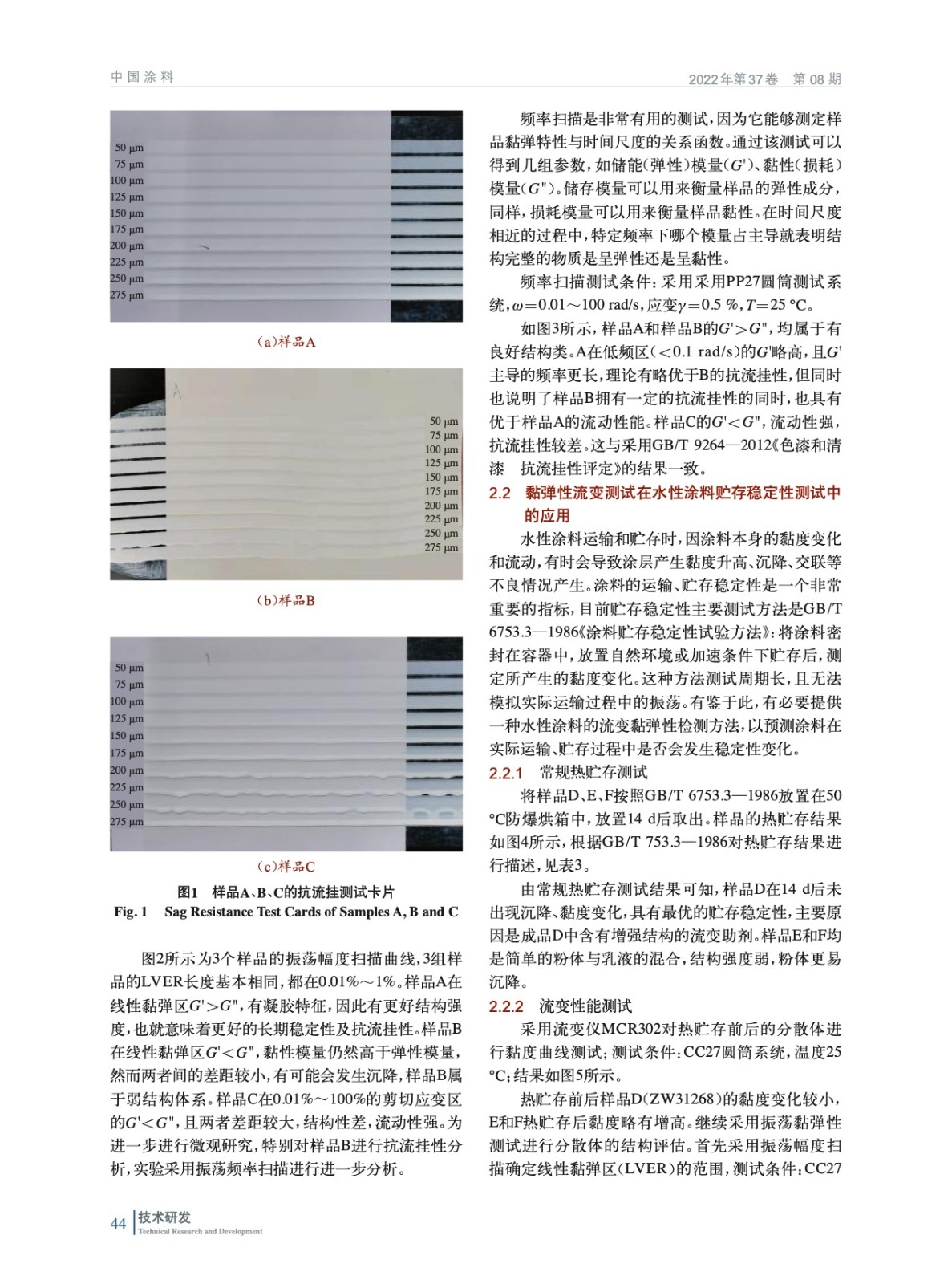 摘要:采用振蕩模式下的幅度掃描和頻率掃描對水性涂料的微觀結(jié)構(gòu)進行評估,通過對黏彈性曲線的研究,探討了儲能(彈性)模量(G')、黏性(損耗)模量(G")變化對涂料的貯存穩(wěn)定性、抗流掛性的影響。