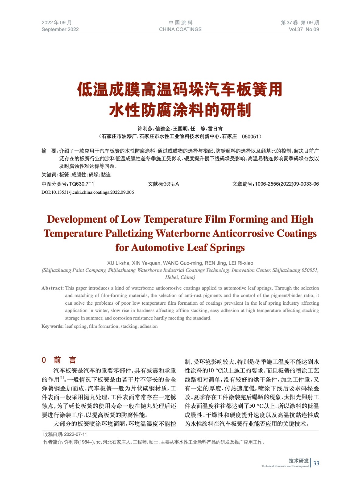 低溫成膜高溫碼垛汽車板簧用水性防腐涂料的研制