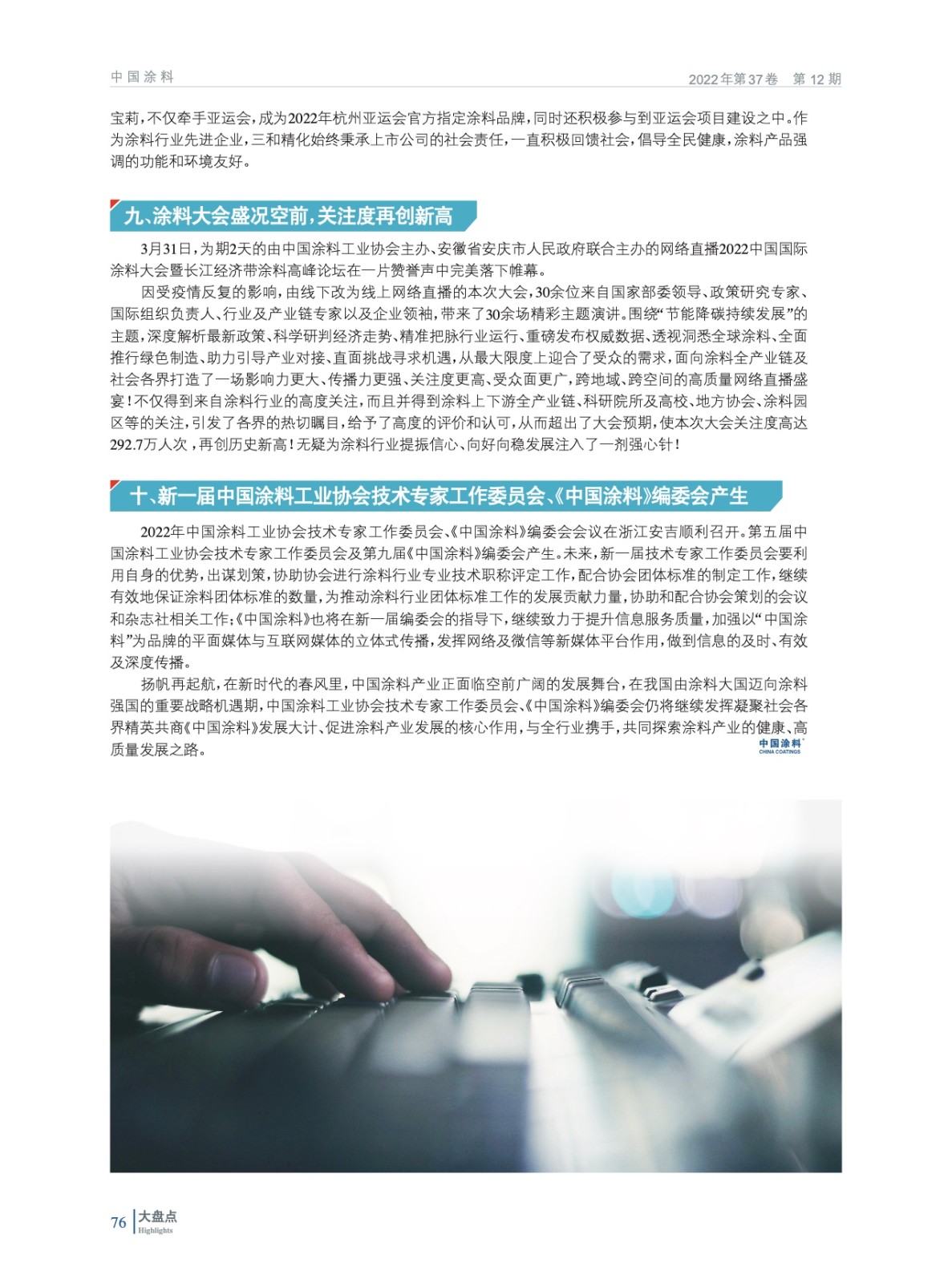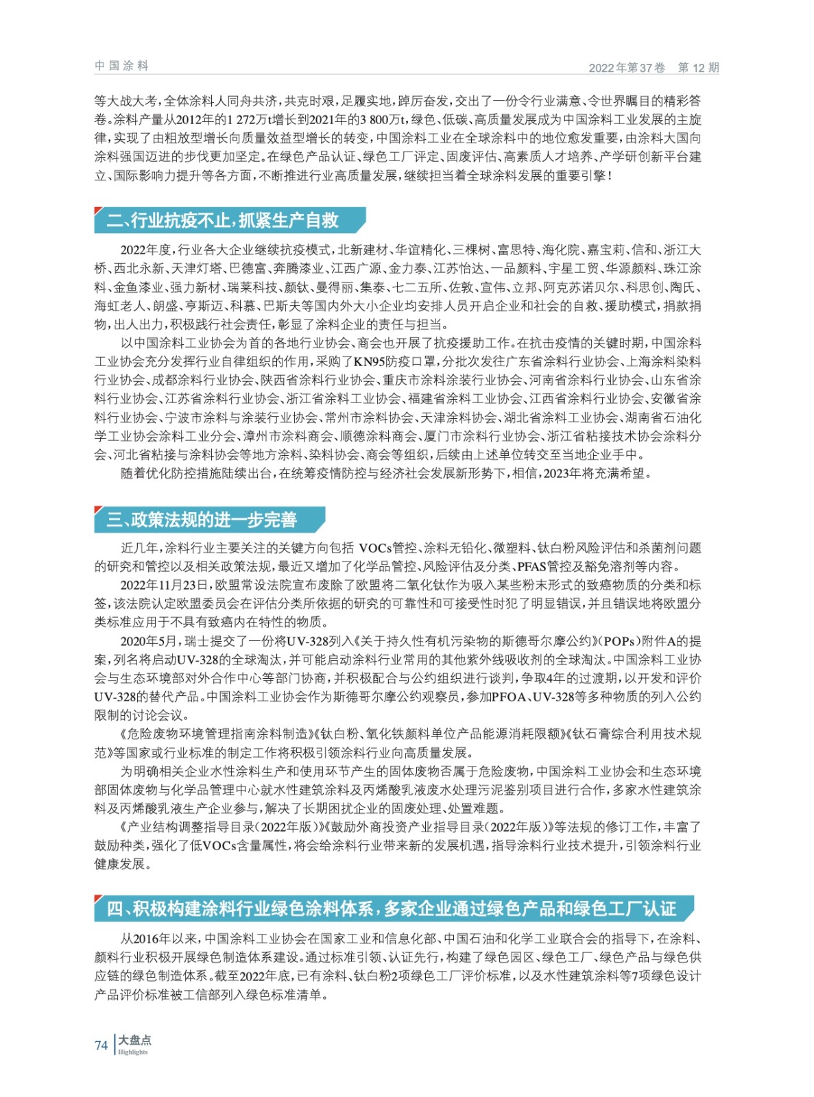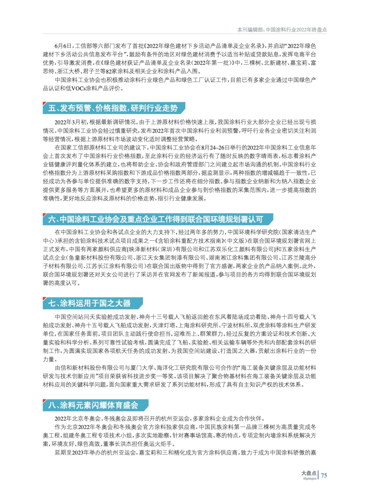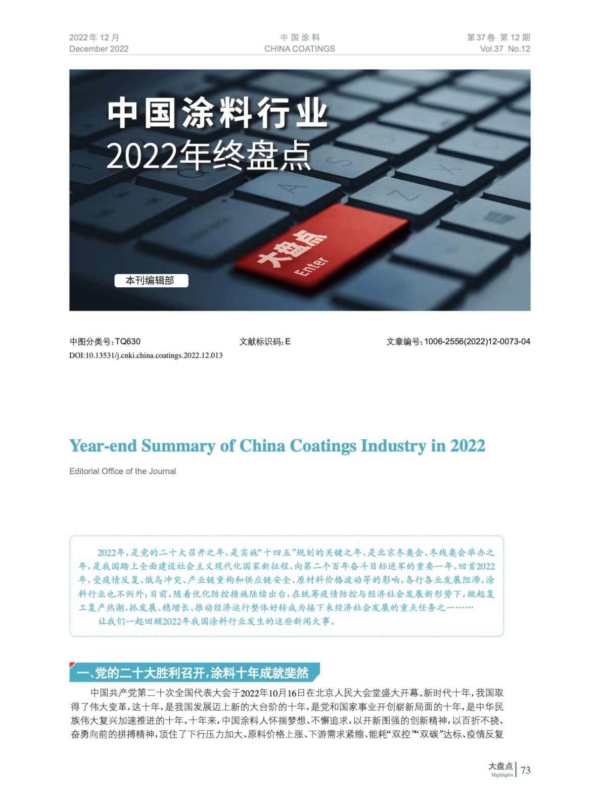 摘要:編者按:回首2022年,受疫情反復(fù)、俄烏沖突、產(chǎn)業(yè)鏈重構(gòu)和供應(yīng)鏈安全、原材料價格波動等的影響,各行各業(yè)發(fā)展阻滯,涂料行業(yè)也不例外;目前,隨著優(yōu)化防控措施陸續(xù)出臺,在統(tǒng)籌疫情防控與經(jīng)濟社會發(fā)展新形勢下,掀起復(fù)工復(fù)產(chǎn)熱潮,抓發(fā)展、穩(wěn)增長、推動經(jīng)濟運行整體好轉(zhuǎn)成為接下來經(jīng)濟社會發(fā)展的重點任務(wù)之一……讓我們一起回顧2022年我國涂料行業(yè)發(fā)生的這些新聞大事。