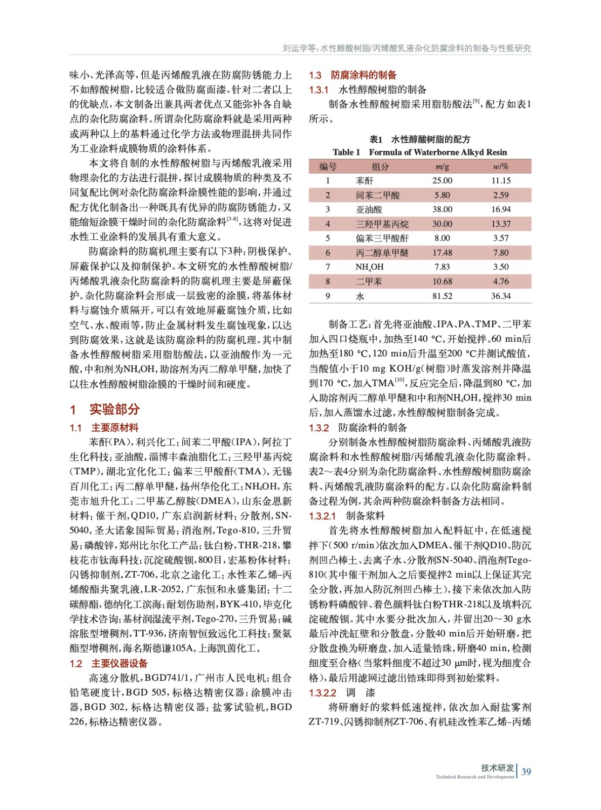 水性醇酸樹脂/丙烯酸乳液雜化防腐涂料的制備與性能研究