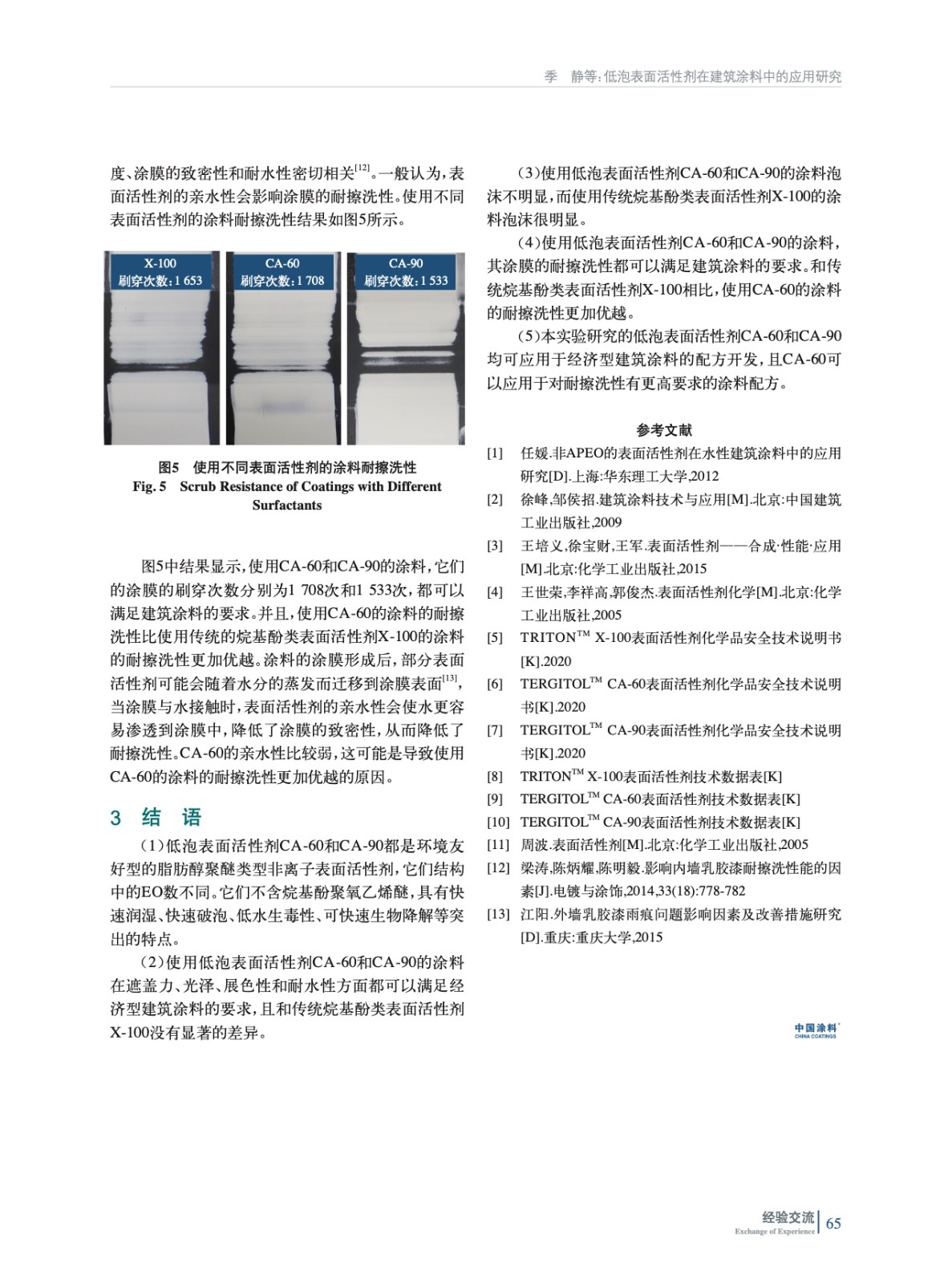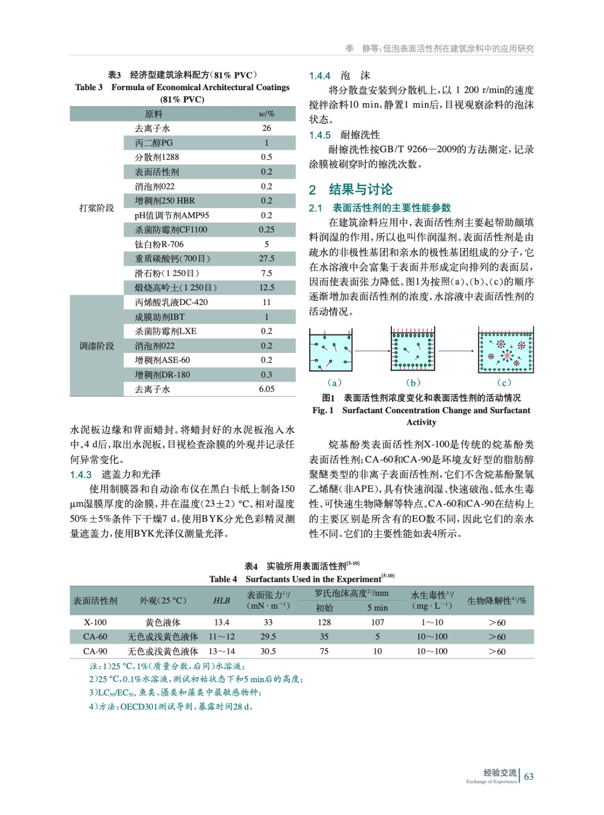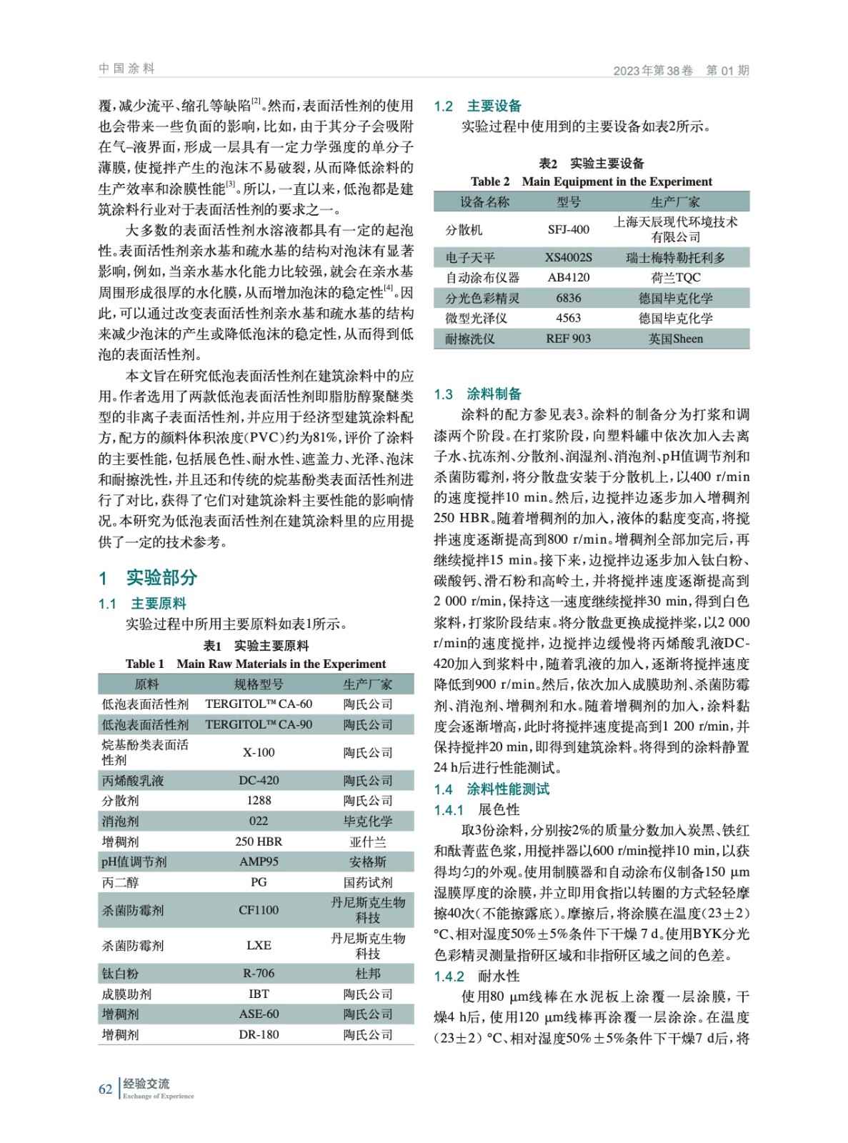 摘要:研究了低泡表面活性劑在經濟型建筑涂料中的應用。將低泡表面活性劑應用于涂料配方中,測試了涂料的展色性、耐水性、遮蓋力、光澤、泡沫和耐擦洗性,并和傳統的烷基酚類表面活性劑X-100進行了對比。使用低泡表面活性劑的涂料在遮蓋力、光澤、展色性和耐水性方面都可以滿足經濟型建筑涂料的要求,且和傳統烷基酚類表面活性劑相比沒有明顯的差異;使用低泡表面活性劑的涂料泡沫不明顯,但使用傳統烷基酚類表面活性劑會導致明顯的涂料泡沫;使用低泡表面活性劑的涂料,其涂膜的耐擦洗性都可以滿足建筑涂料的要求。本實驗研究的低泡表面活性劑都是環境友好型的非離子表面活性劑,均可應用于經濟型建筑涂料的配方開發。