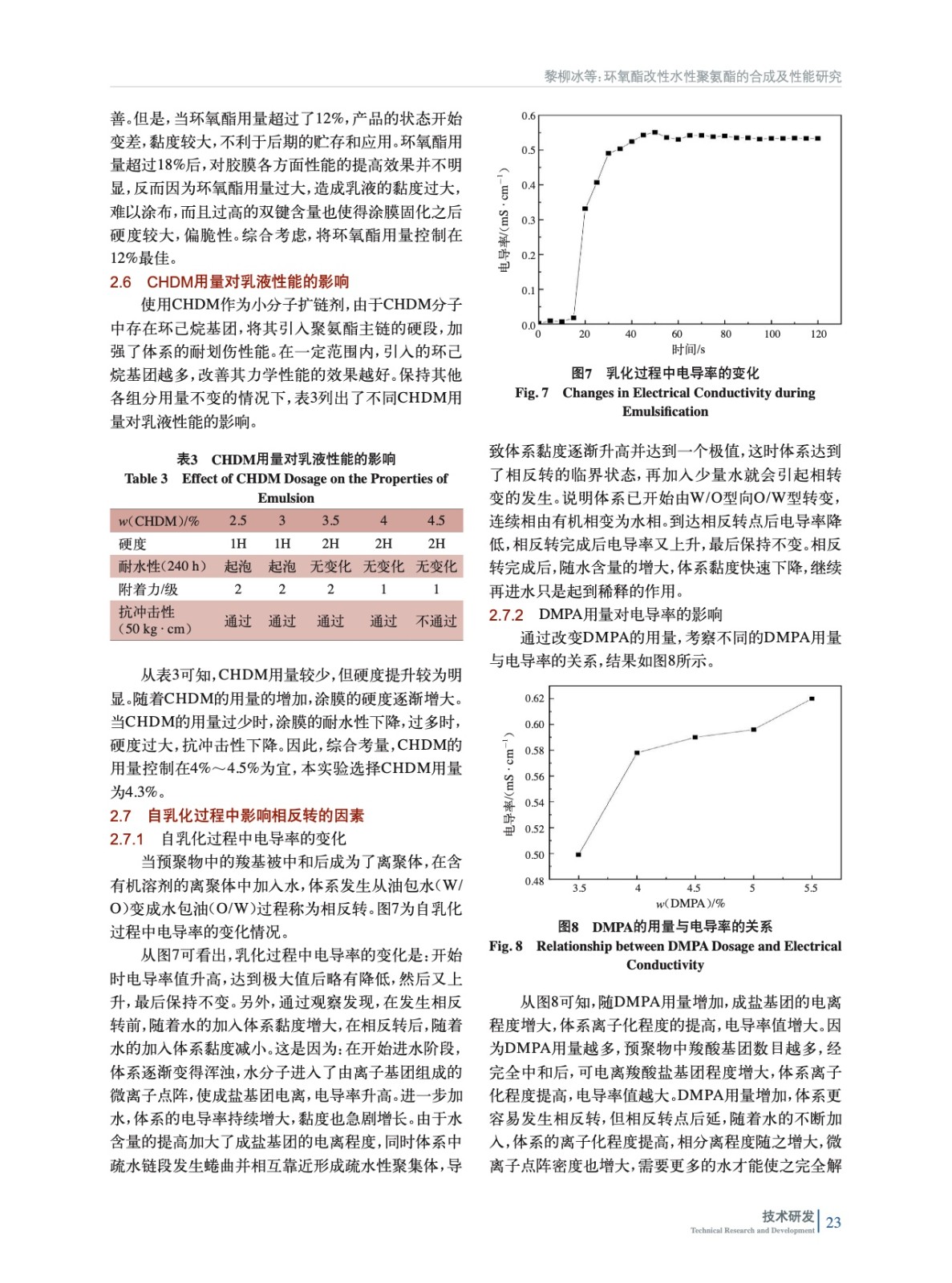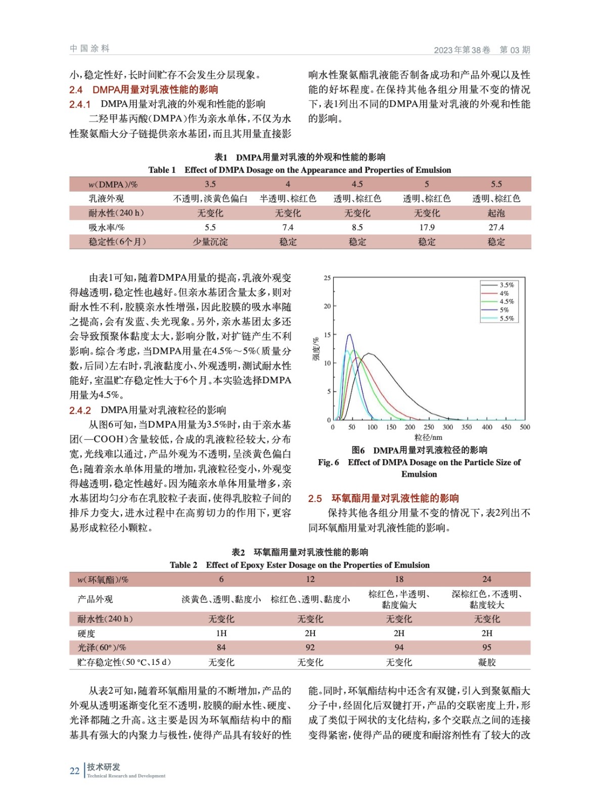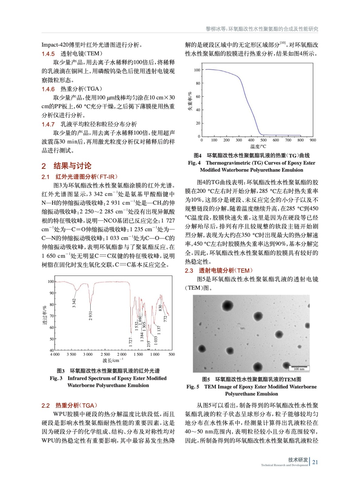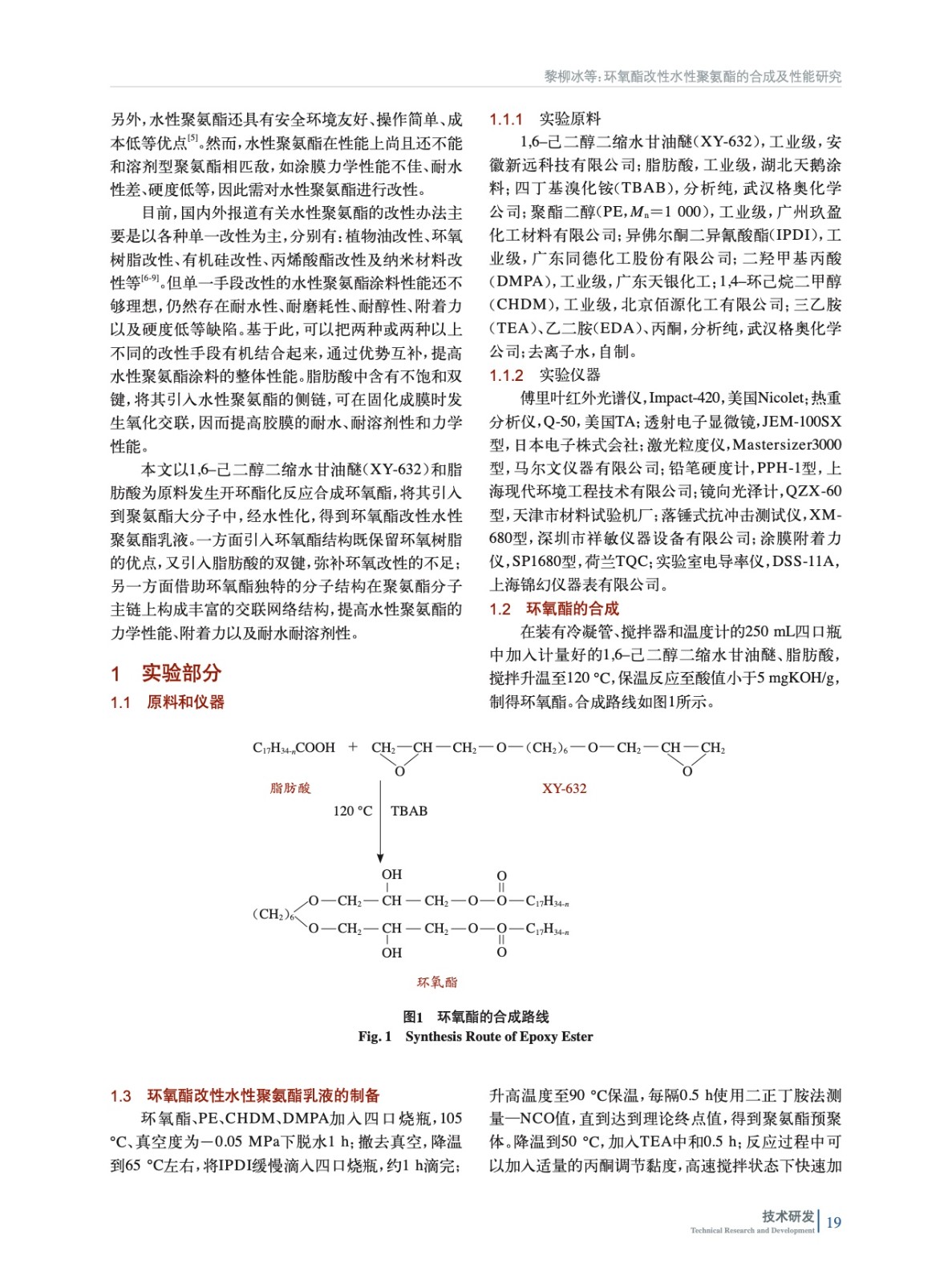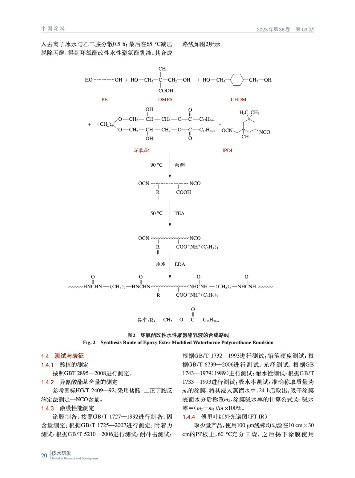 摘要:以1,6–己二醇二縮水甘油醚(XY-632)和脂肪酸為原料合成環氧酯,再以此原料作為改性單體,制備得到環氧酯改性水性聚氨酯。利用傅里葉變換紅外光譜(FT-IR)、透射電鏡(TEM)、熱重分析(TGA)和激光粒度分析儀對產品及涂膜進行測試及表征;研究了二羥甲基丙酸(DMPA)、環氧酯、1,4–環己烷二甲醇(CHDM)的用量及中和度對產品的狀態和性能的影響。同時,考察了自乳化過程、DMPA的用量和中和度對電導率的影響。結果表明:通過在聚氨酯分子中引入環氧酯結構,所制得的乳液穩定性好,且涂膜具有優異的耐水性、附著力、硬度等性能。